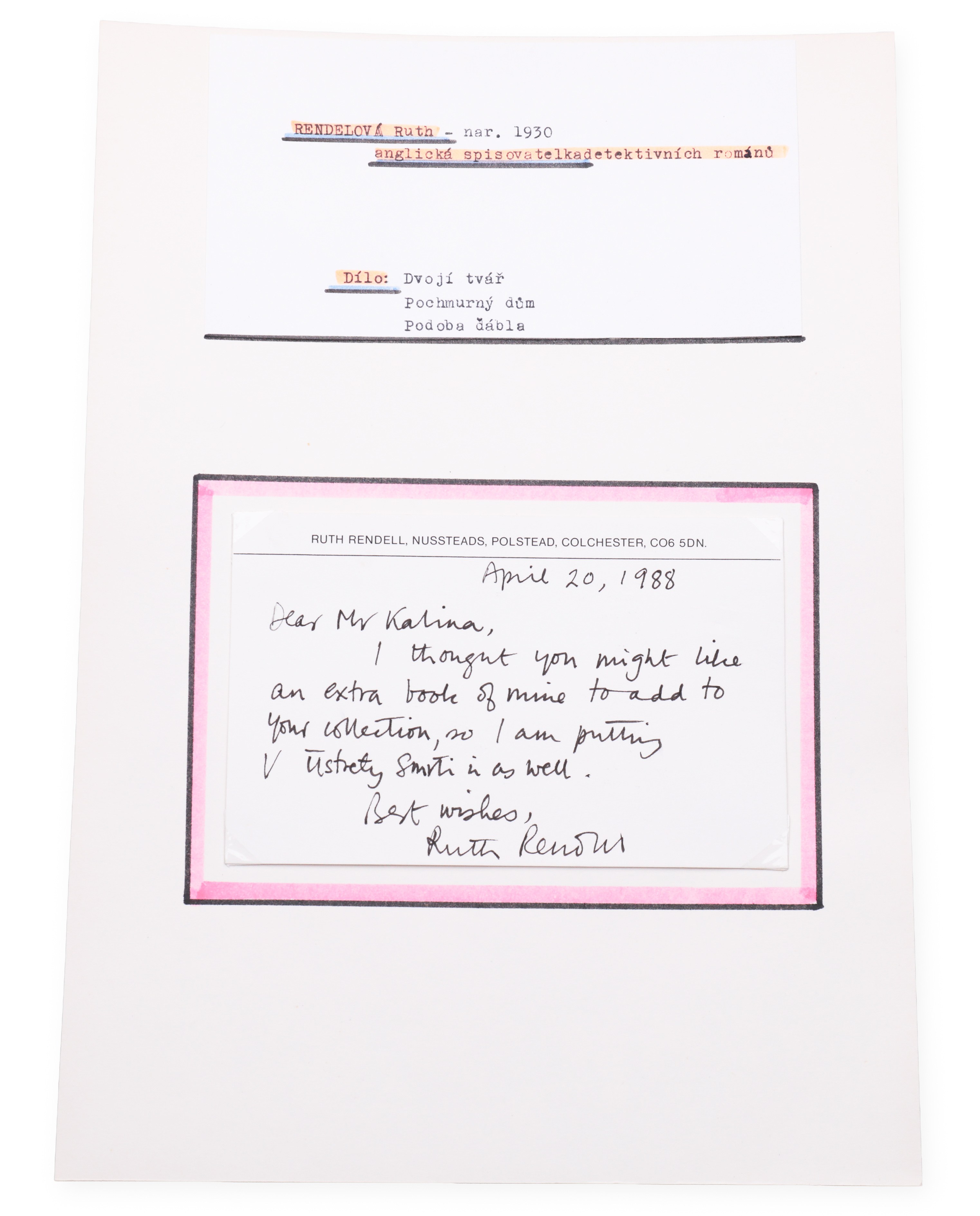 Signature with a handwritten note by Ruth Rendel on a sheet dated April 20, 1988, placed on a collector's sheet. Ruth Rendell was a British writer, considered one of the most important authors of detective and psychological prose of the 20th century. She became famous for the series with Inspector Wexford as well as independent novels, often published under the pseudonym "Barbara Vine". Her handwritten note with signature is a valuable collector's item associated with a legend of modern British crime fiction.Bidders are obliged to inform themselves about the condition of the lots before the auction, subsequent complaints will not be taken into account.