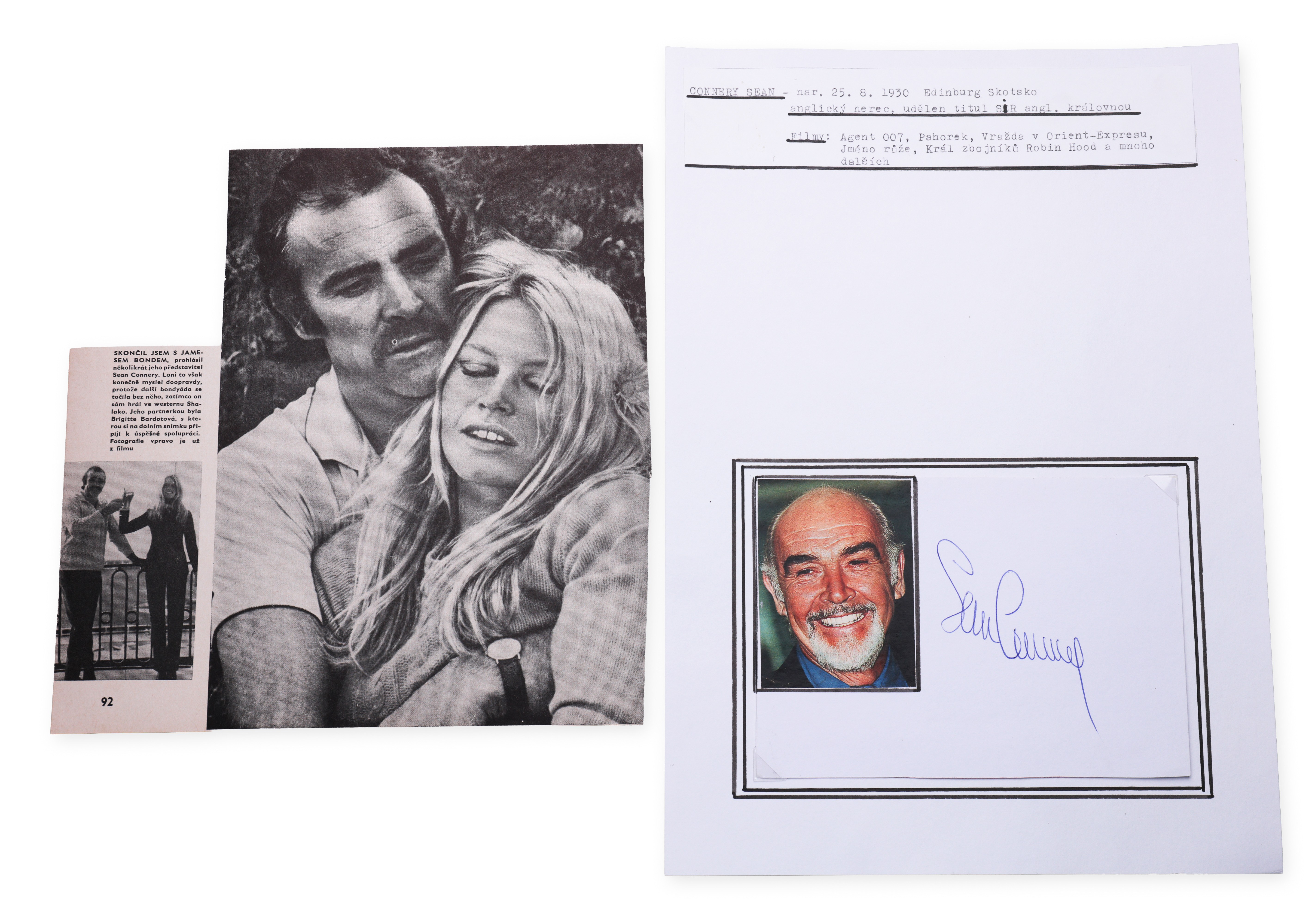 Sean Connery's signature on a photo pasted card, placed on a collector's sheet. Sir Sean Connery was a Scottish actor, most famous as the first representative of James Bond in the film series about the famous agent "007". His charismatic acting and unmistakable voice ensured him worldwide popularity. This autograph represents an extremely valuable collector's artifact associated with a legend of world cinema.Bidders are obliged to inform themselves about the condition of the lots before the auction, subsequent complaints will not be taken into account.