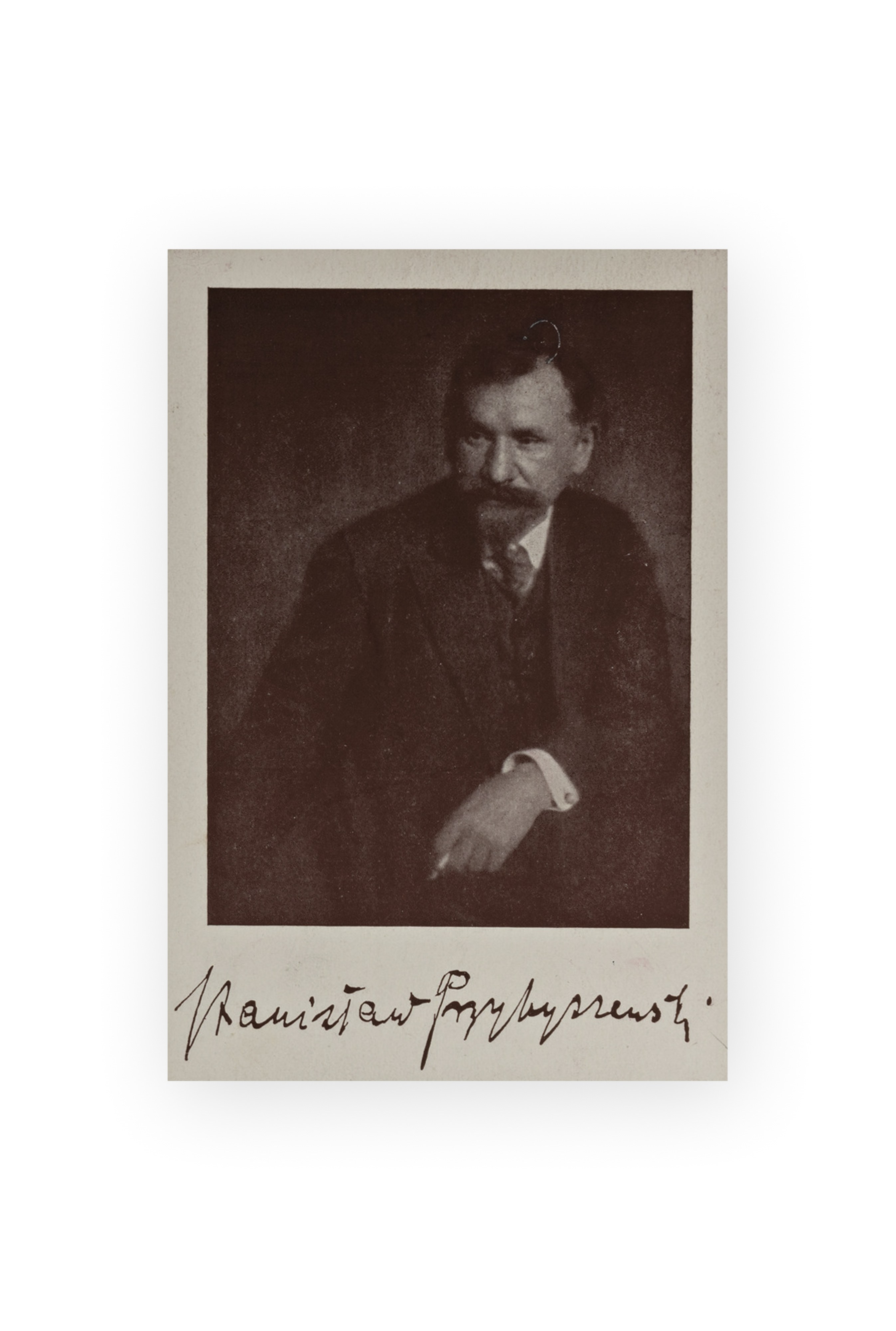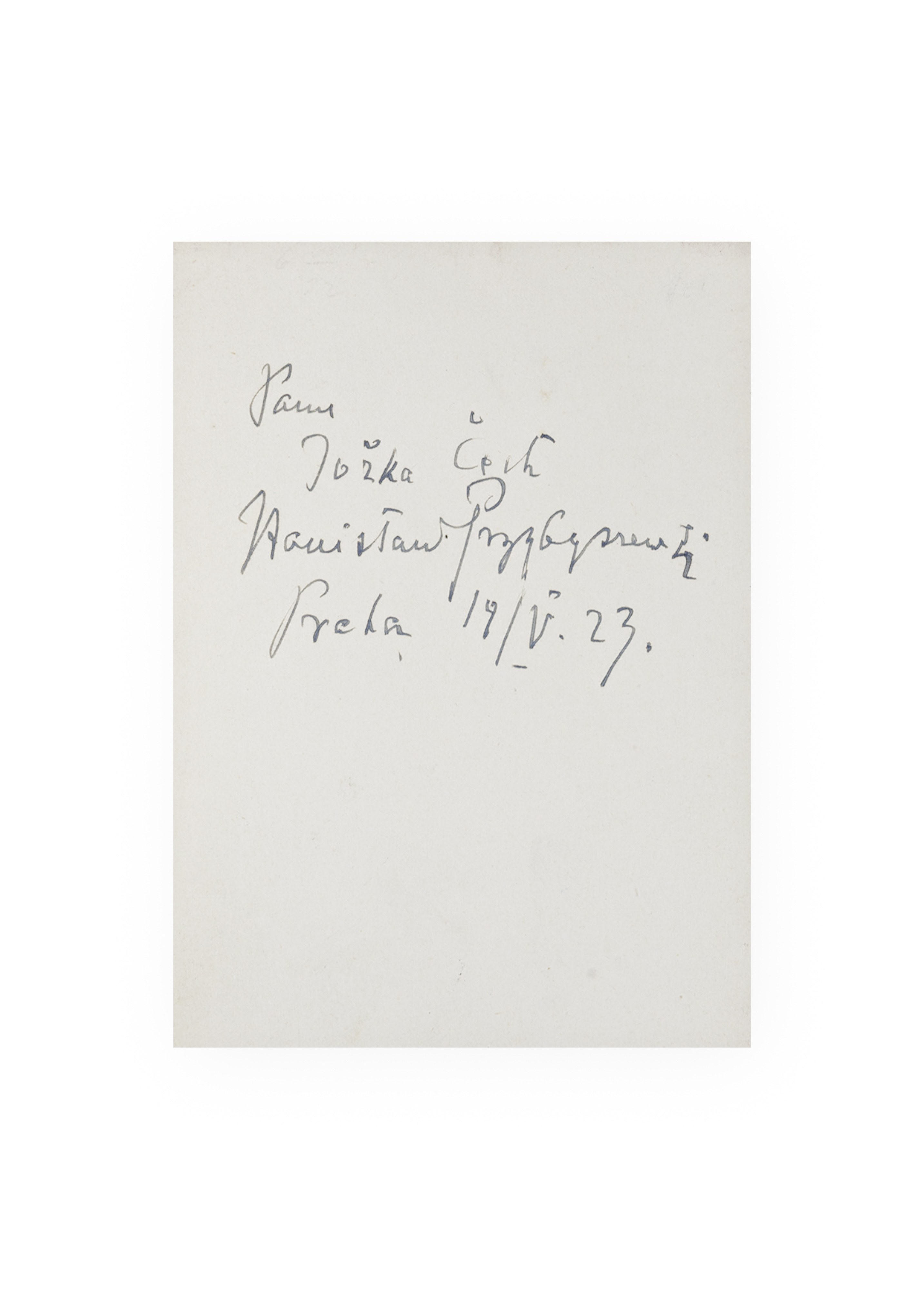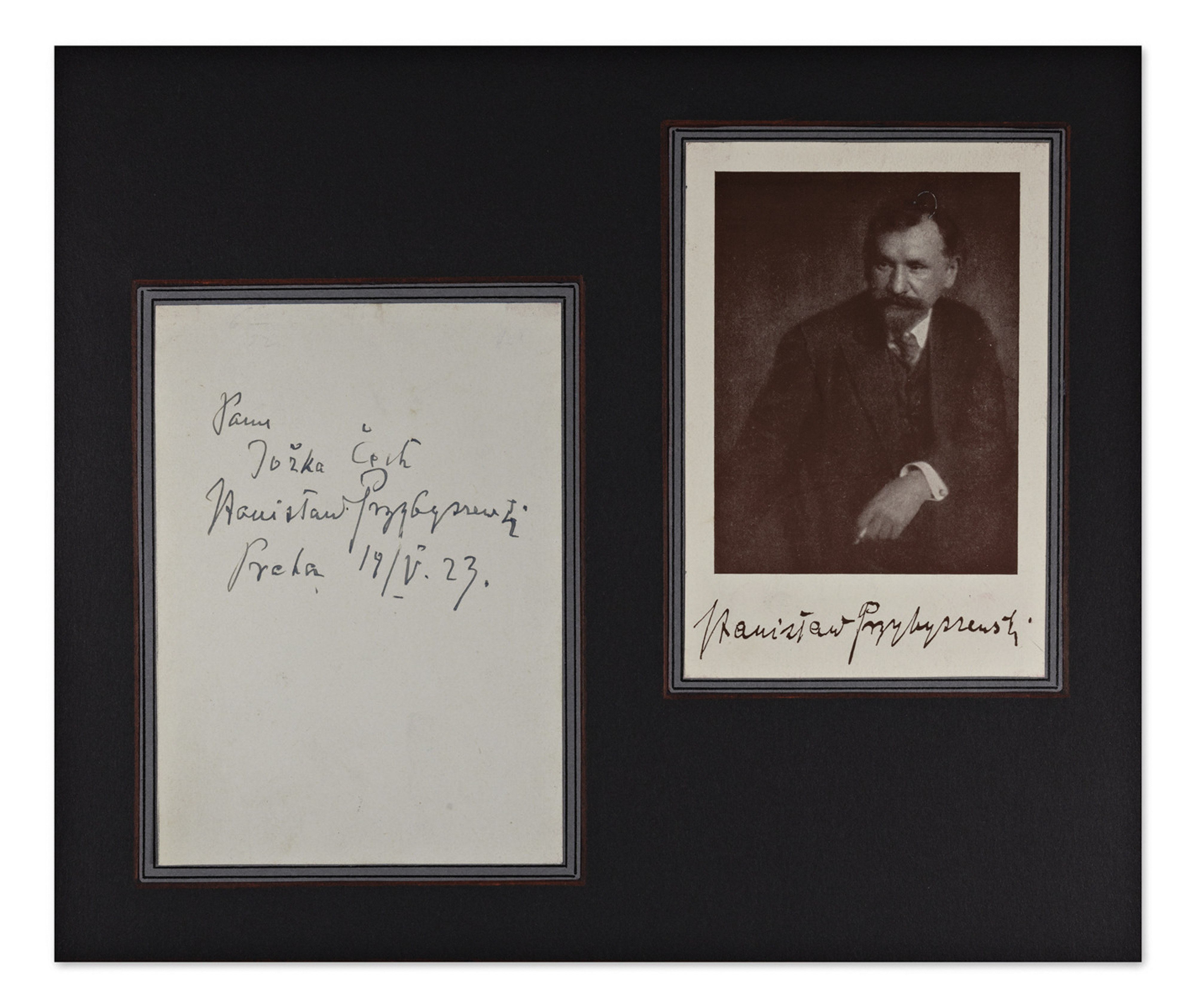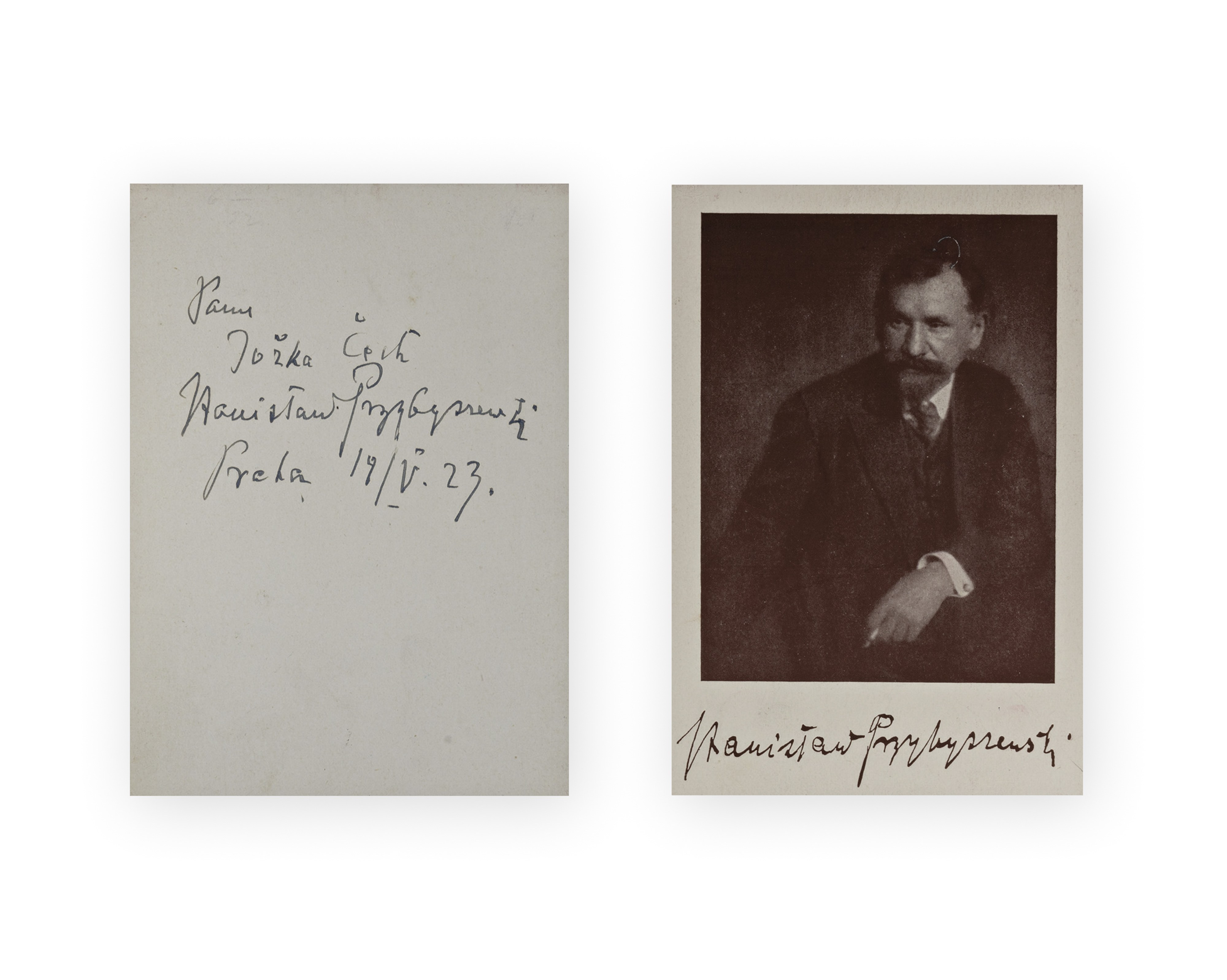 Dedication signed by Polish writer and playwright Stanisław Feliks Przybyszewski from 1923. A prominent figure of European decadence, known for his symbolist and mystical work, he influenced the literary environment in Germany, Poland and Bohemia. In 1923, already at the peak of his work, he was perceived as a cult author of dark, introspective prose and drama. His dedication bears traces of a distinctive style – exalted, philosophical and deeply subjective. A set containing the handwritten signature and dedication of the Polish writer, playwright and poet Stanisław Feliks Przybyszewski, an important representative of decadence and modernism. The signature with the dedication addressed to Mr. Čech comes from Prague and is dated April 19, 1923.The set also includes a reproduction of a portrait photograph of the author with another printed signature, edited in monochrome tones. Przybyszewski was one of the key figures in the European literary movement of the late 19th and early 20th centuries, known for his fascination with mysticism and the psychology of the dark side of the human soul.