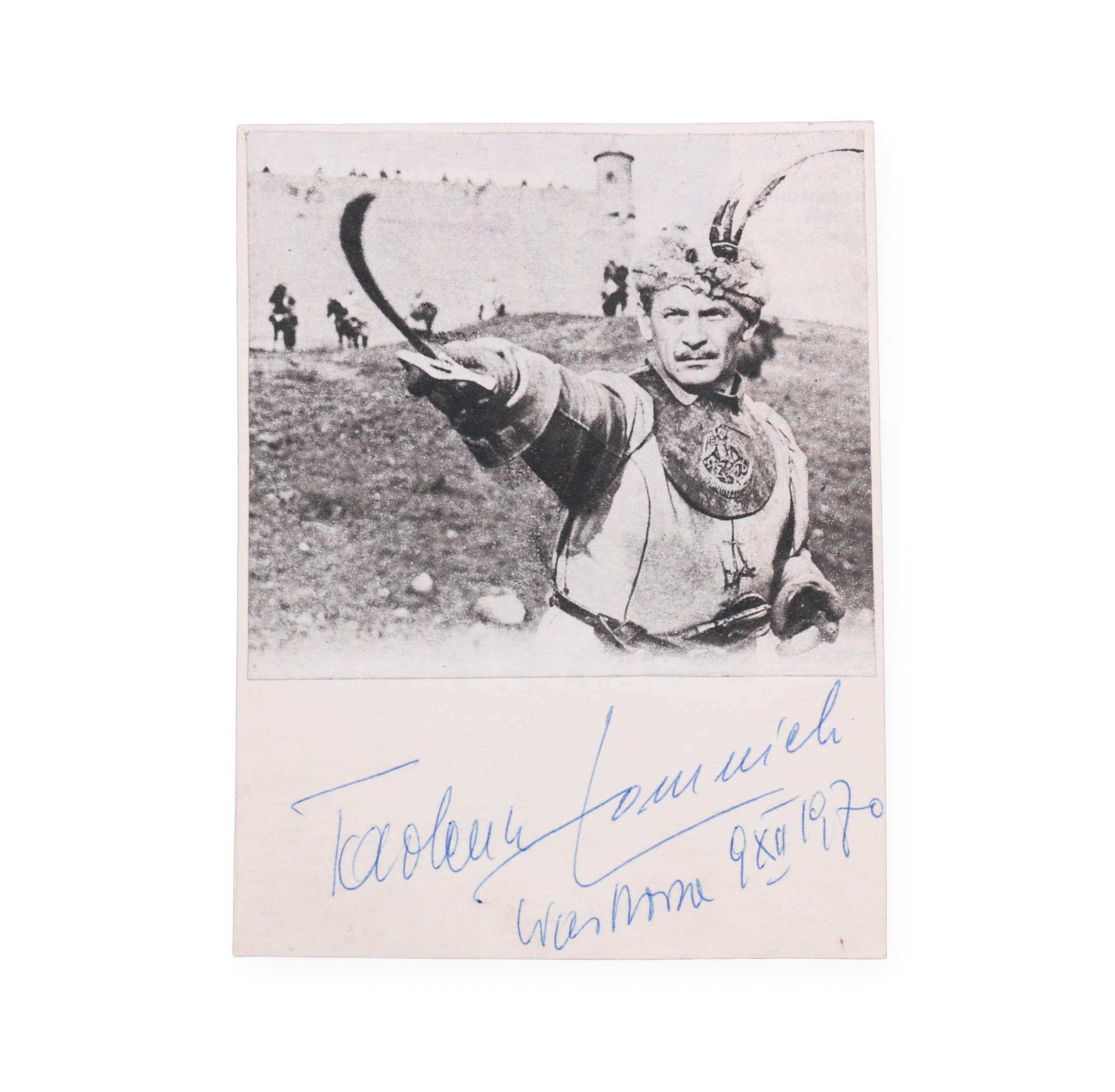 Signature of the Polish actor Tadeusz Łomnický with his full name on his portrait photograph dated December 9, 1970. A prominent figure in Polish theater and film, he was renowned for his extraordinary acting intensity, intellectual depth and mastery of expression. He was one of the founders of Teatr Współczesnego in Warsaw and played iconic roles both on stage and in film — for example in the film "Popiół i diament". A signed photograph from this period captures the artist at the height of his creative career.Bidders are obliged to inform themselves about the condition of the lots before the auction, subsequent complaints will not be taken into account.