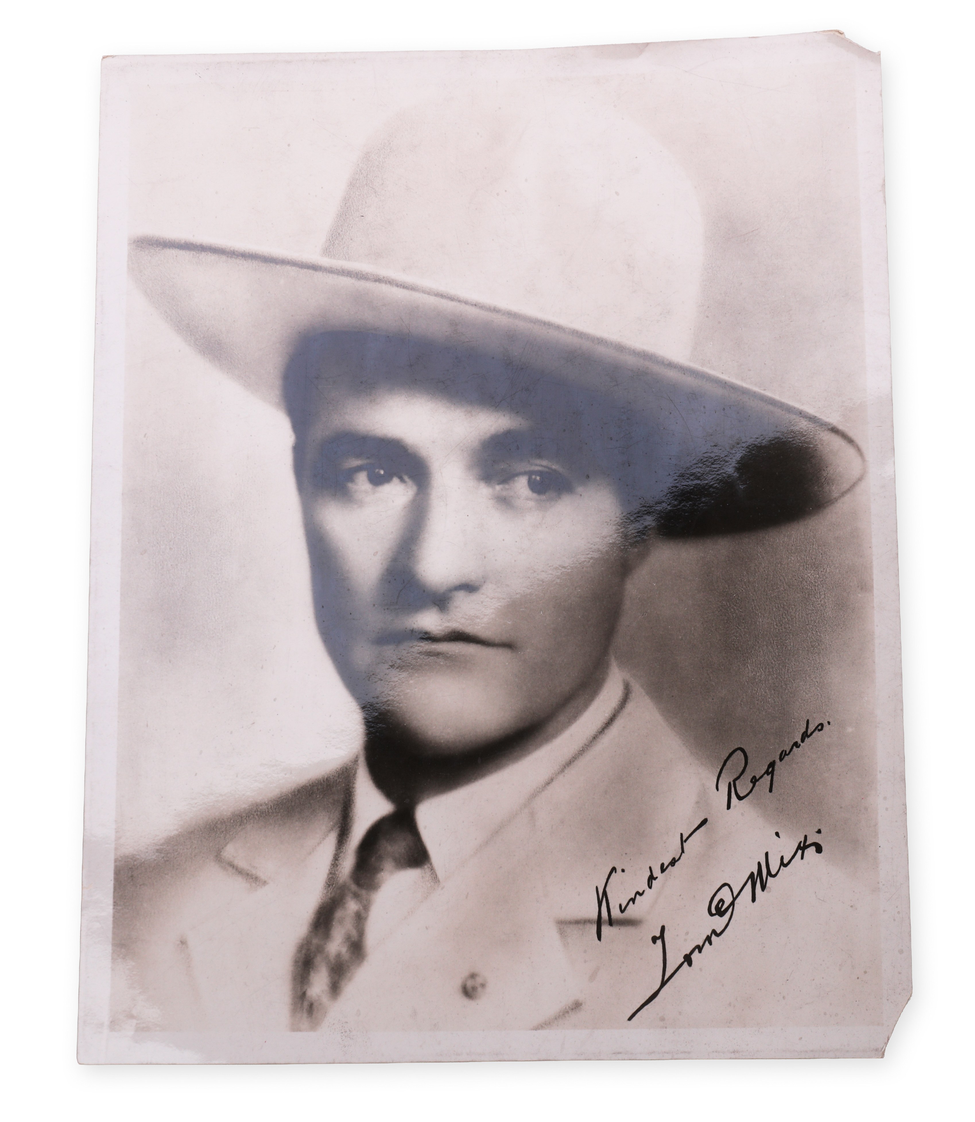 A soft retouched light studio portrait of American film actor Tom Mix depicts the legend of the silent western in a typical white suit, tie and wide-brimmed cowboy hat. In the lower right corner is a handwritten signature with the dedication: "Kindest Regards, Tom Mix". Tom Mix (1880 – 1940) was an iconic figure of early American cinema and the epitome of the Hollywood cowboy whose name became synonymous with the western adventure genre.Bidders are obliged to inform themselves about the condition of the lots before the auction, subsequent complaints will not be taken into account.