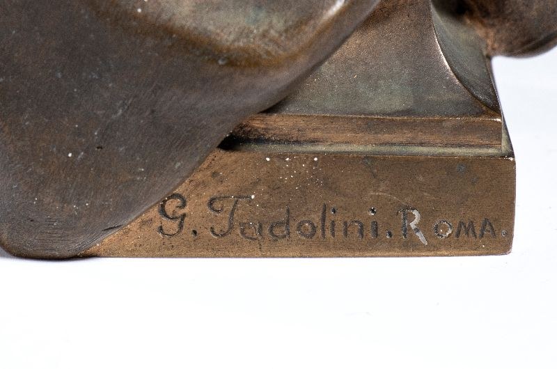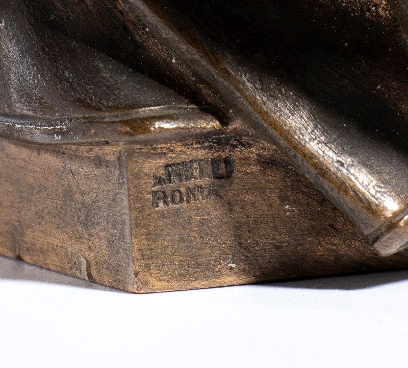 Bronze bust of King Umberto I of Savoy (Umberto Rainerio Carlo Vittorio Emanuele Giovanni Maria Ferdinando Eugenio of Savoy; Turin, March 14, 1844 – Monza, July 29, 1900). An important late 19th-century bronze sculpture created and signed by Giulio Tadolini (Rome, October 22, 1849 – Rome, April 18, 1918). Produced by the NELLI foundry (active in the late 19th- and early 20th-century medal sector). It measures approximately 23 cm in height and is in perfect condition.
