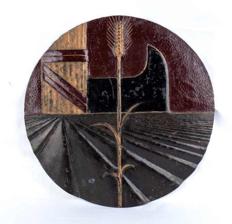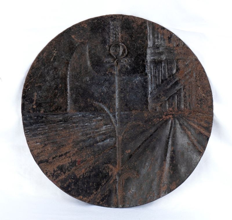 Circular metal plaque worked in relief, celebrating the reclamation works and the Battle of the Wheat of the twenty years of fascism. Painted in burgundy red, brown, black and golden yellow colors. Original from the 1930s, very interesting, with hook for wall display, measuring approximately 34 cm in diameter