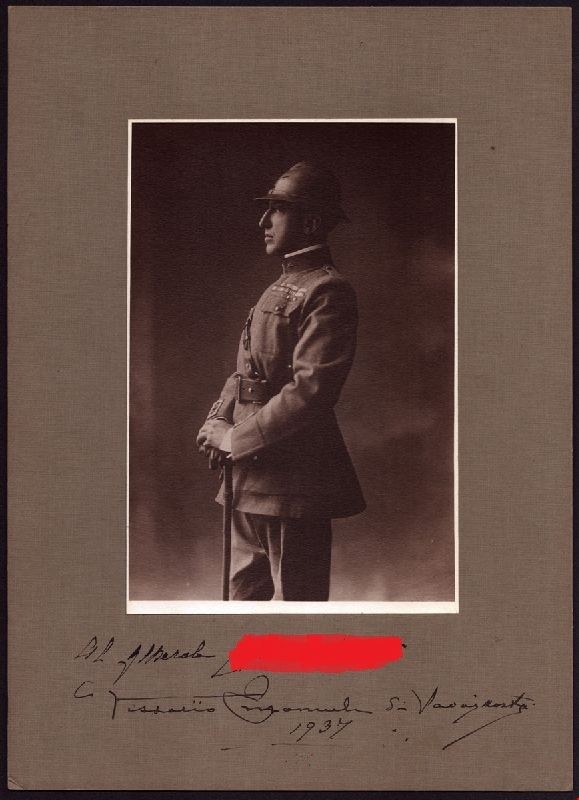 Black and white photograph of Victor Emmanuel of Savoy Aosta (Vittorio Emanuele Torino Giovanni Maria di Savoia, Count of Turin - Turin, November 24, 1870 – Brussels, October 10, 1946) in the uniform of a General of the Royal Italian Army during World War I. Photo with dedication and autograph in black ink, dated 1937.The photo is mounted on cardboard, measures approximately 26 x 35 cm, in excellent condition.Name only digitally hidden for privacy.(The photograph can be accompanied by a COA upon request, for a fee)