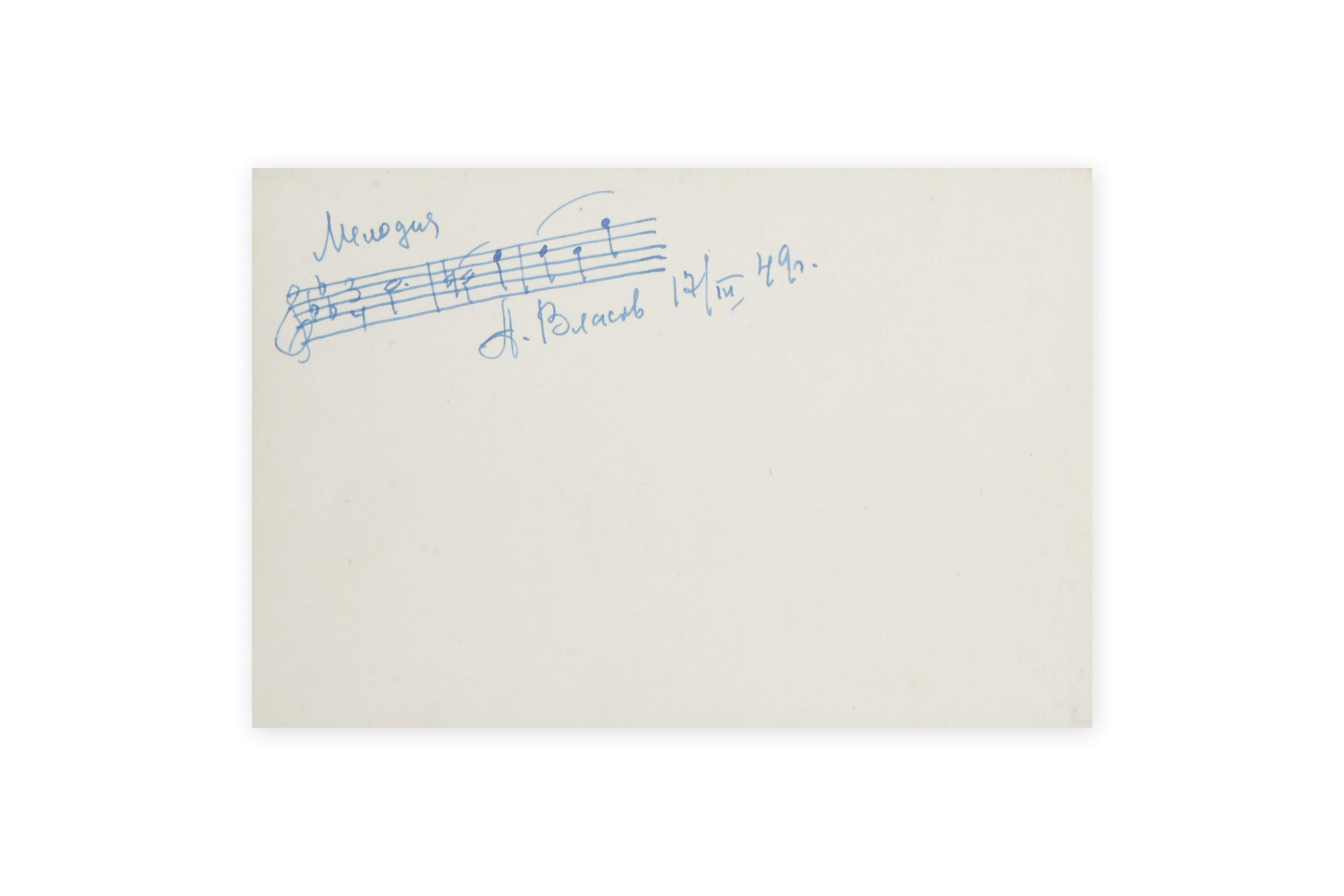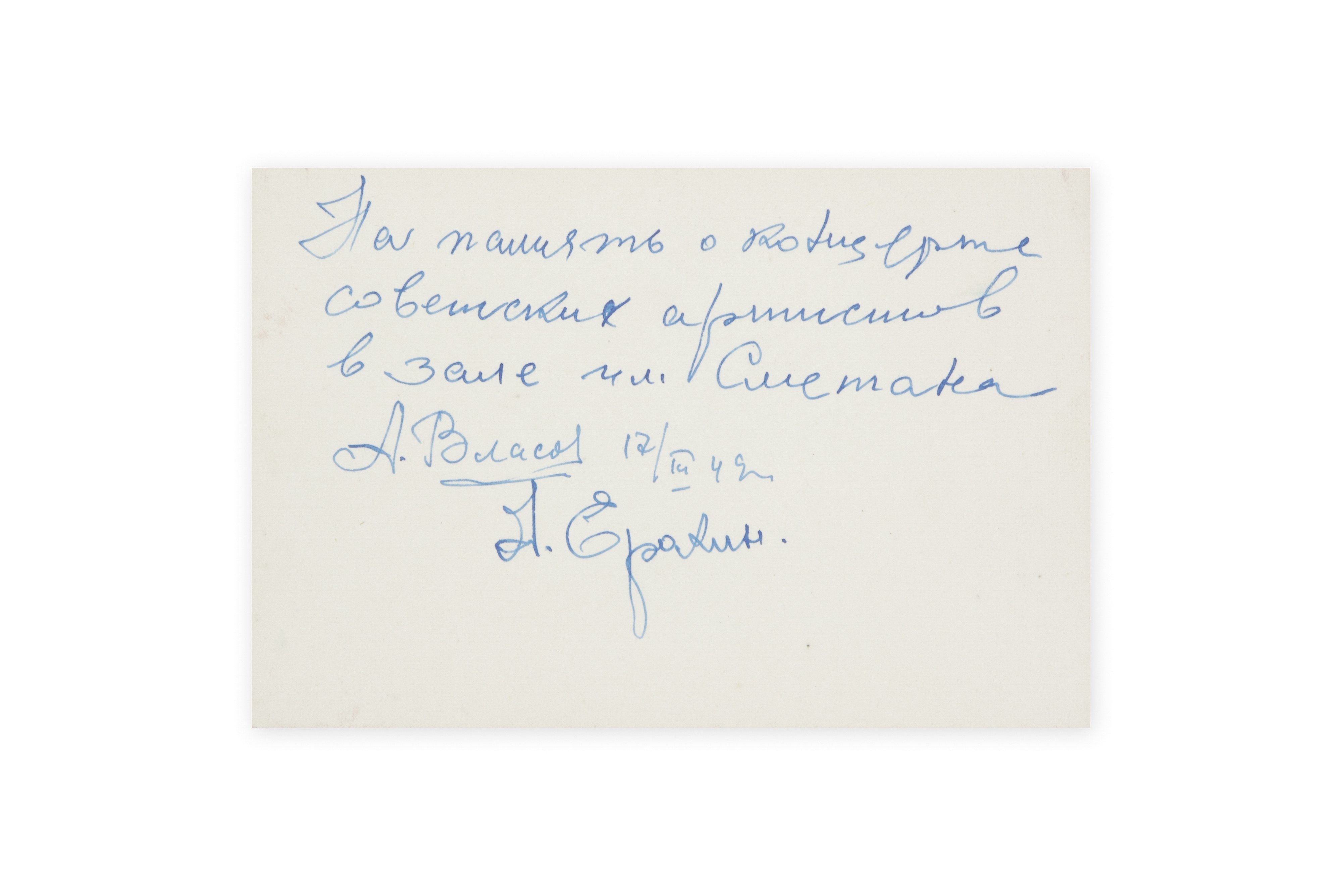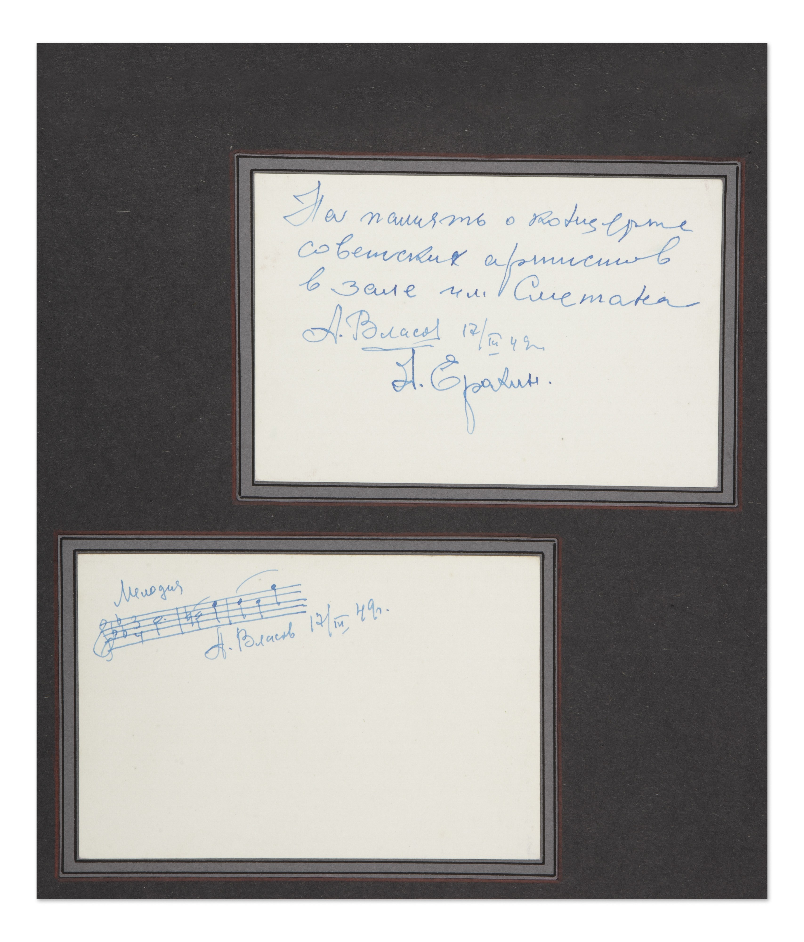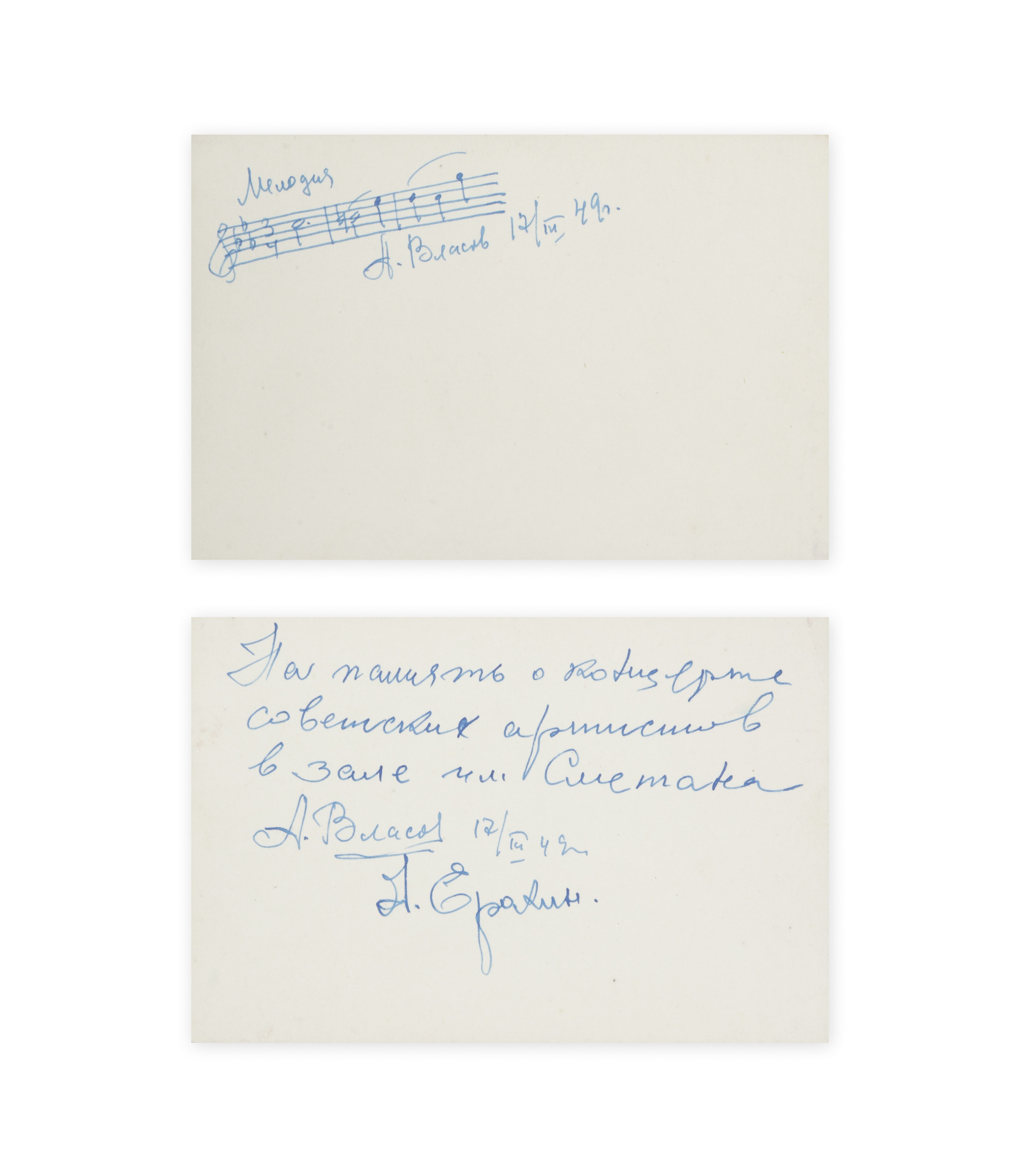 A unique set of two autographs, one of which contains sheet music, from the prominent Soviet composer Vladimir Vlasov, known especially for his operatic and orchestral works.Bidders are obliged to inform themselves about the condition of the lots before the auction, subsequent complaints will not be taken into account.