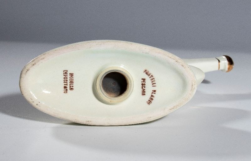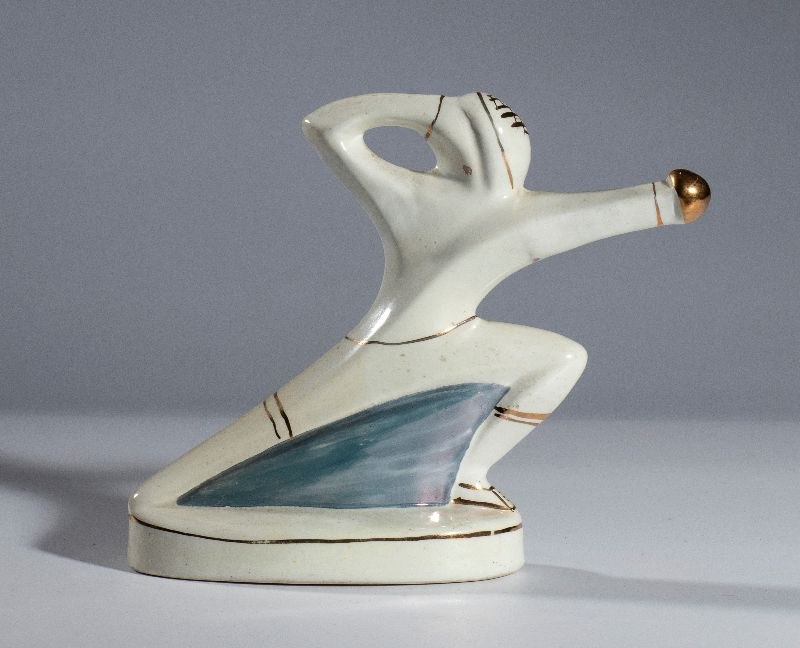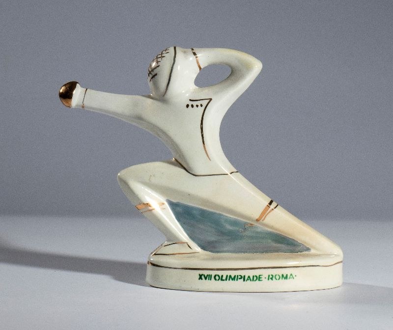 Promotional item from the 1960 Rome Olympics, miniature liqueur, polychrome ceramic sculpture depicting an Olympic fencing athlete. Marked FRATELLI VLAHOV - PESCARA - REGISTERED MODEL. In perfect condition, measures approximately 13 x 15 cm.