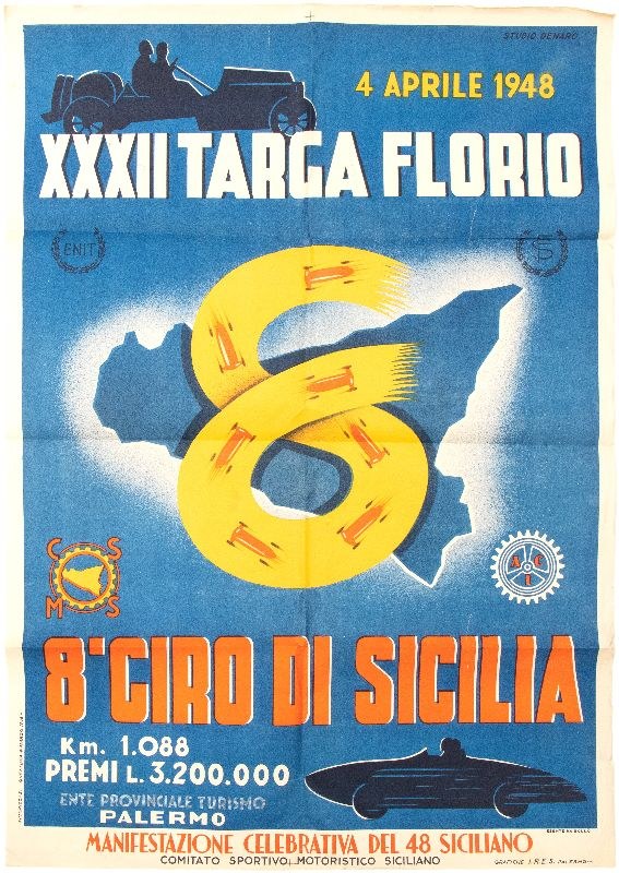 Poster / billboard - lithograph on paper, for the 32nd Edition of the TARGA FLORIO of April 4, 1948 - 8th TOUR OF SICILY over a 1,088 km route with prizes worth 3,200,000 lire - PALERMO Provincial Tourism Board. Poster published and signed by STUDIO DENARO, Grafiche IRES Palermo, campaign sponsored by ENIT, FS, ACI and CSMS. Storage creases, minor marks on the upper right edge, in excellent condition, measures approximately 70 x 100 cm.