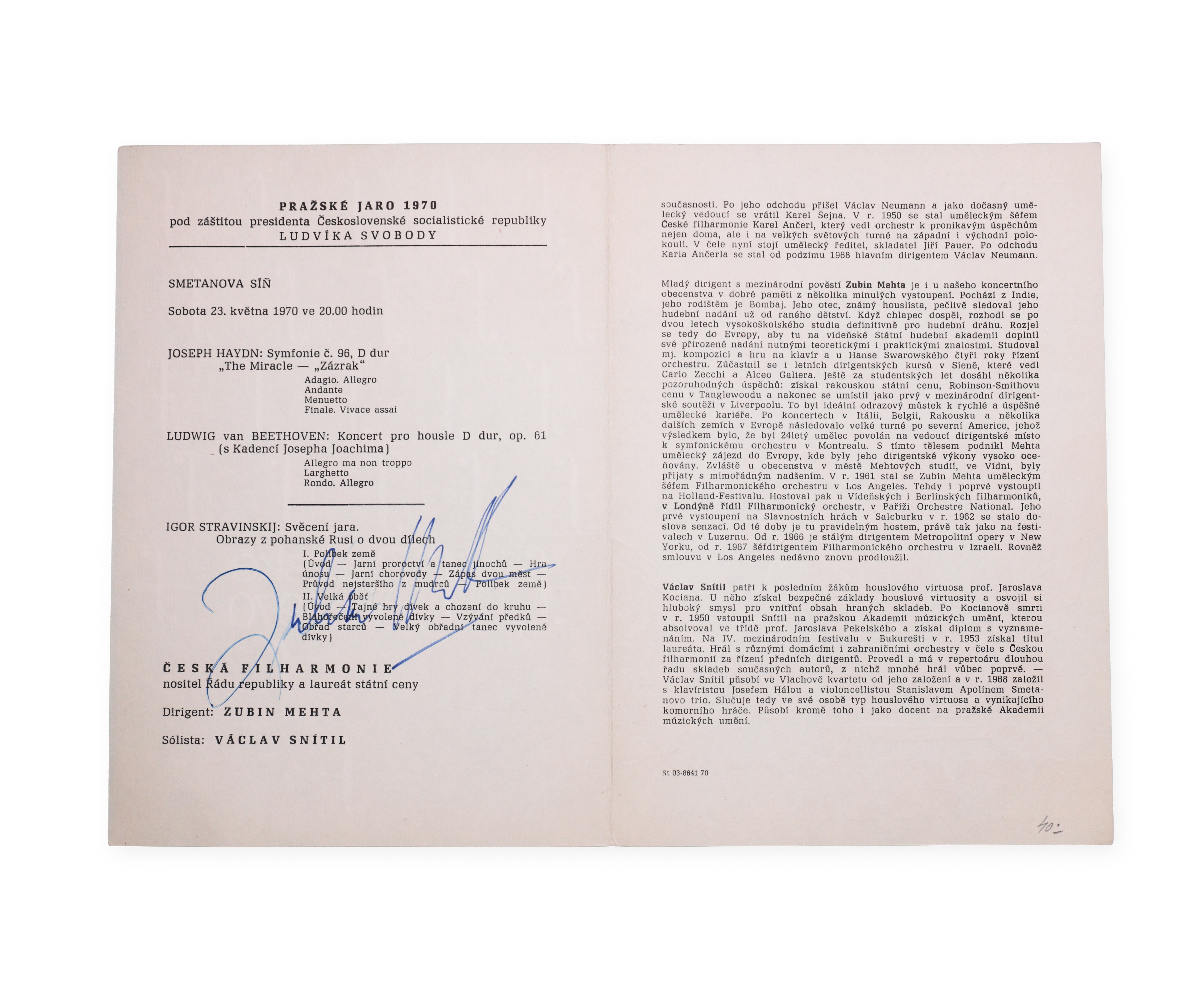Prague Spring program from 1970 with the handwritten signature of the famous conductor Zubin Mehta inside. This commemorative piece contains not only the program content of the festival, but also a valuable autograph of one of the most important conductors of the 20th and 21st centuries. Zubin Mehta, an Indian conductor with worldwide renown, became famous for his spirited and precise musical interpretation and long-term work with important orchestras such as the Israel Philharmonic, the New York Philharmonic and the Vienna State Opera. He is known for his extraordinary talent, charisma and ability to connect cultures through music. His signature in the program of a major music festival thus represents a unique collector's artifact.Bidders are obliged to inform themselves about the condition of the lots before the auction, subsequent complaints will not be taken into account.