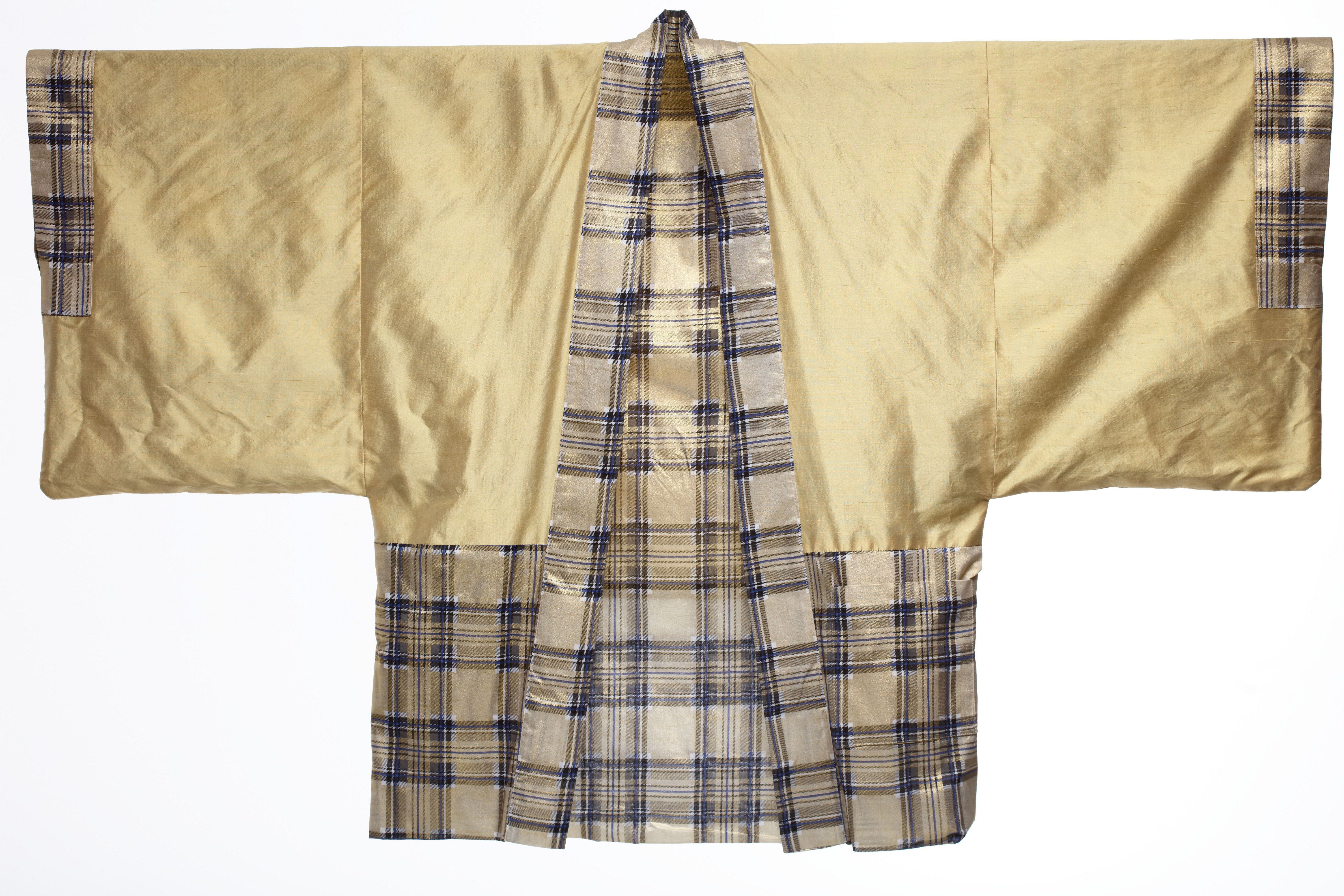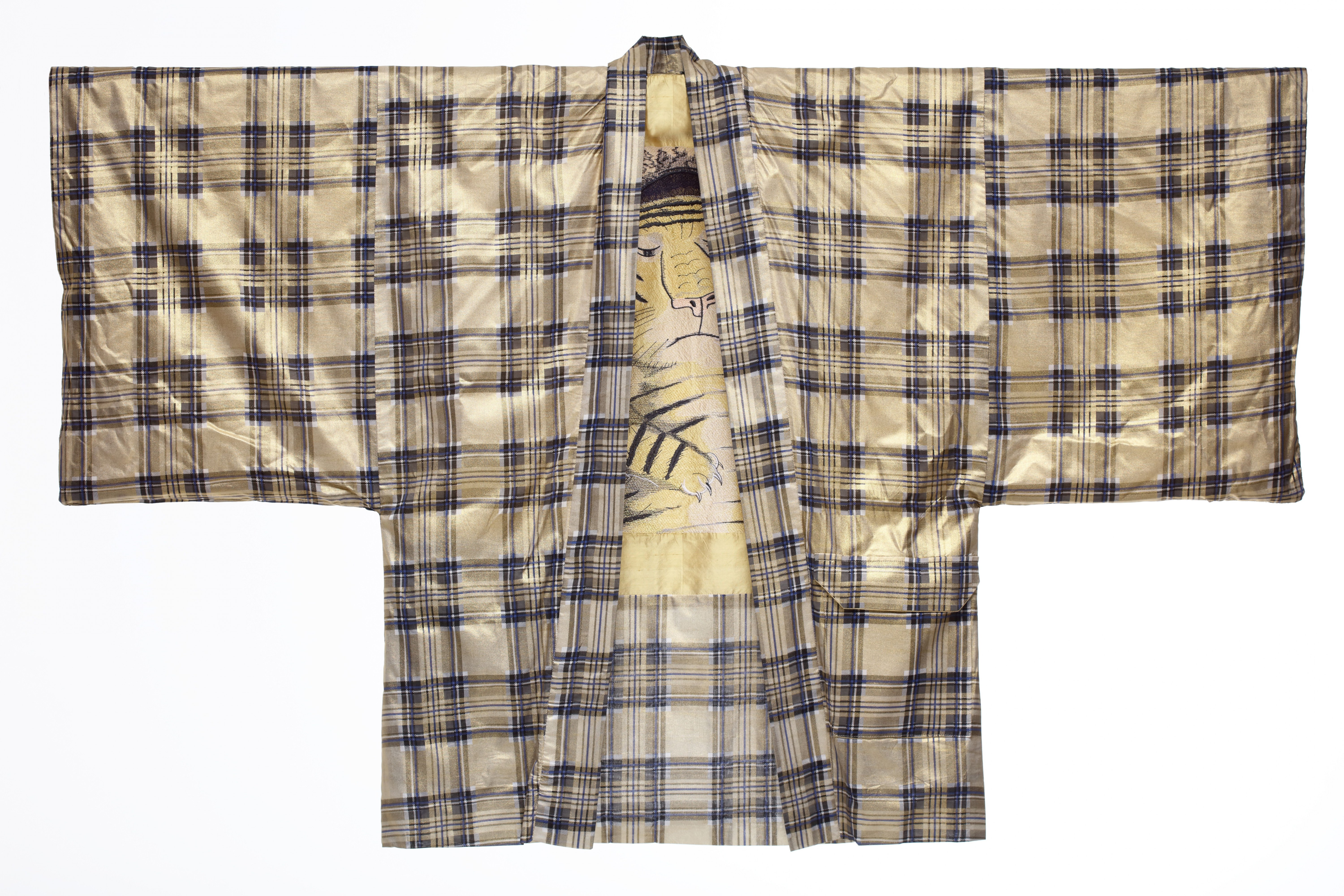Jedwabne dwustronne art hour kimono, z kieszonką ( po obu stronach ), w uniwersalnym, jednym rozmiarze ( dla 160 do 190 cm wzrostu, sylwetka S, M, L i XL ), strona gładka jedwabna ozdobny autorski haft "Tygrysek" inspirowany rysunkiem Józefa Wilkonia ( licencja Mistrza ) wykonany na jednej ze stron na złotym jedwabiu ( szantung ), z drugiej strony włoski materiał jedwabio-wiskoza w kratkę; obie strony posiadają kieszonkę ( z obszyciami ) po lewej stronie ( model to limitowana kolekcja ); Długość art hour kimona 90 cm, yukiteke ( dł. rękawa 34,5 ), sodetake ( szer. rękawa 50 cm ), szerokość pleców, od rękawa do rękawa ( 70 cm ),