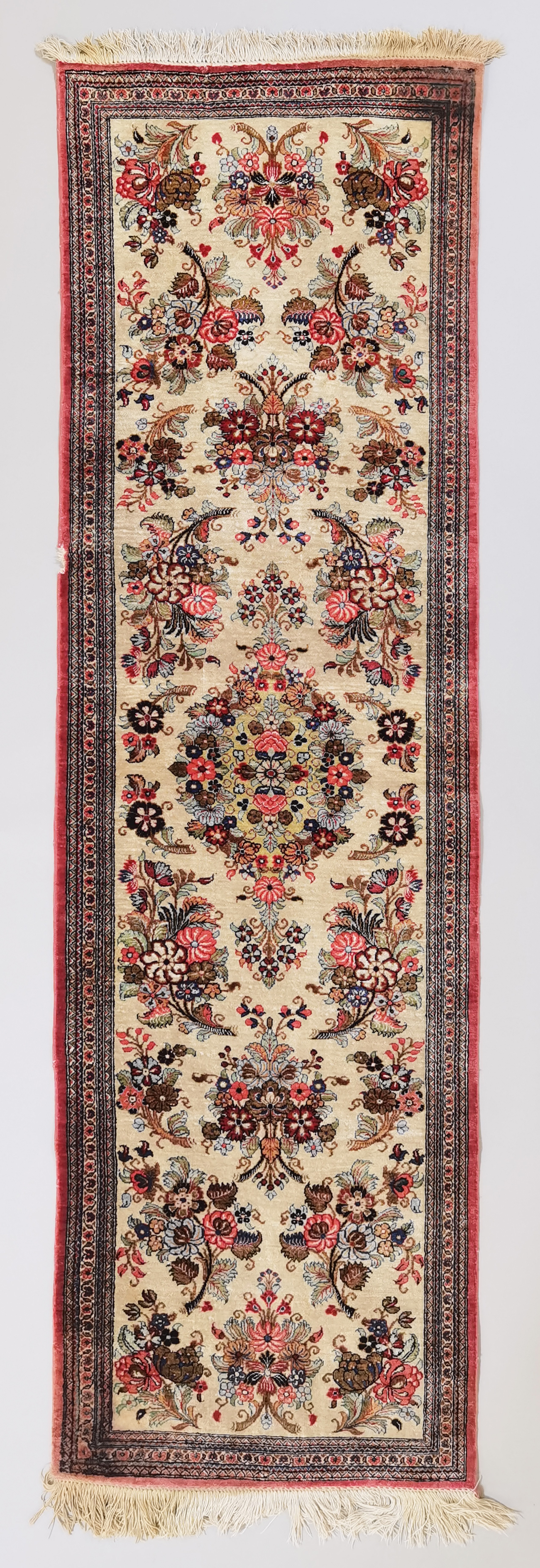 Stan zachowania: uszkodzenie na obrzeżu dywanu - brak fragmentu brzegu w połowie długości tkaniny.