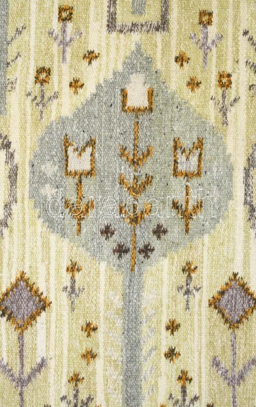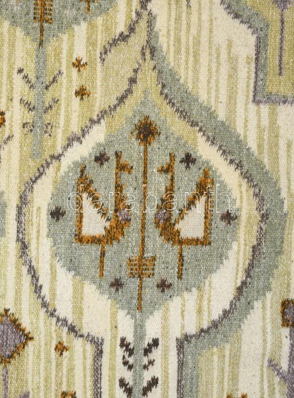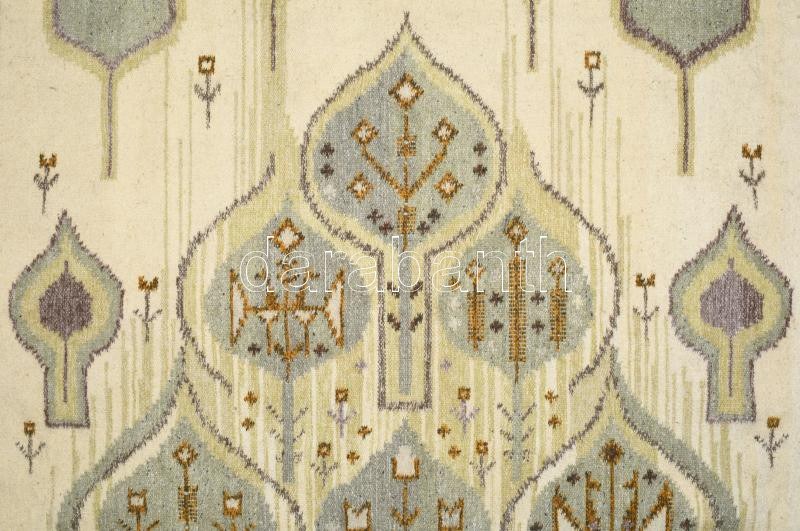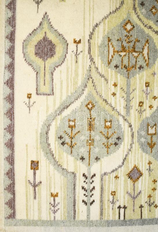 Németh Éva (1930-2019) textilművész: Nagyméretű faliszőttes pávákkal és virágos réttel. Hibátlan, 155x140 cm /// Éva Németh (1930-2019), textile artist: Large wall tapestry with peacocks and a flowery meadow. Perfect condition, 155x140 cm.