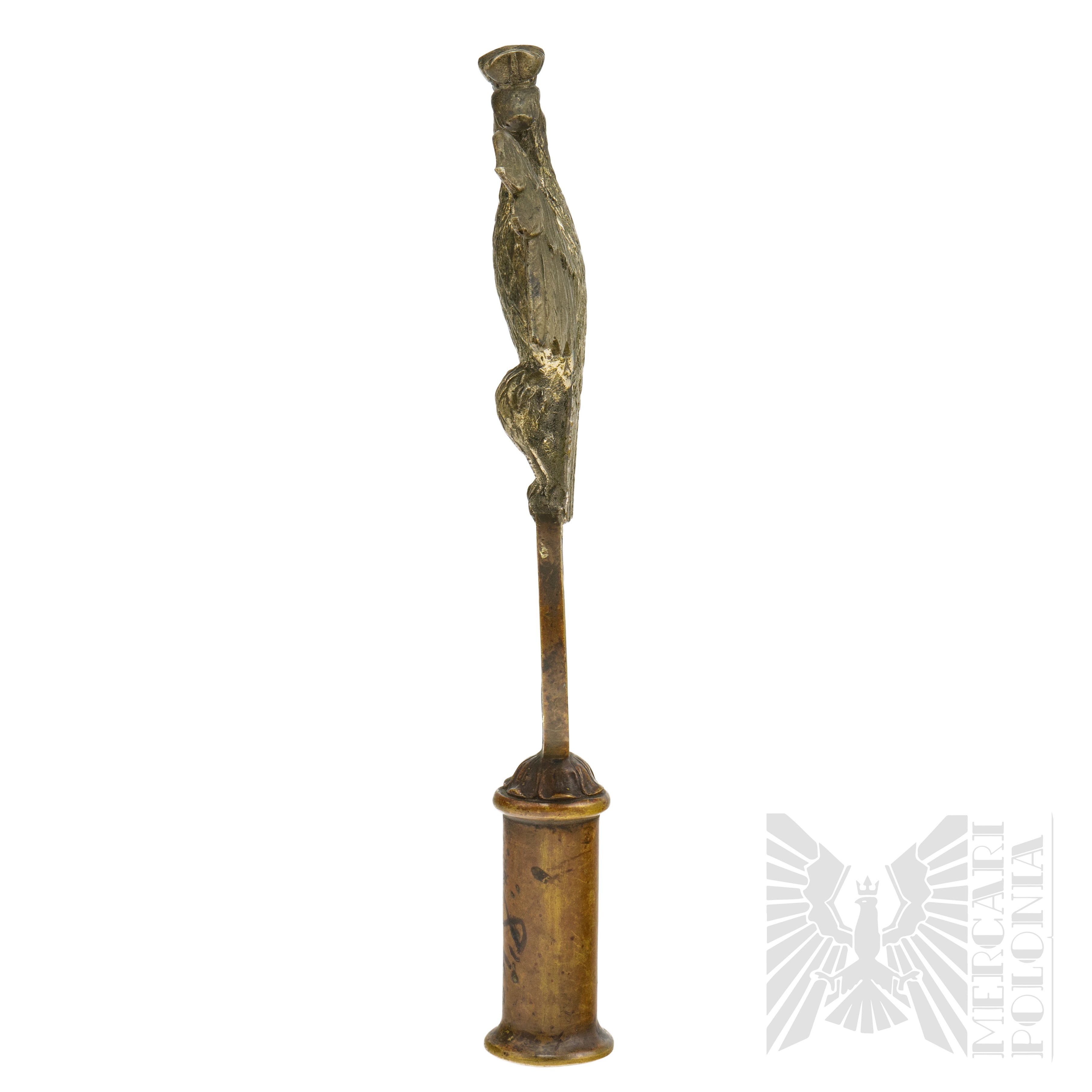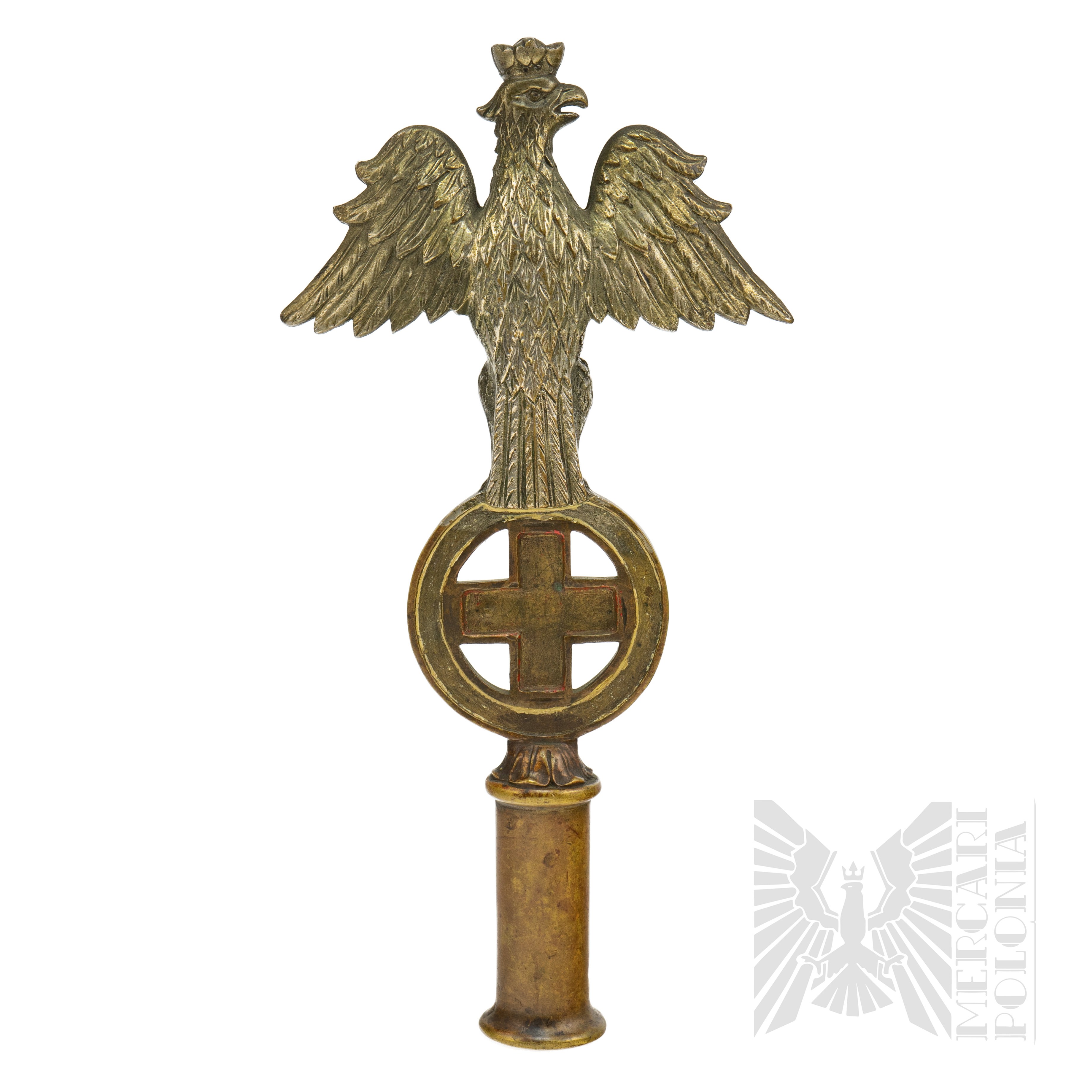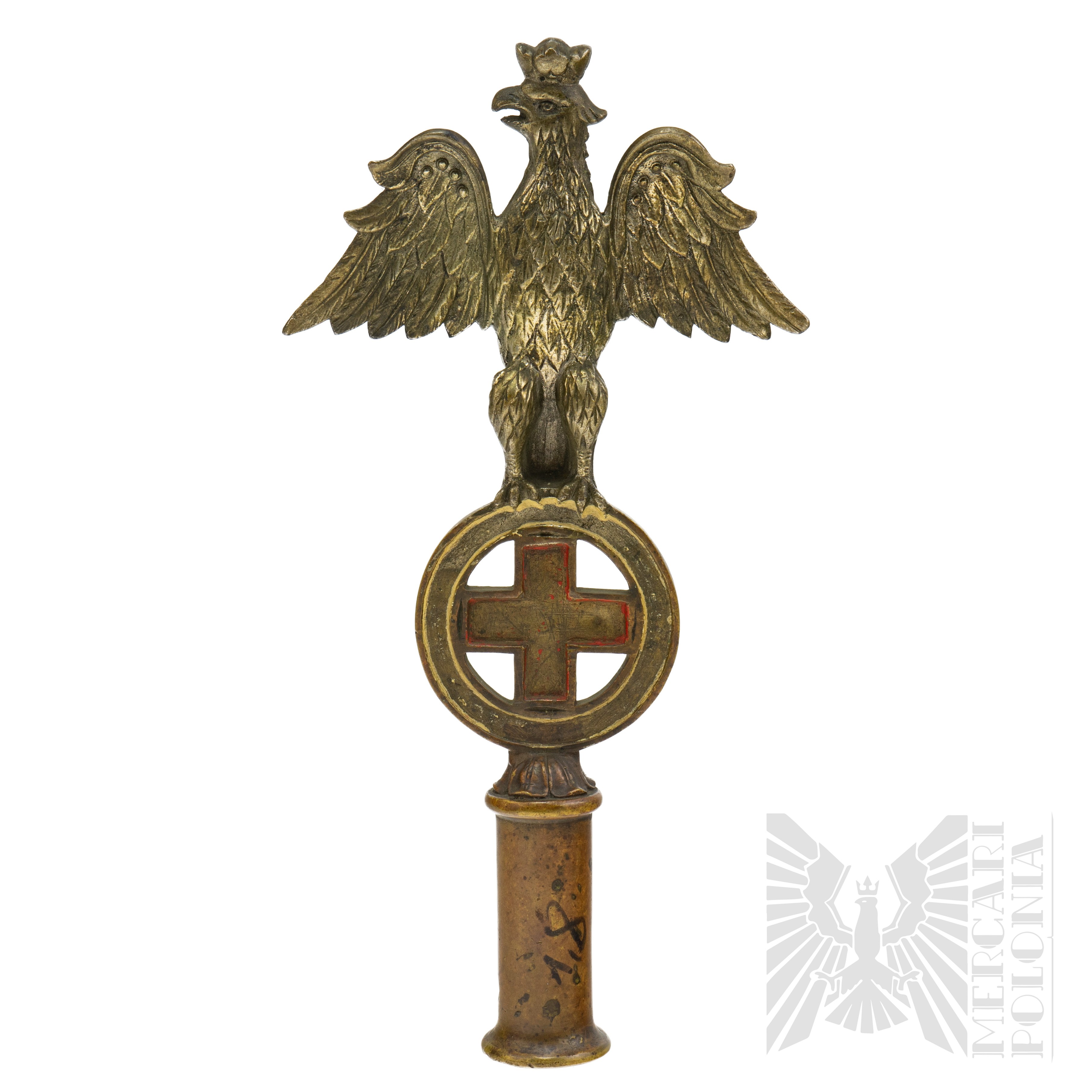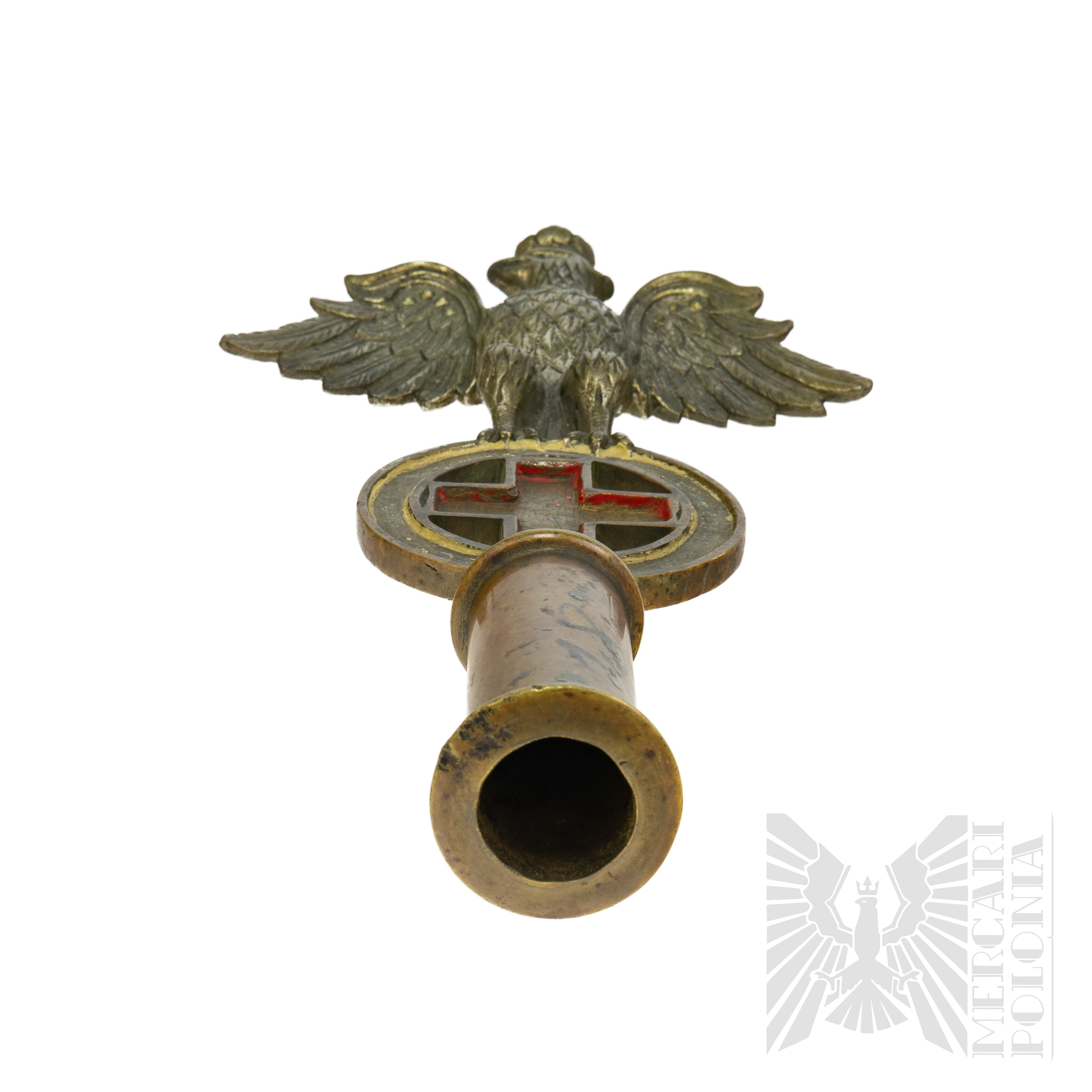Przedwojenna głowica sztandarowa Polskiego Czerwonego Krzyża. Wykonana z mosiądzu w formie Polskiego orła z rozpiętymi skrzydłami w koronie, spoczywającego na białym kółku z czerwonym krzyżem. Resztki srebrzenia i farby. Forma sugeruje że grot jest z lat dwudziestych dwudziestego wieku, różni się od późniejszych grotów Polskiego Czerwonego Krzyża. Polski Czerwony Krzyż powstał w 1919 roku przy wsparciu Heleny Paderewskiej i Towarzystwa Polskiego Białego Krzyża. W latach międzywojennych Polski Czerwony Krzyż funkcjonował jako organizacja paramilitarna, zajmująca się wyszkoleniem wojskowym, zakupem ambulansów wojskowych i kursami. Członkowie Polskiego Czerwonego Krzyża brali udział w Polskiej Kampanii Obronnej 1939 r., A później na innych frontach. dł. C. 33, szer. Maks. 16,7