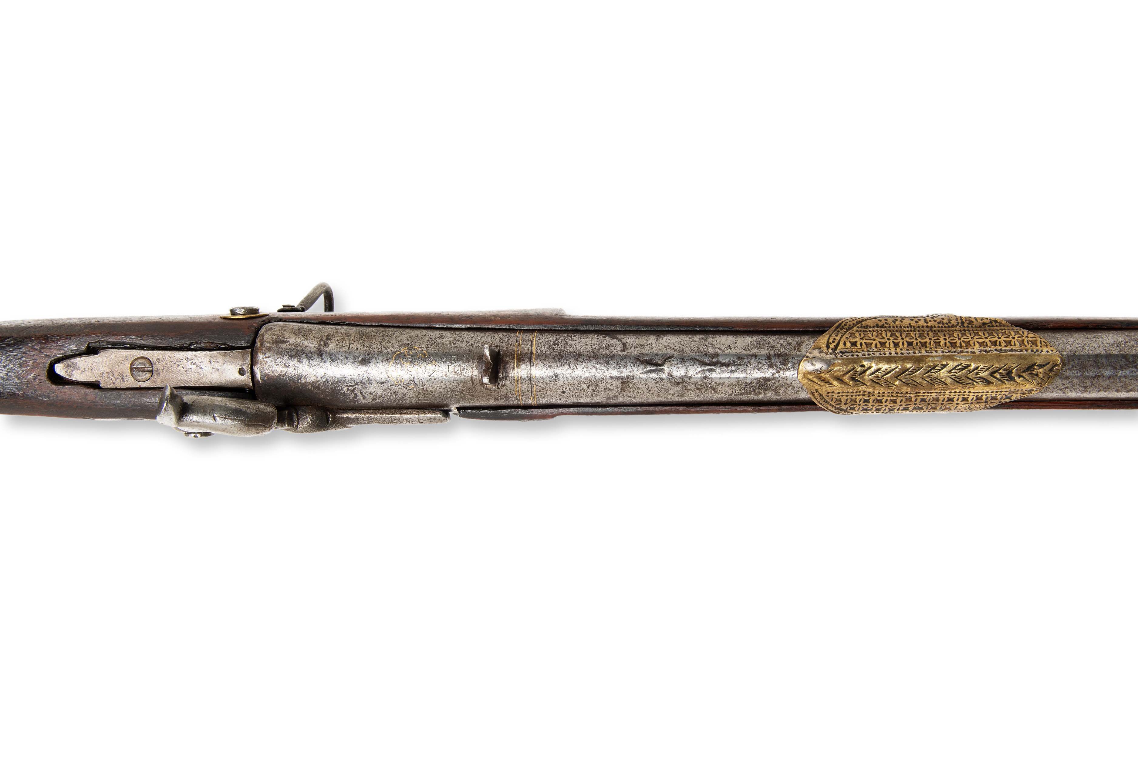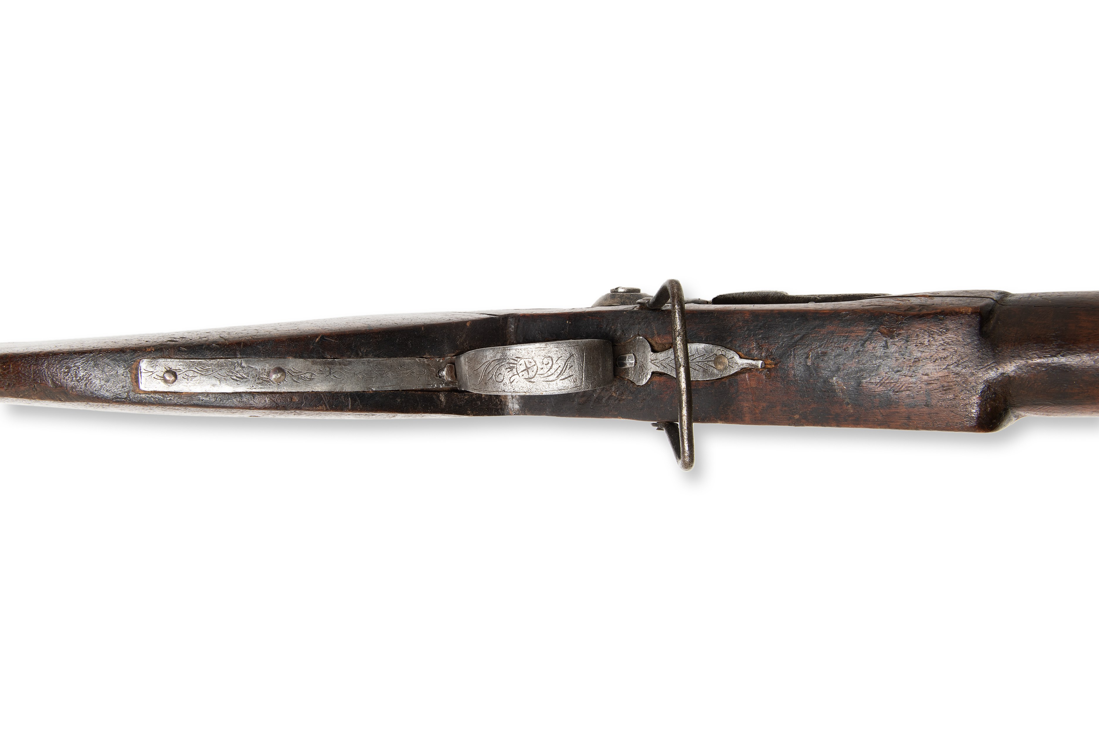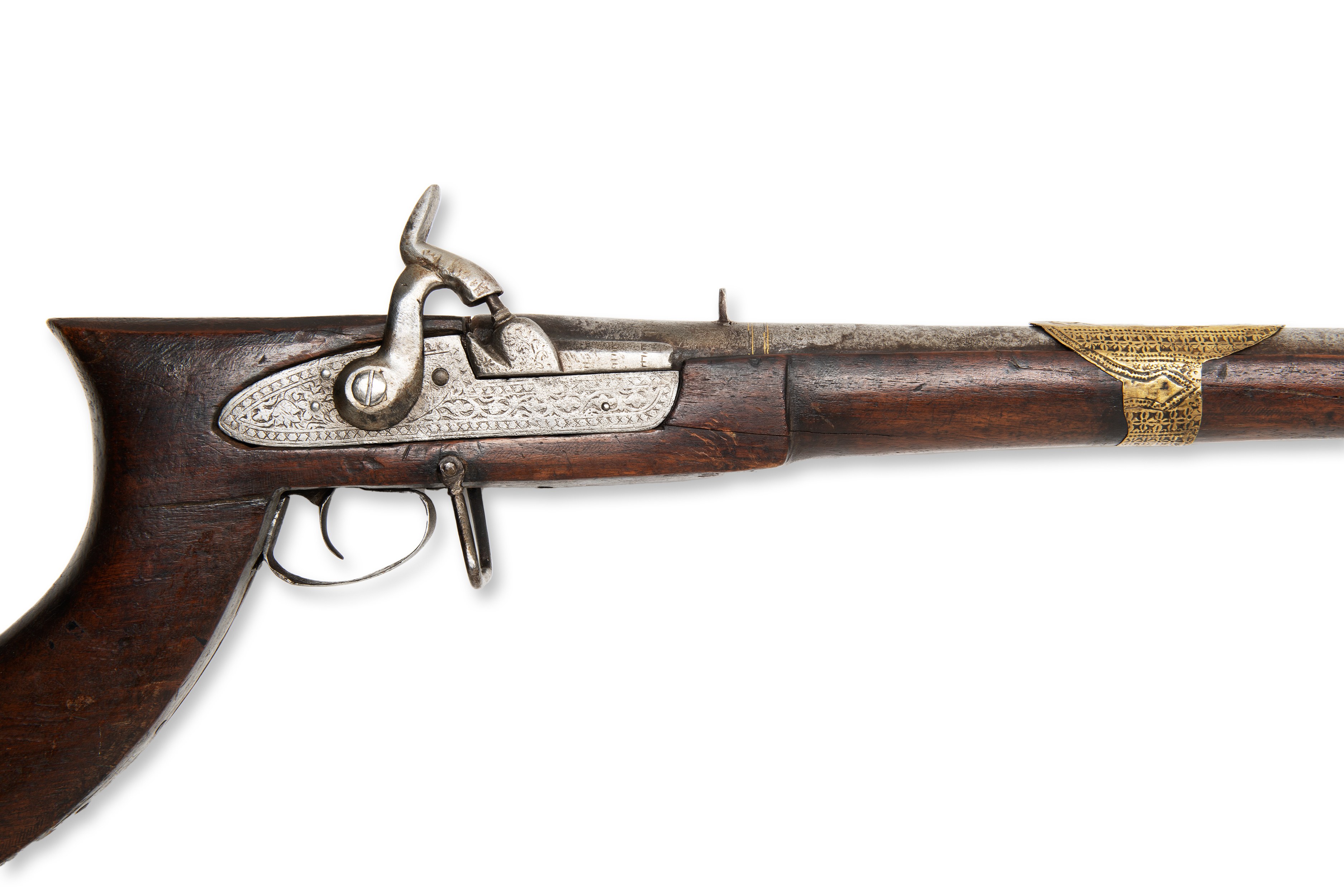 Percussion rifle of Afghan origin circa 1850. The weapon has a long smooth barrel with richly decorated brass lugs and engraved details on the bascule. The lock plate is fitted with a percussion cock and decorated with fine engraved ornamentation. The stock is made of dark wood and features a characteristic curve typical of Central Asian rifles. The metal parts bear a patina corresponding to the age of the weapon, the brass applications show traditional Afghan decorative motifs.***IMPORTANT NOTICE***
