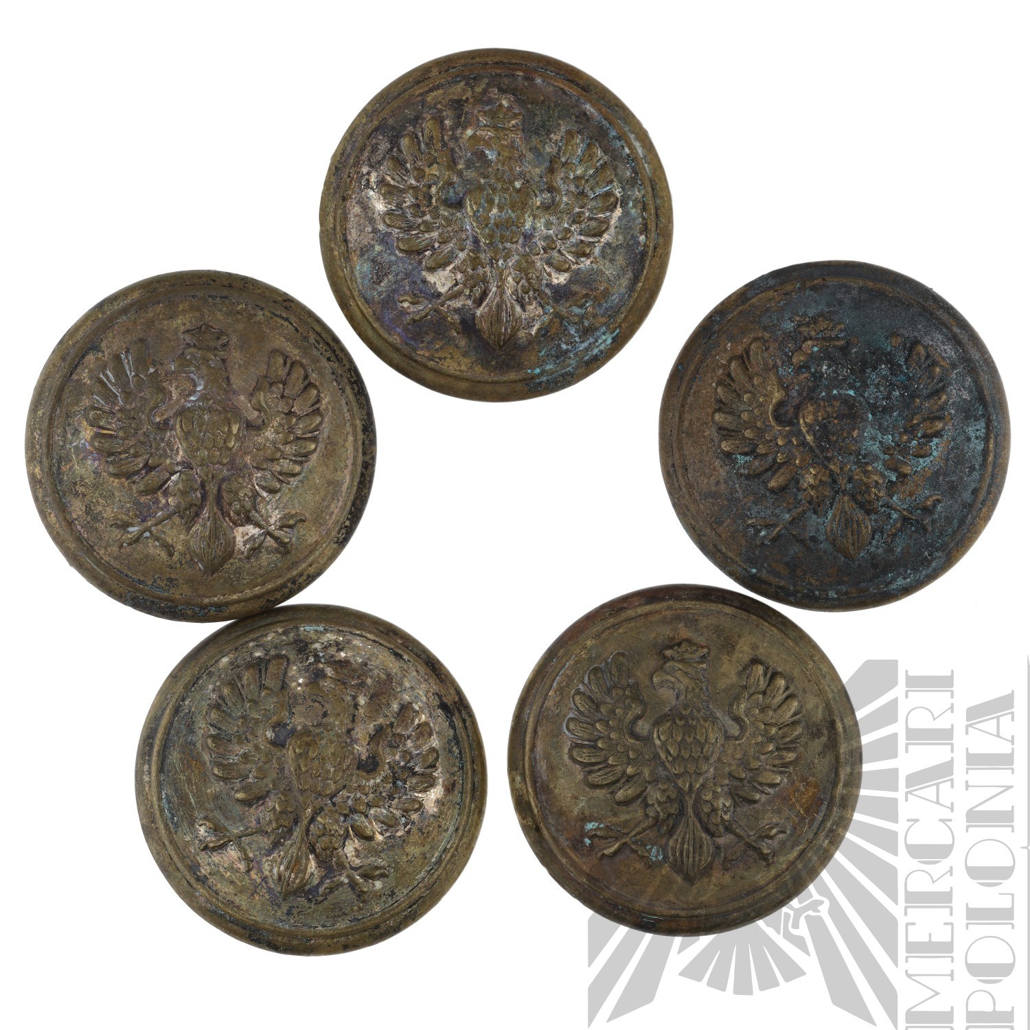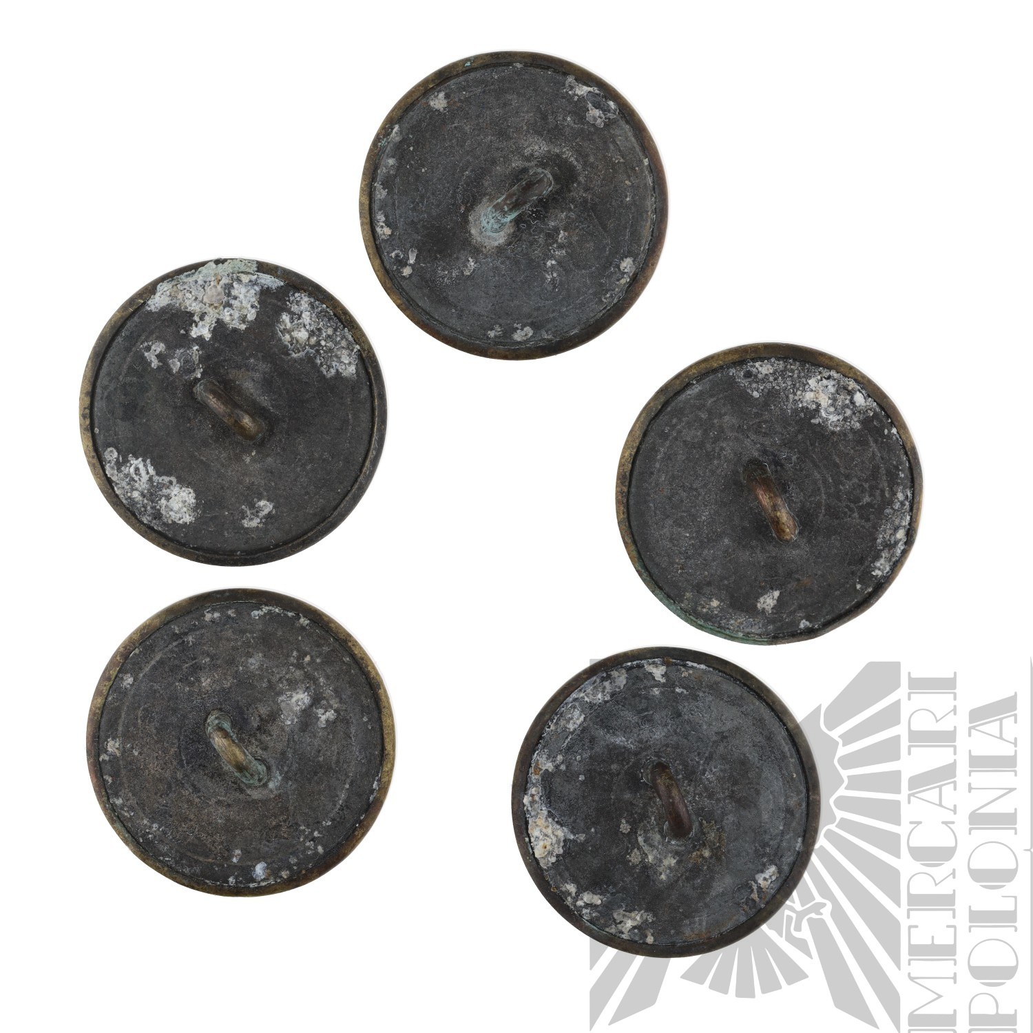 Zestaw pięciu guzików z orłem, wz.17. Dwu-częściowe, mosiądz i stal, prawdopodobnie produkcji austriackiej. Widoczne resztki srebrzenia. Średnica 25mm. Stan jak na zdjęciach.