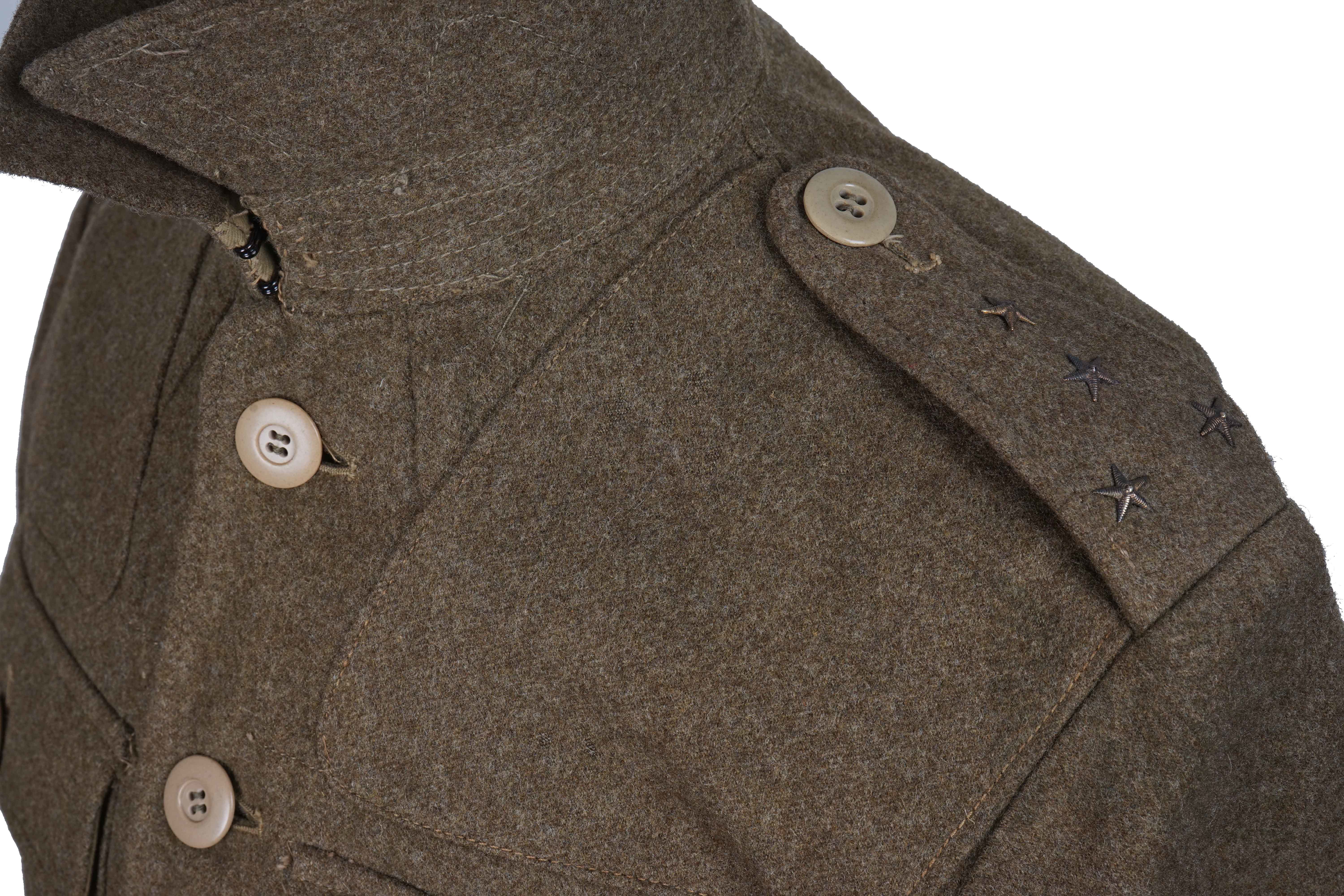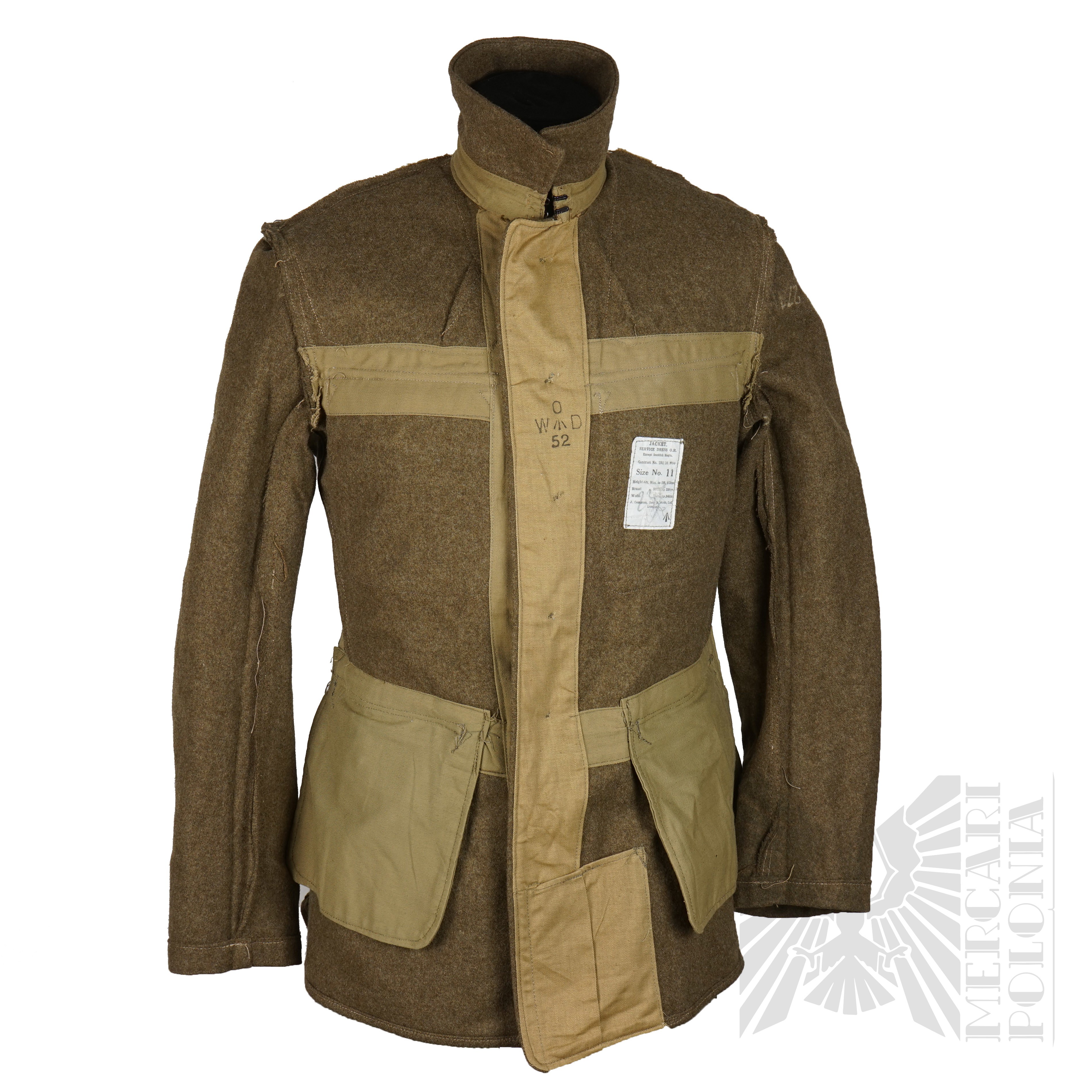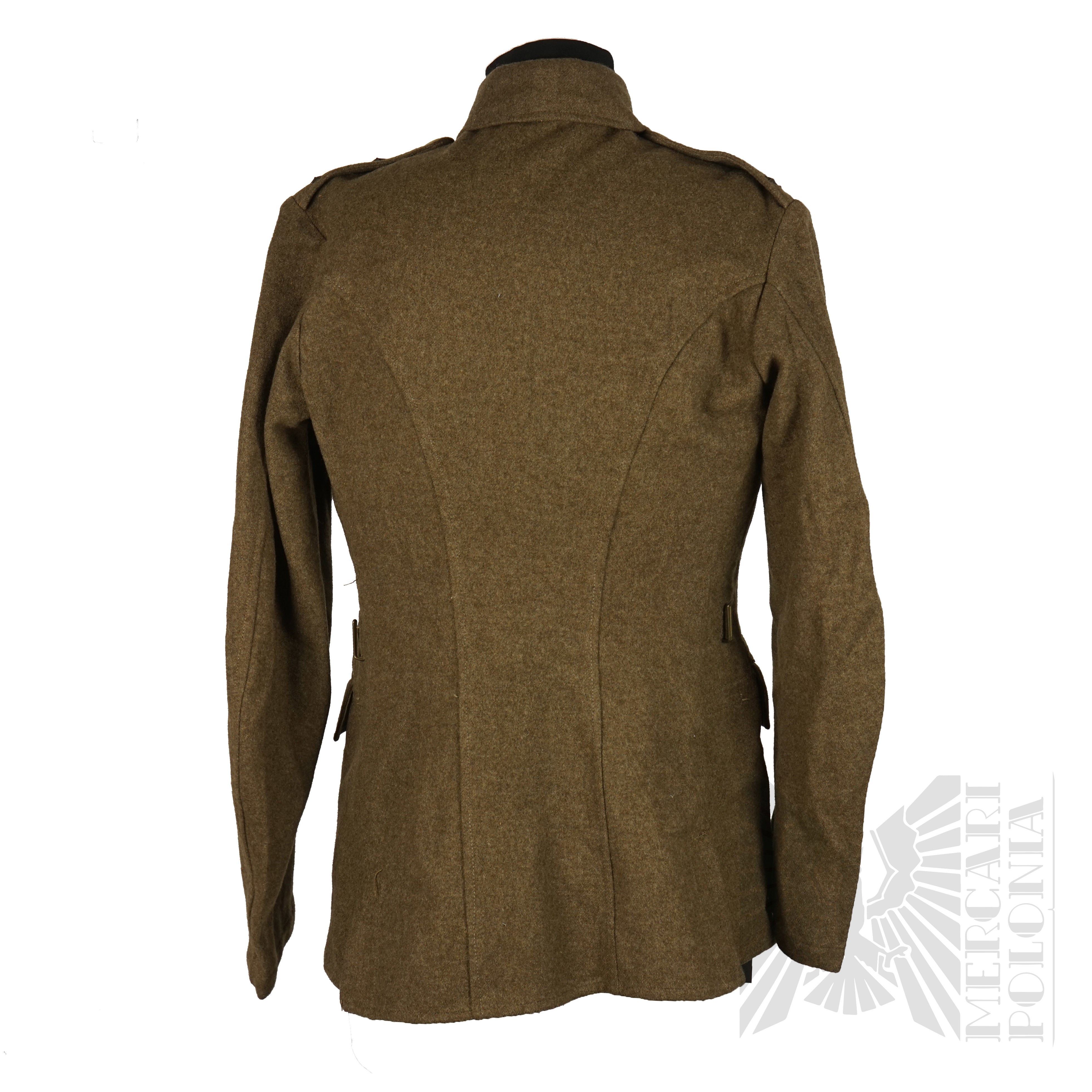 Brytyjska kurtka polowa żołnierska Service Dress. Wewnątrz oryginalna metka z producentem z Londynu. Stempel z odbiorem brytyjskiego Departamentu Wojny (War Department) oraz liter O na 1940 rok. Na naramiennikach nieznane gwiazdki.
