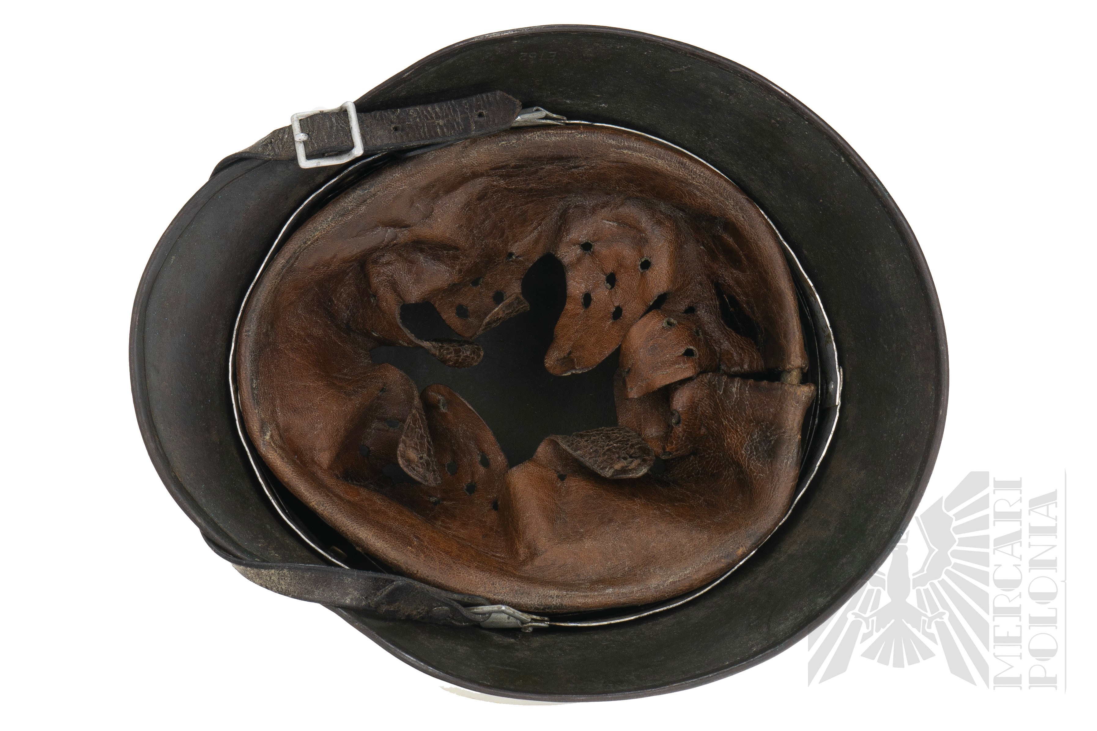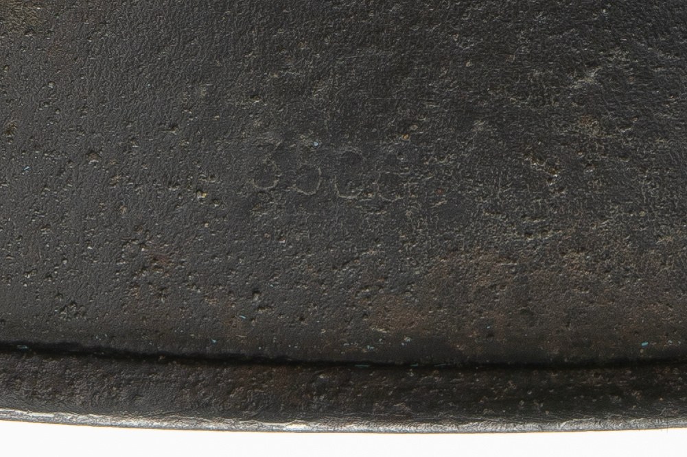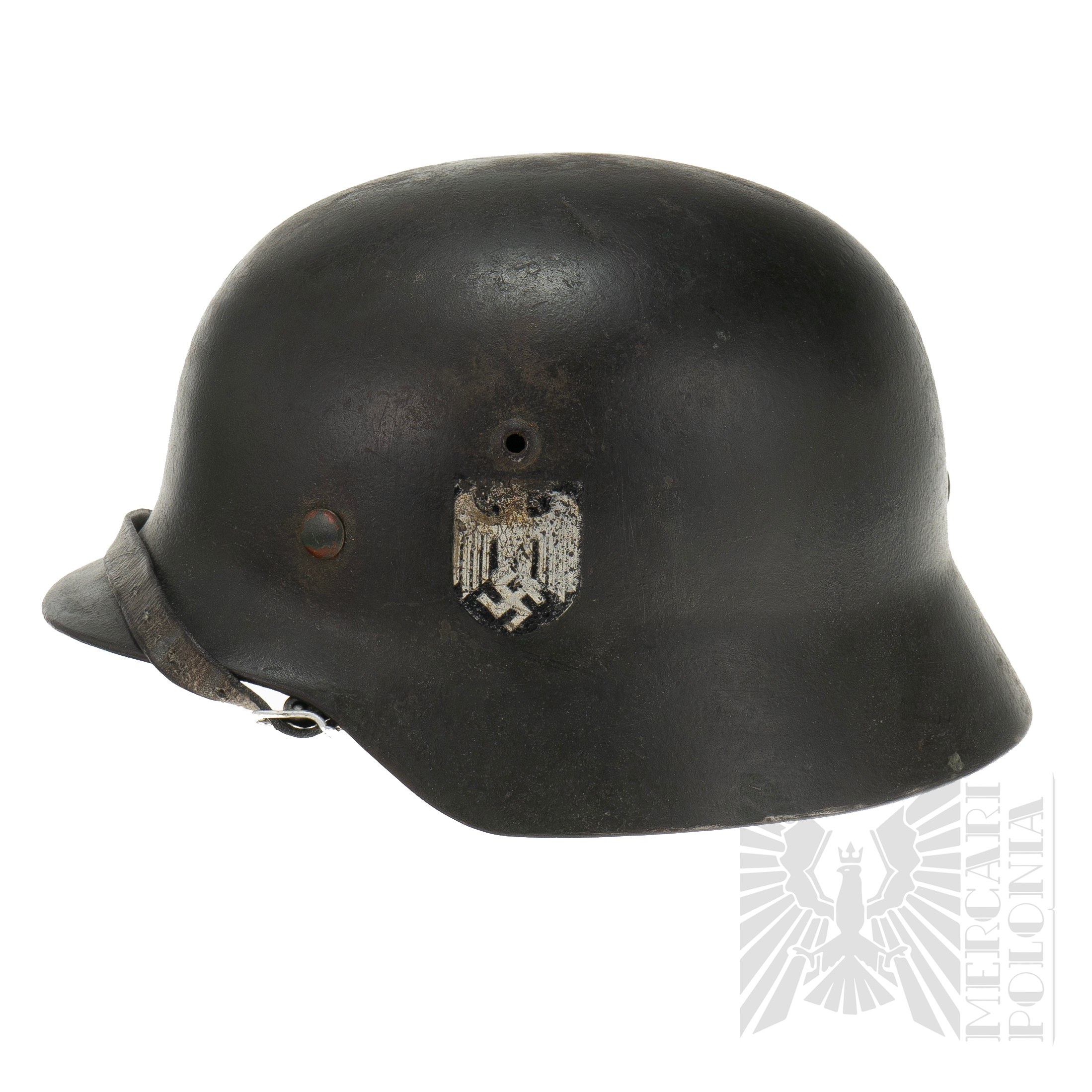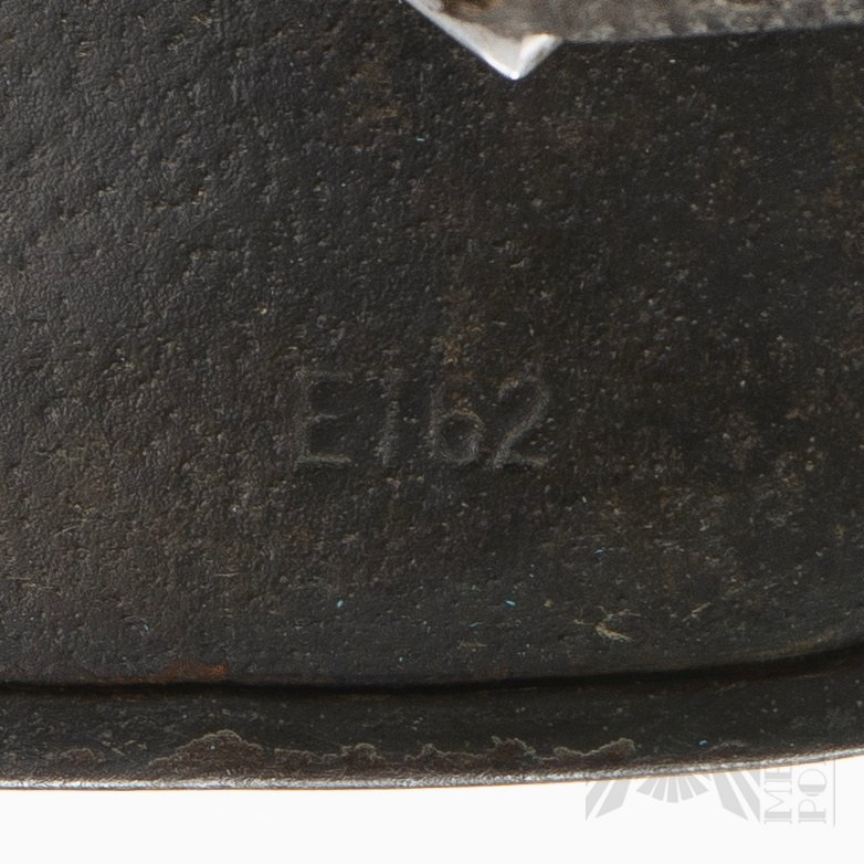 Zachowane oba dekale (tzw. M35 DD). Po lewej stronie kalkomania z niemieckim srebrnym orłem na czarnym tle, siedzącym na swastyce. Po prawej stronie stronie tarcza w kolorach Niemiec (czarno-biało-czerwona). Kompletny hełm wraz z wnętrzem i paskiem pod brodę. Na boku nakarczka sygnatura ET62 (Producent Eisenhüttenwerke, Thale, rozmiar 62). Na tyle nakarcza widoczny numer seryjny. Bardzo duża ilość farby tak zwanej “Applegreen”, używanej na początku 2 Wojny Światowej, szczególnie podczas inwazji na Polskę (Wojna Obronna/Kampania Wrześniowa 1939 Roku) oraz inwazji na Francje w 1940 roku. Skóra fasunku i paska elastyczna.