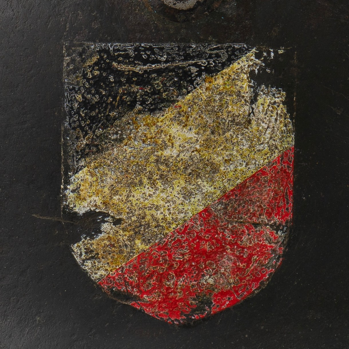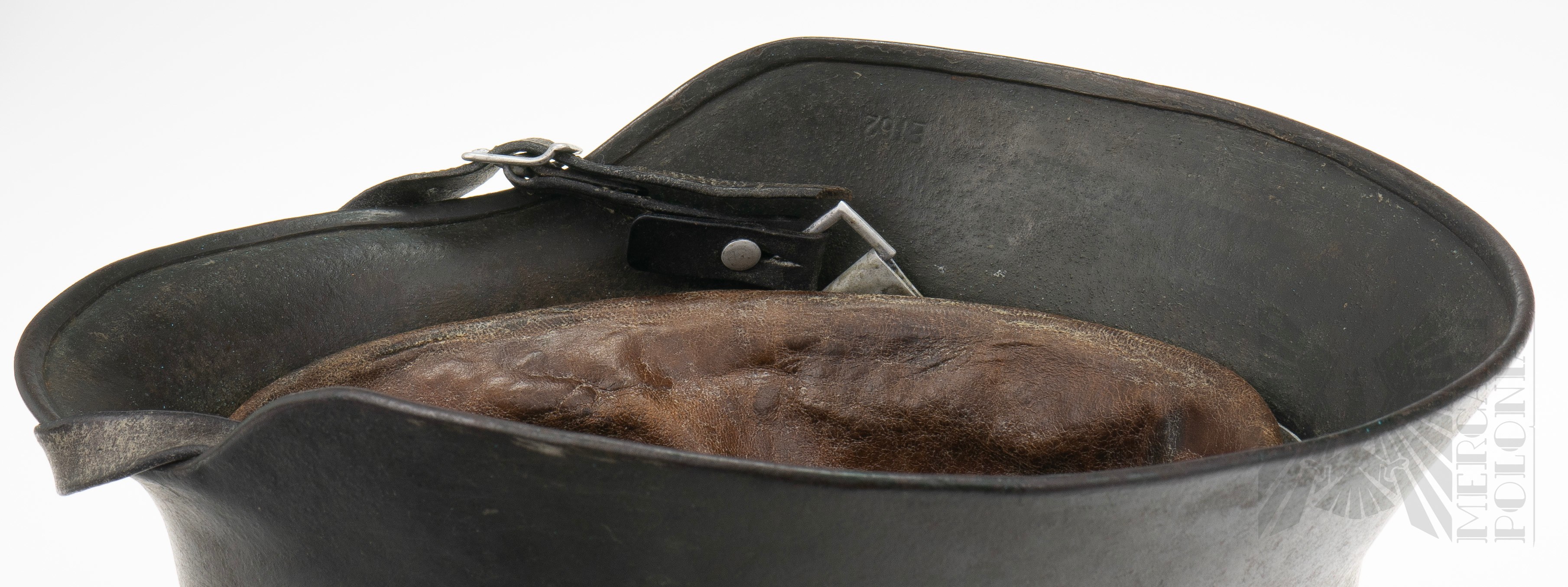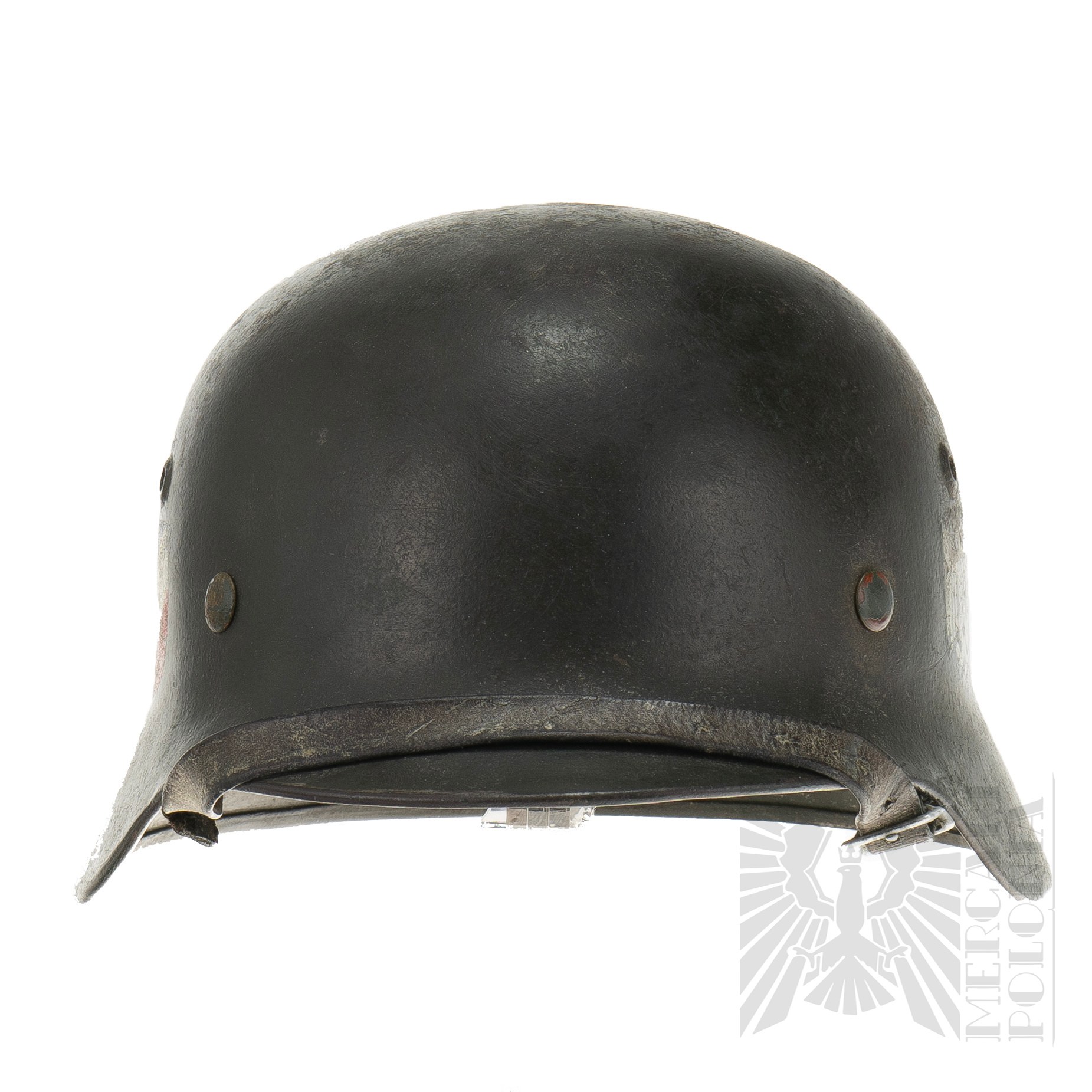 Zachowane oba dekale (tzw. M35 DD). Po lewej stronie kalkomania z niemieckim srebrnym orłem na czarnym tle, siedzącym na swastyce. Po prawej stronie stronie tarcza w kolorach Niemiec (czarno-biało-czerwona). Kompletny hełm wraz z wnętrzem i paskiem pod brodę. Na boku nakarczka sygnatura ET62 (Producent Eisenhüttenwerke, Thale, rozmiar 62). Na tyle nakarcza widoczny numer seryjny. Bardzo duża ilość farby tak zwanej “Applegreen”, używanej na początku 2 Wojny Światowej, szczególnie podczas inwazji na Polskę (Wojna Obronna/Kampania Wrześniowa 1939 Roku) oraz inwazji na Francje w 1940 roku. Skóra fasunku i paska elastyczna.