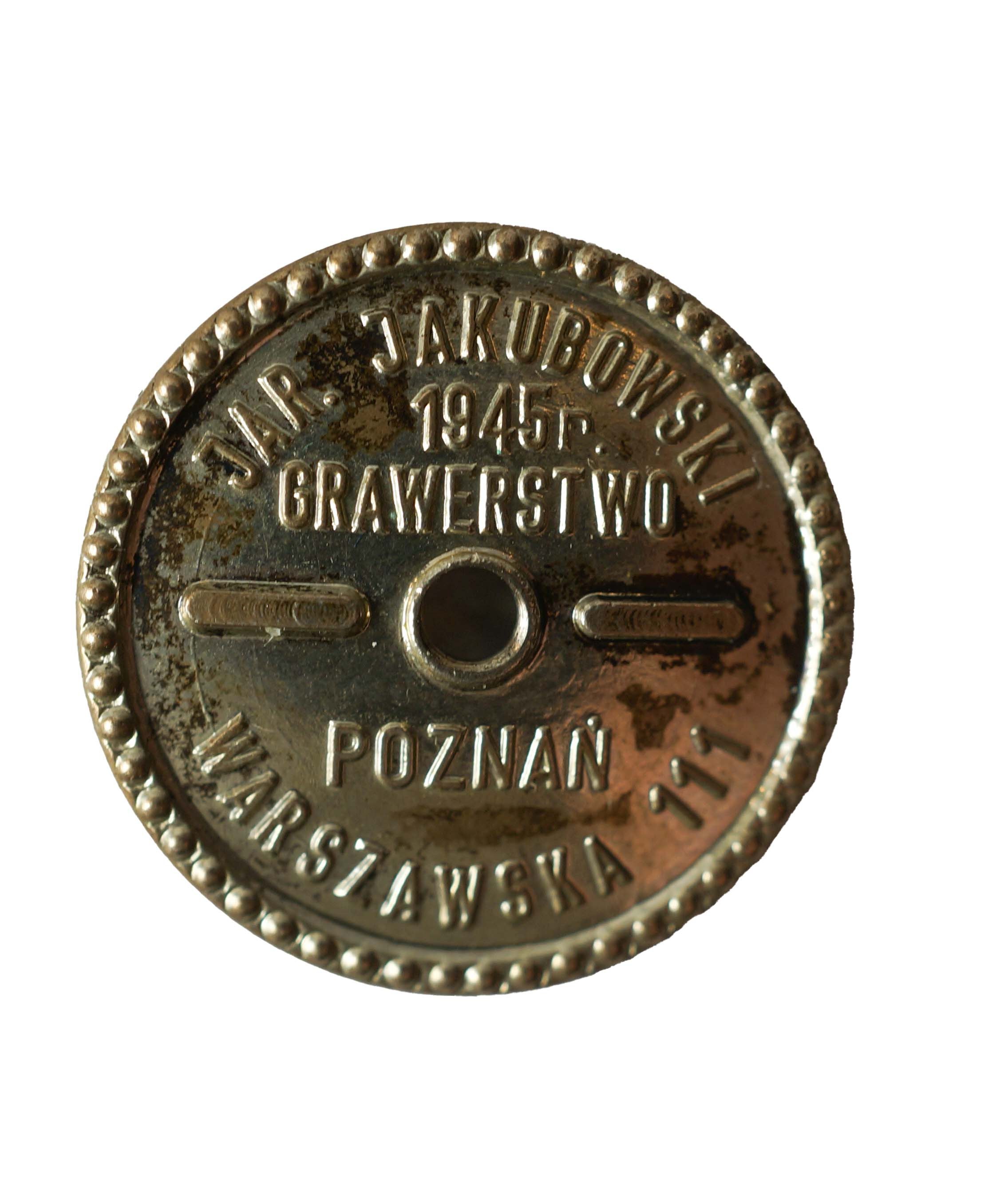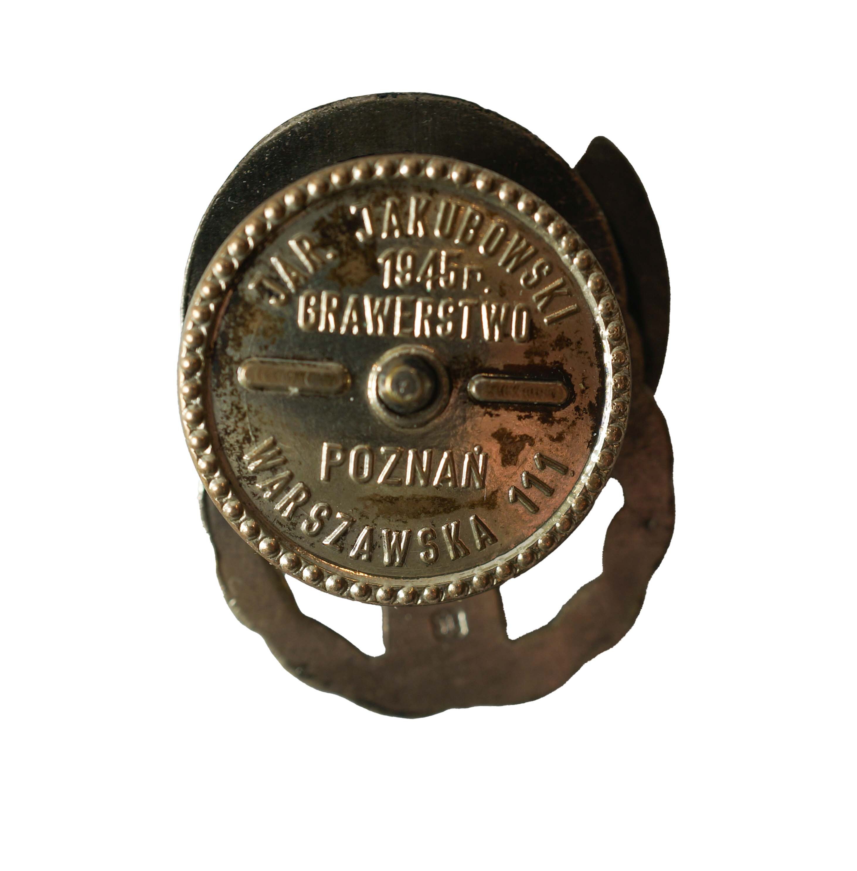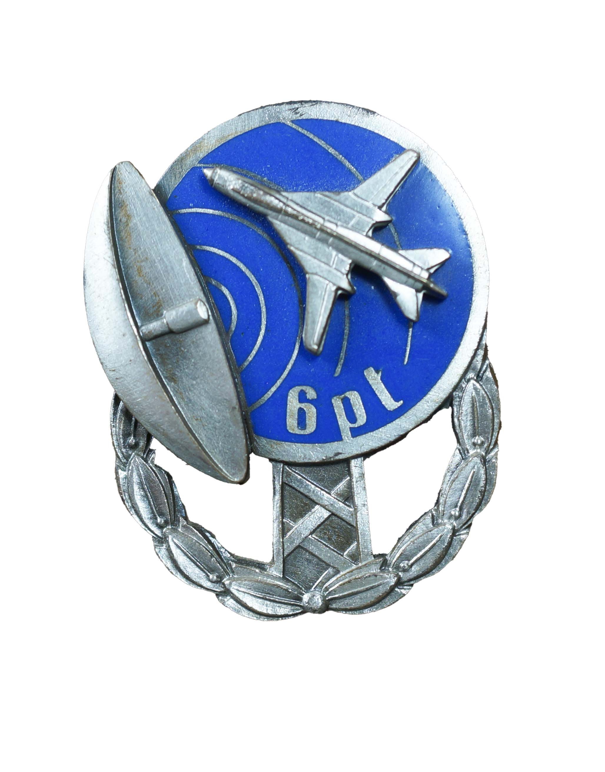 Odznaka 6 Pułk Łączności - Śrem , wersja w kolorze srebrnym, wymiary: 31x24mm, nakrętka sygnowana: Jarosław Jakubowski, Poznań