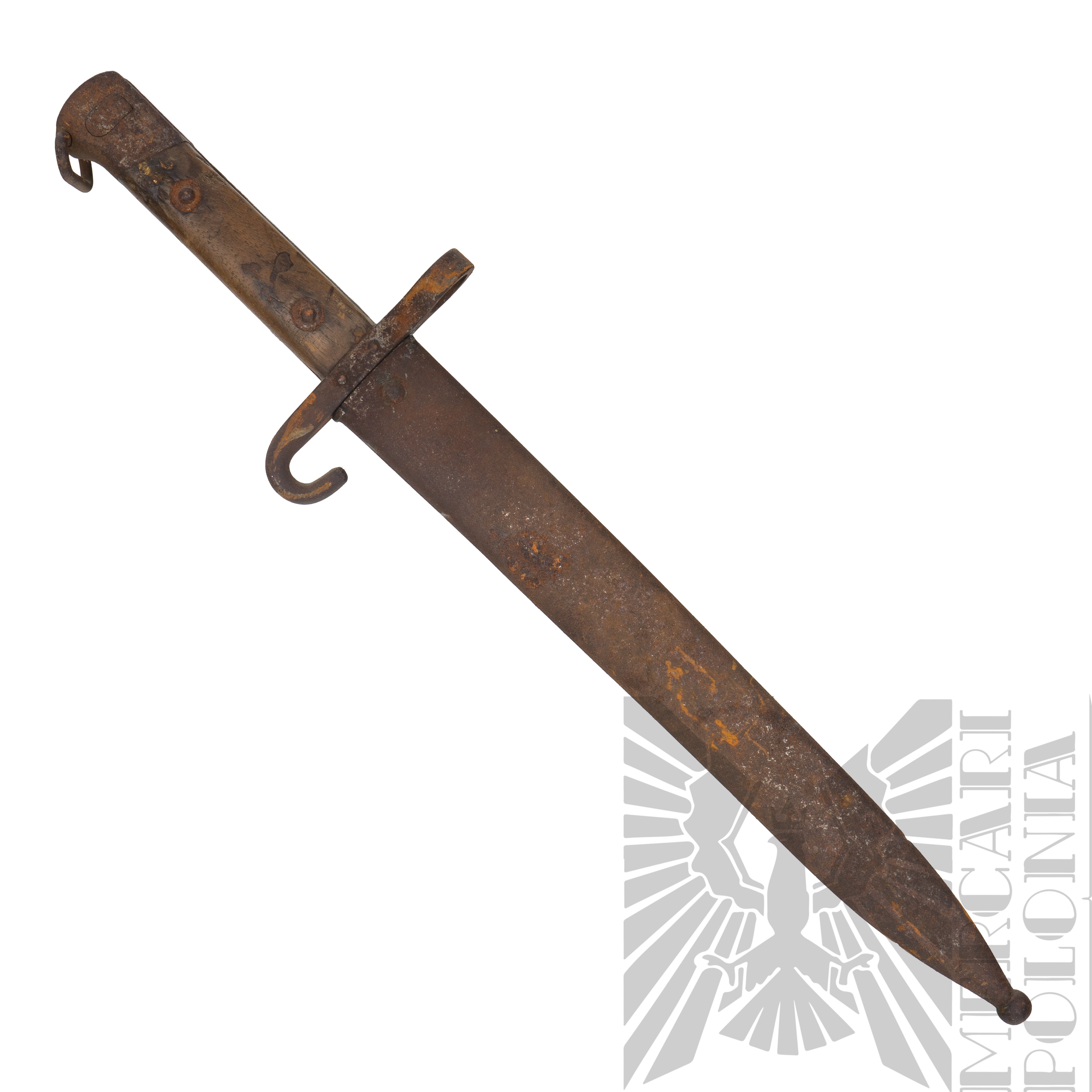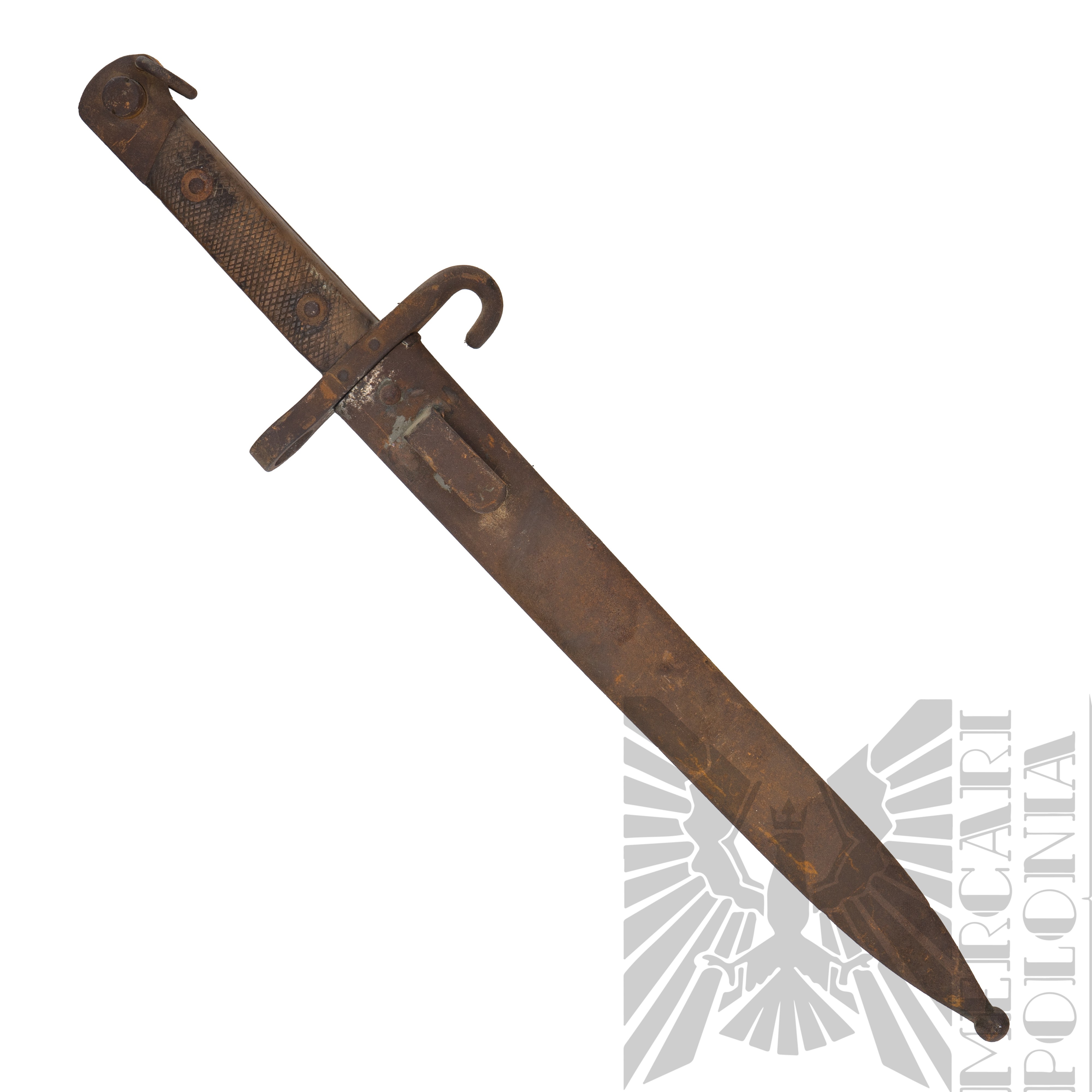 Austriacki bagnet do karabinka Manlicher, stalowa głownia sygnowana u progu przy jelcu wyposażona z obu stron w zbrocze, jelec z zamkniętym pierścieniem, mocowany na dwa nity, również sygnowany. Głowica z działającym zatrzaskiem. Okładziny drewniane. Pochwa stalowa z skórzaną żabką. Stan ogólny widoczny na zdjęciach.
