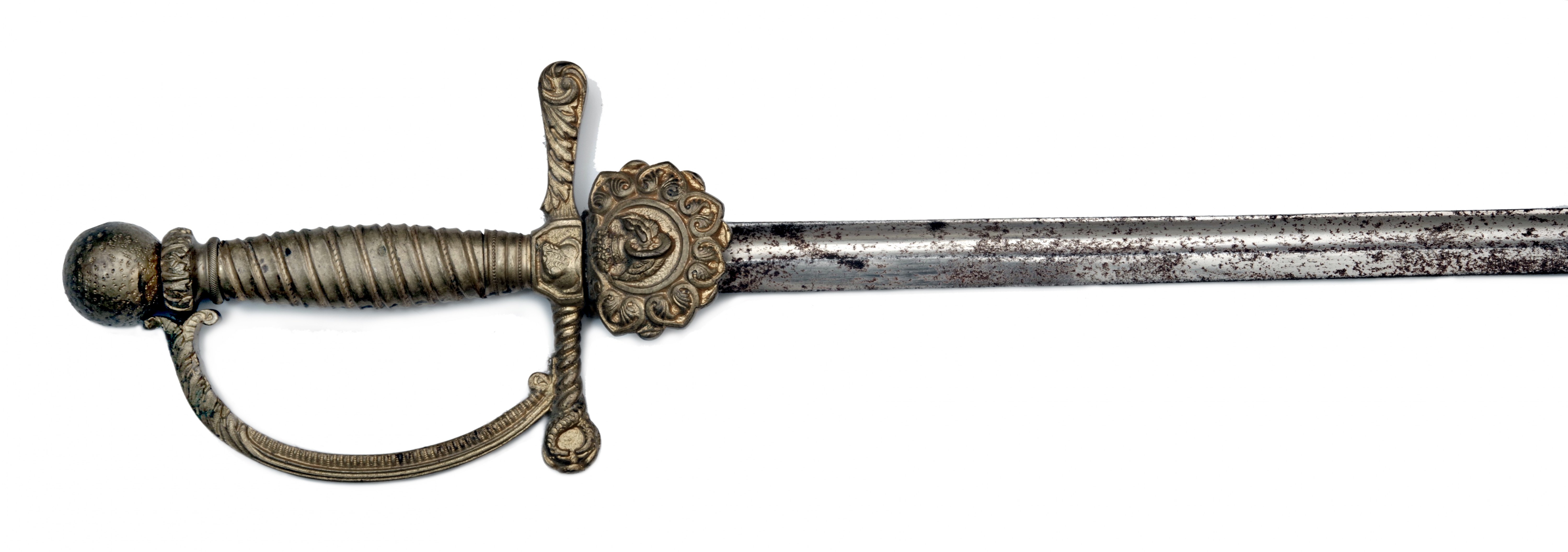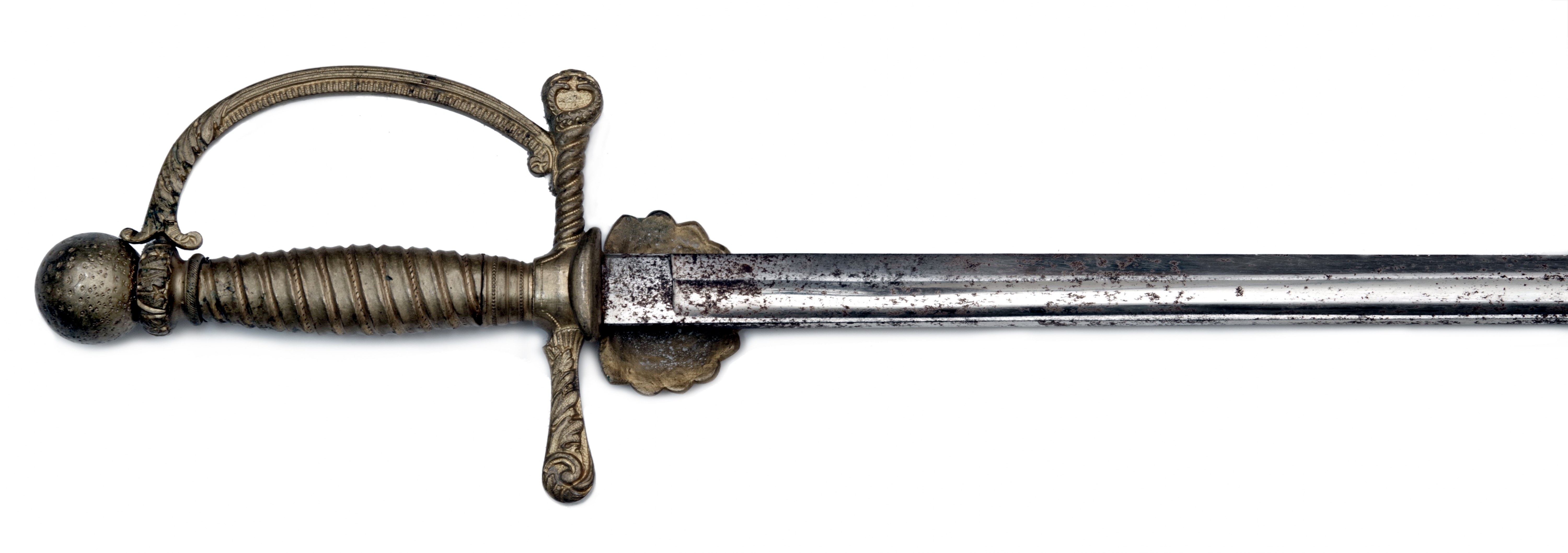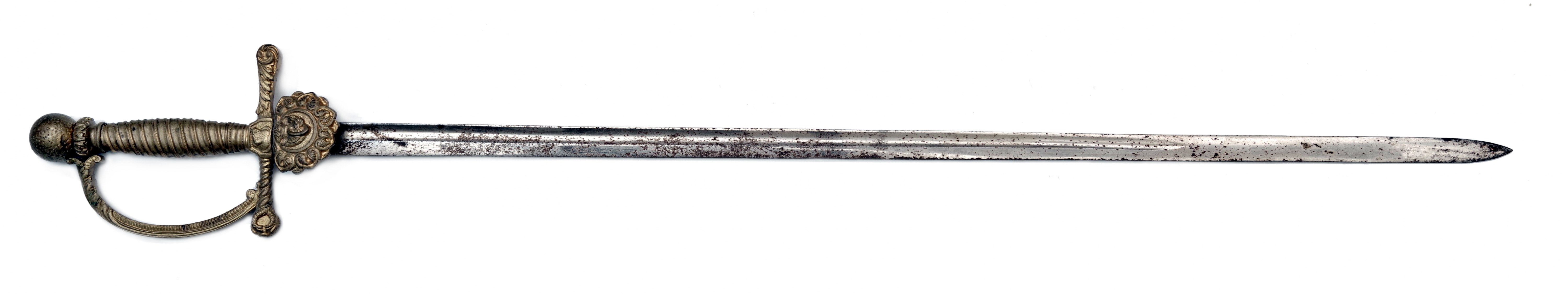 Rovná jednosečná čepel s oboustranným výbrusem, poniklovaná, poněkud skvrnitá a s povrchovou korozí, zlacený mosazný jílec s reliéfním dekorem (zlacení s patinou, setřelé), na záštitném listu okřídlené kolo s císařskou korunou. Bez pochvy. Rakousko, 2. pol. 19. stol., délka 86 cm. Stav 2-