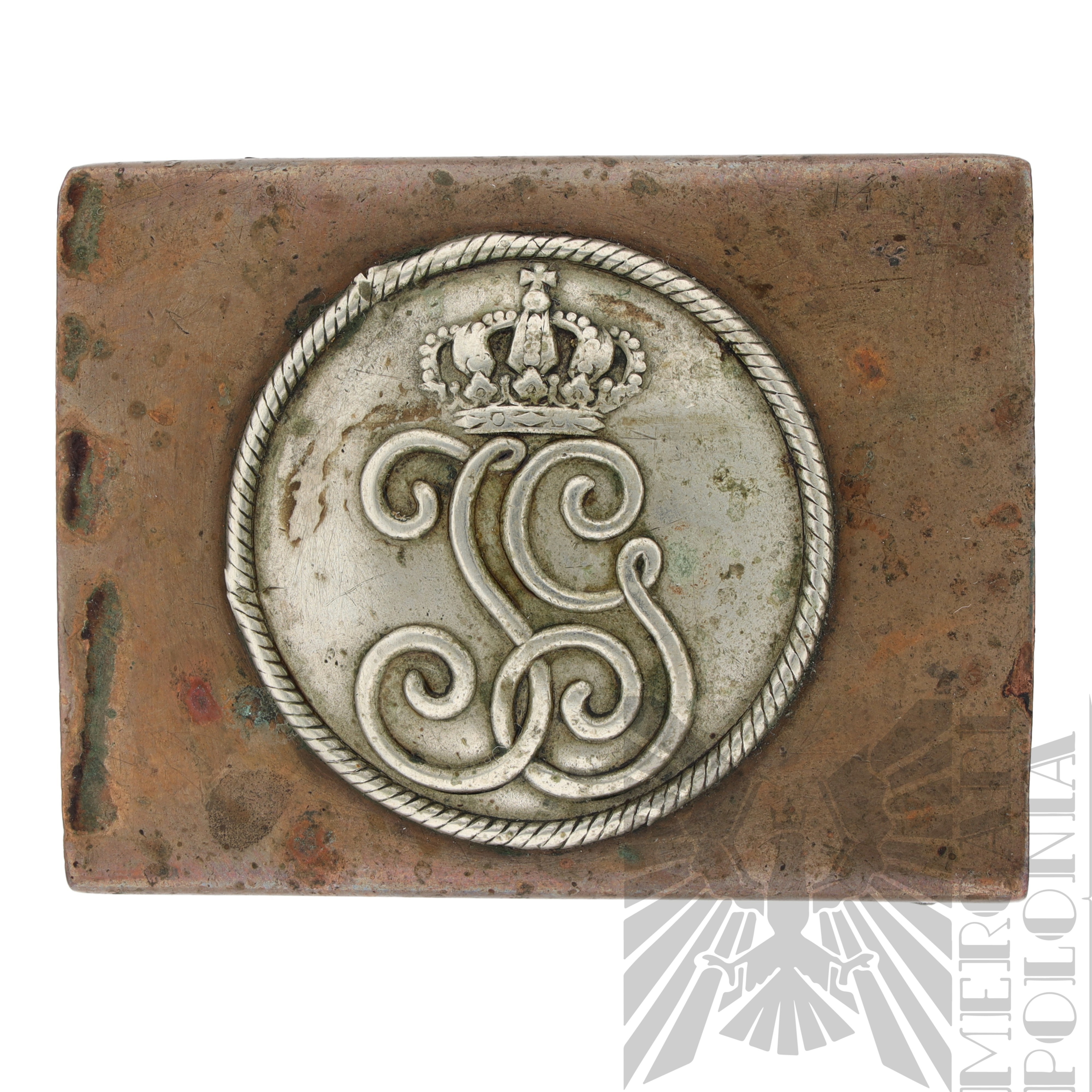Rzadka klamra do pasa z okresu Cesarstwa Niemieckiego, wykonana z mosiądzu i niklu, należąca do 107. pułku piechoty. Na klamrze znajduje się monogram księcia Johanna Georga. Zachowała się w komplecie ze swoim oryginalnym, podwójnym zapięciem na pas.