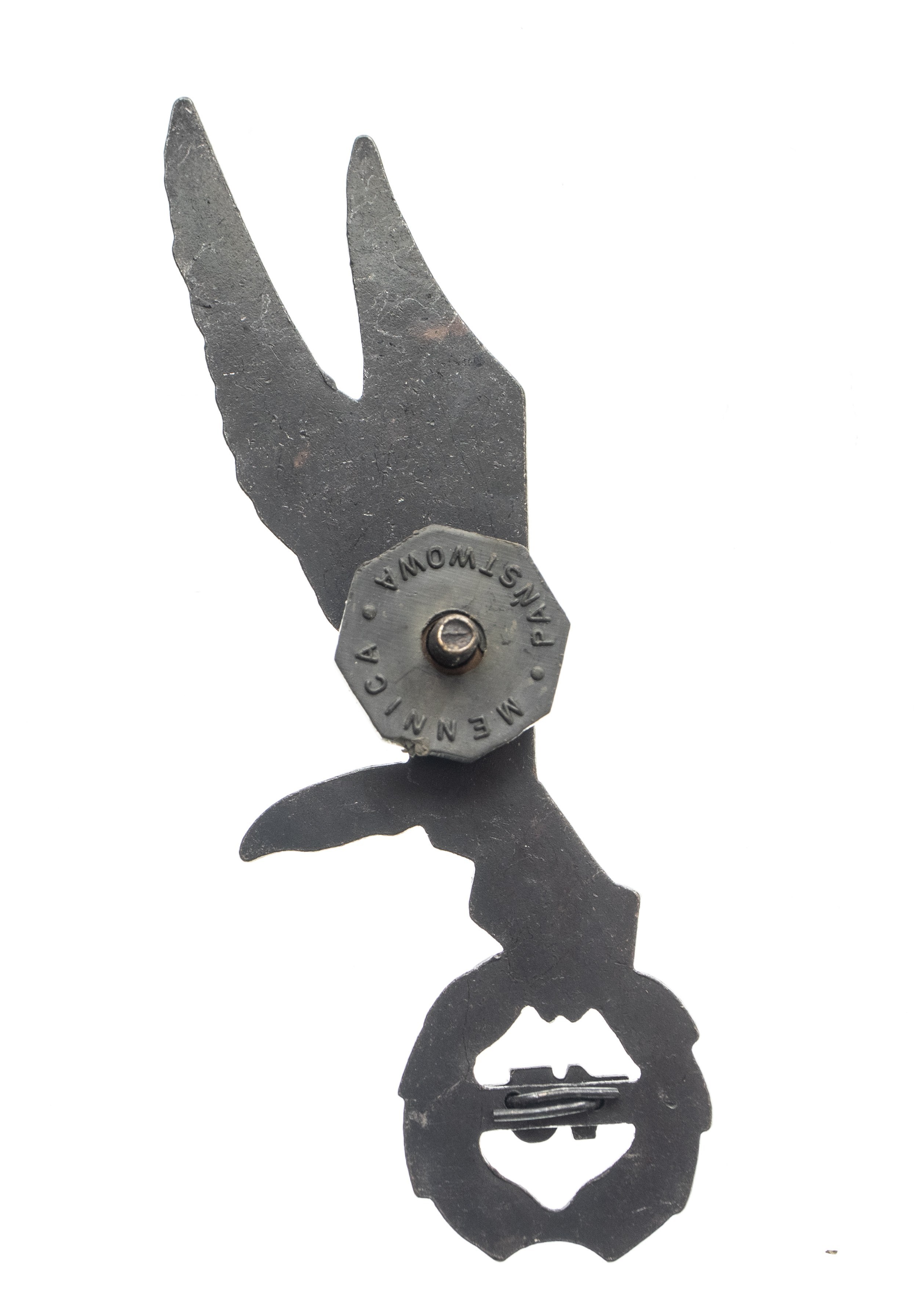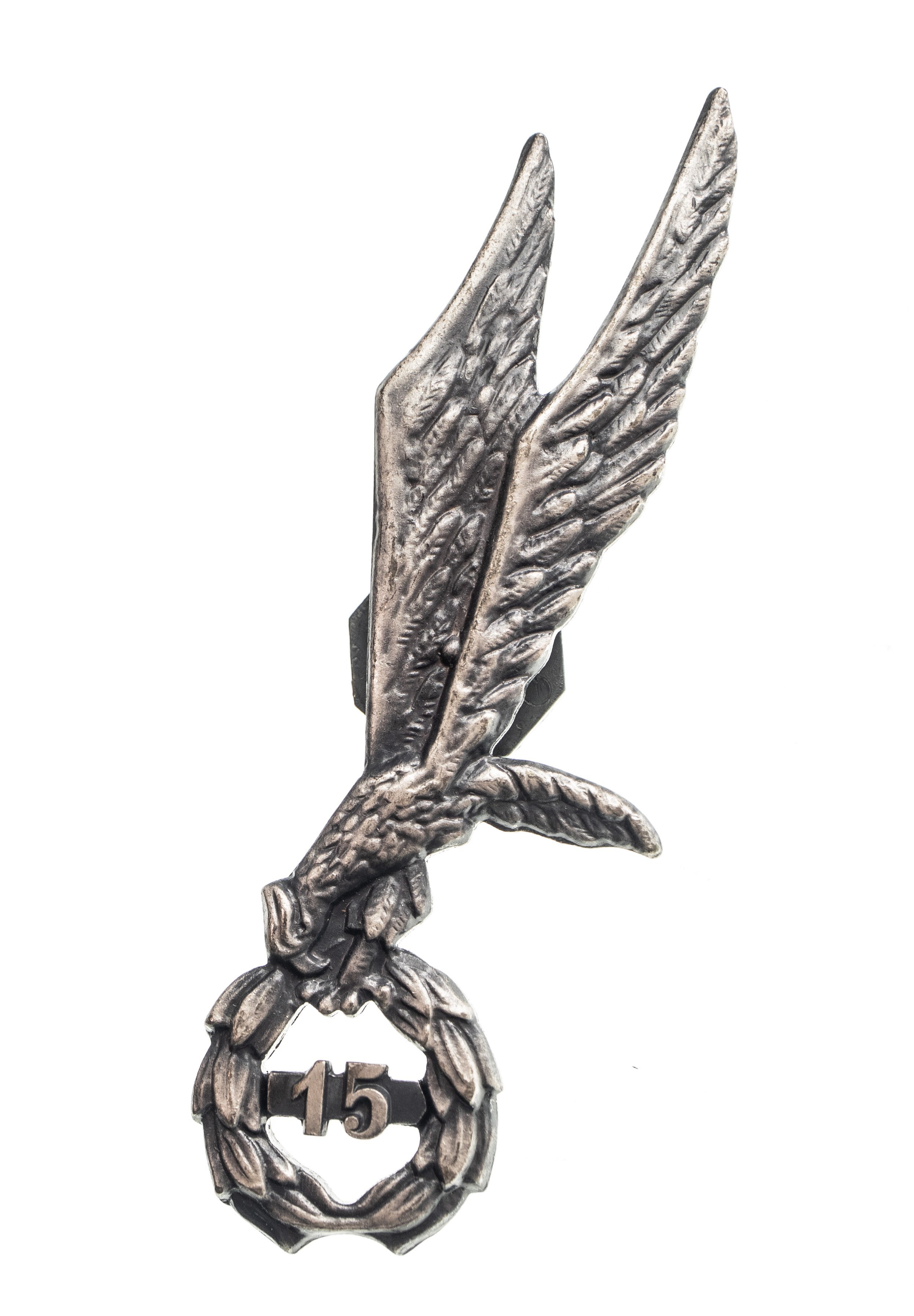 Odznaka wojskowa – skoczek spadochronowy wojsk powietrzno-desantowych, lata 70- te, 15 wykonanych skoków. Odznaka wykonana w Mennicy Państwowej . Wysokość około 8 cm. Nakrętka sygnowana MENNICA PAŃSTWOWA.