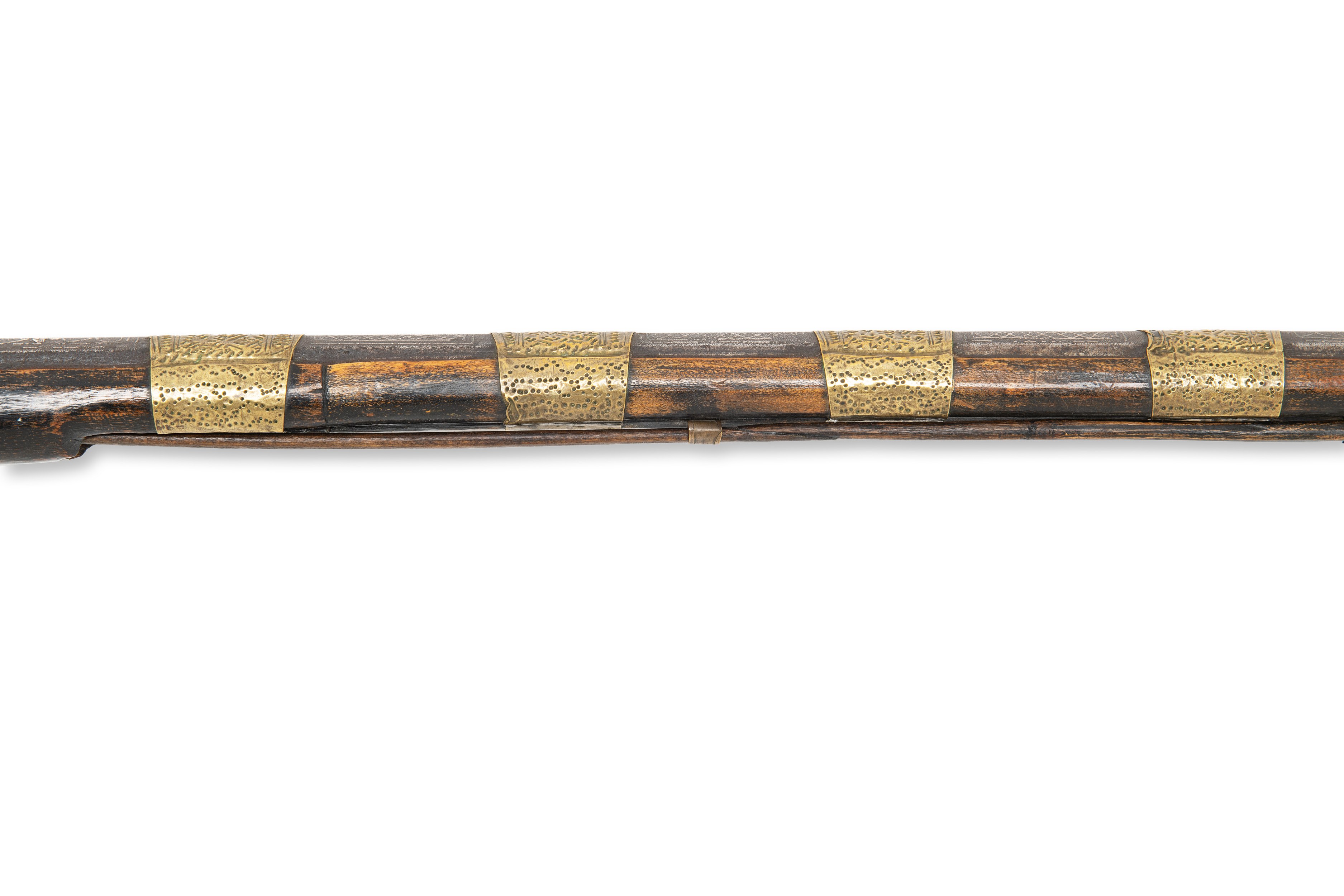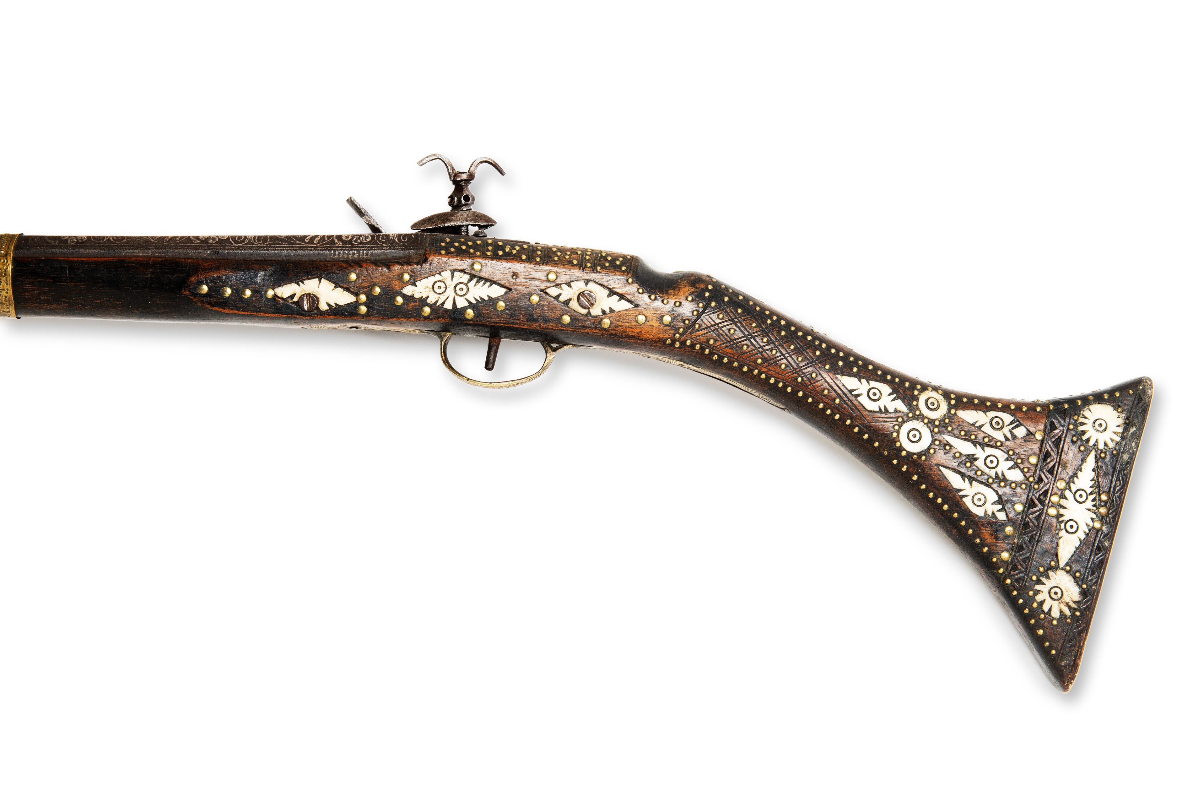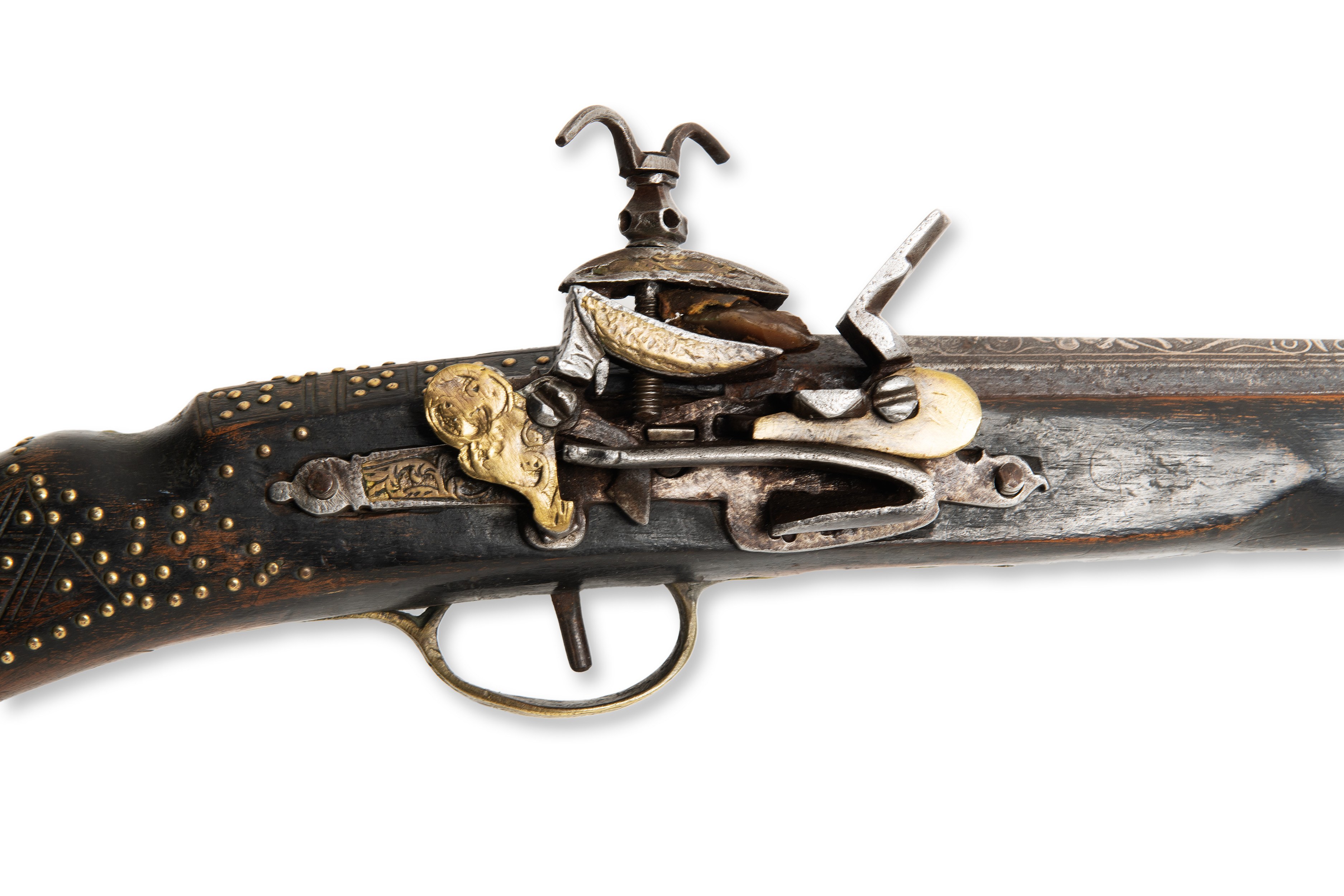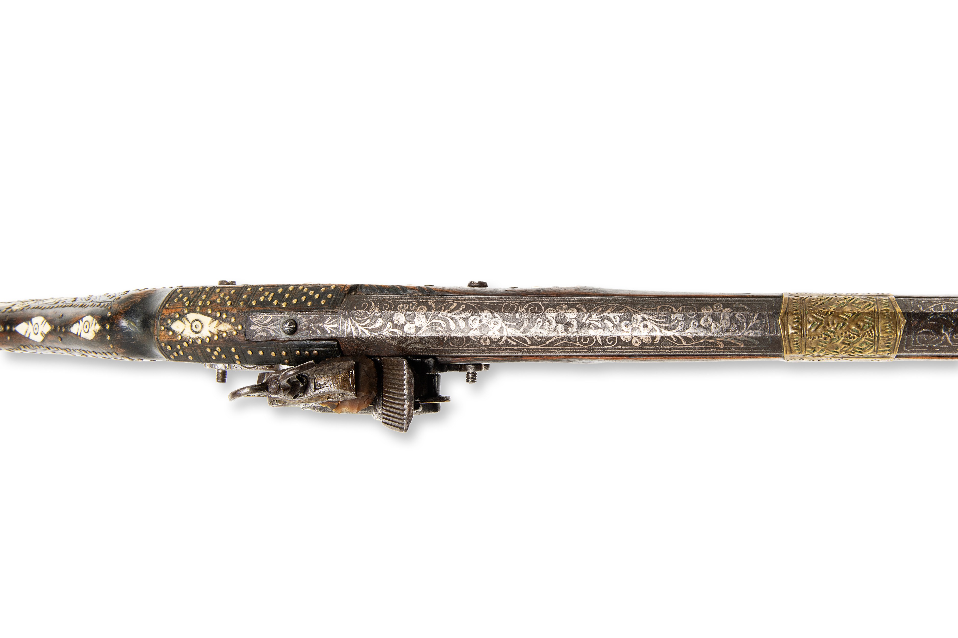 A 19th century flintlock Moukala rifle, originating in North Africa. The weapon is in original condition, with a period patina that gives it a historical character. The barrel is richly decorated with silver, which is typical of the regional decorations and highly valued details of this period.***IMPORTANT NOTICE***