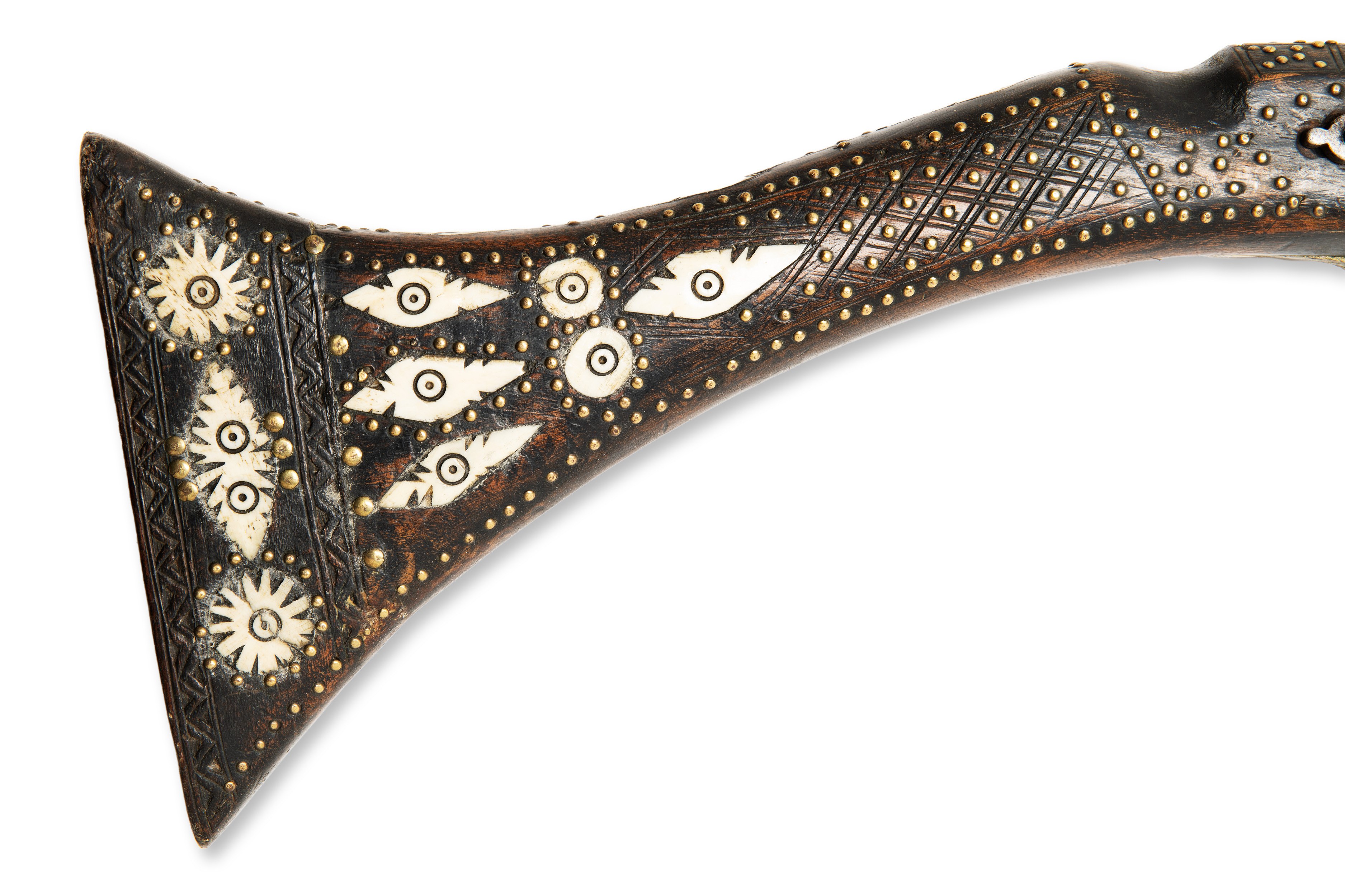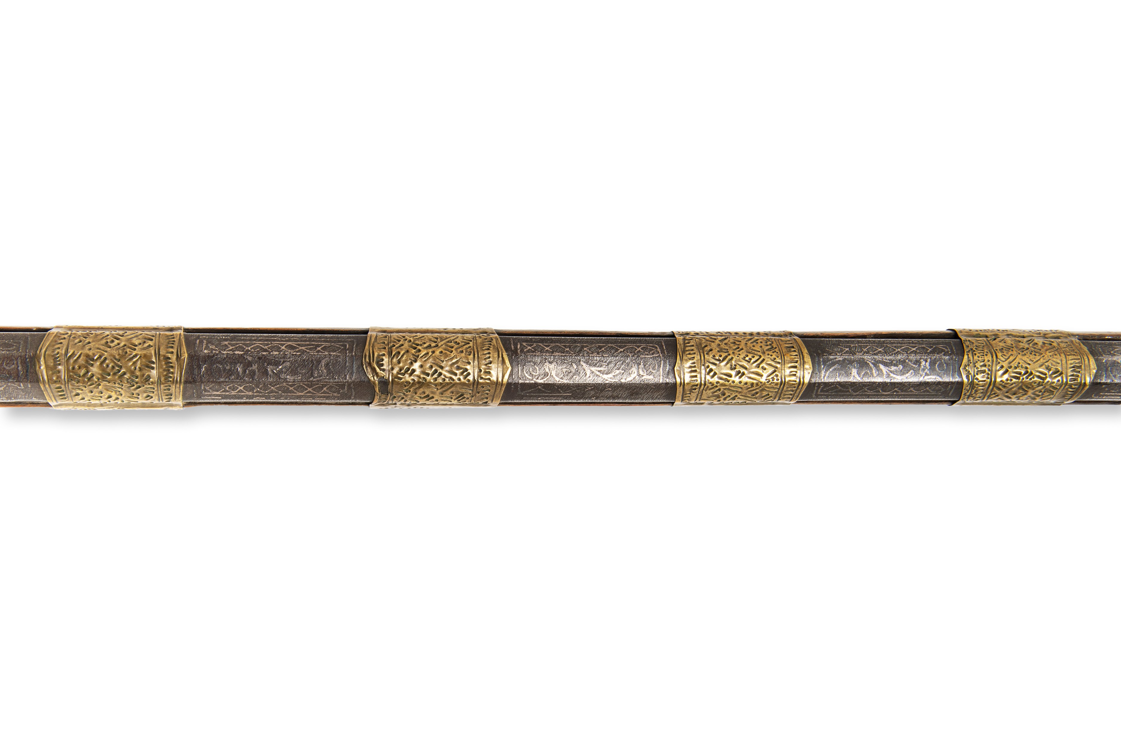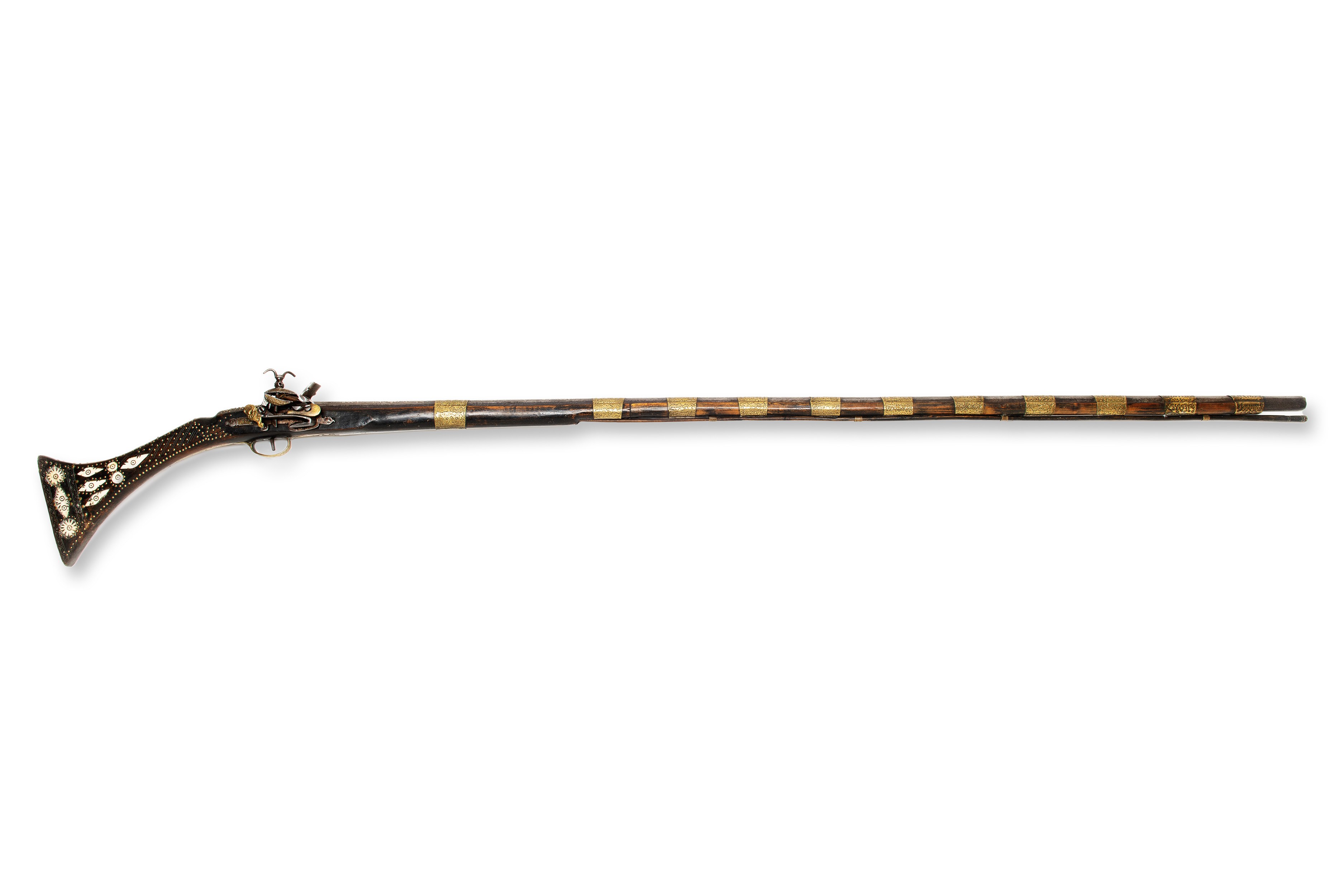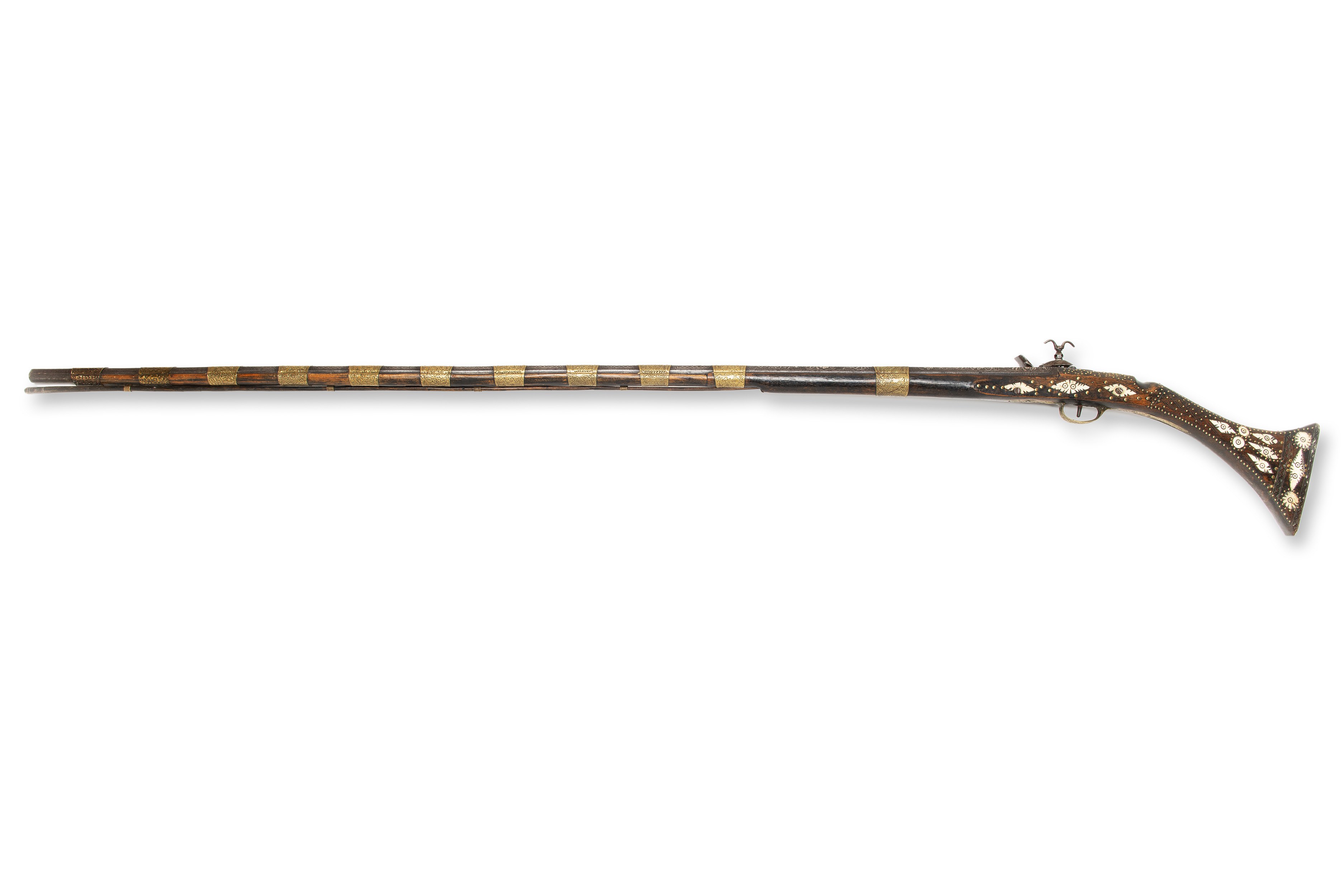 A 19th century flintlock Moukala rifle, originating in North Africa. The weapon is in original condition, with a period patina that gives it a historical character. The barrel is richly decorated with silver, which is typical of the regional decorations and highly valued details of this period.***IMPORTANT NOTICE***