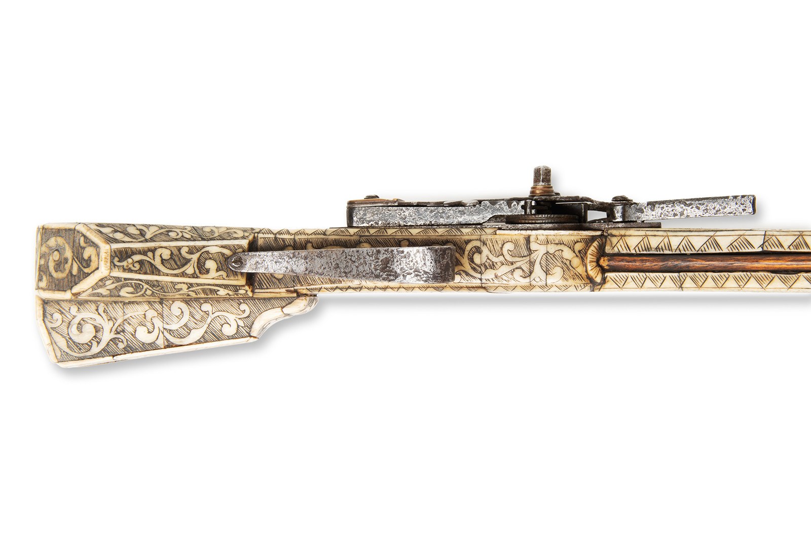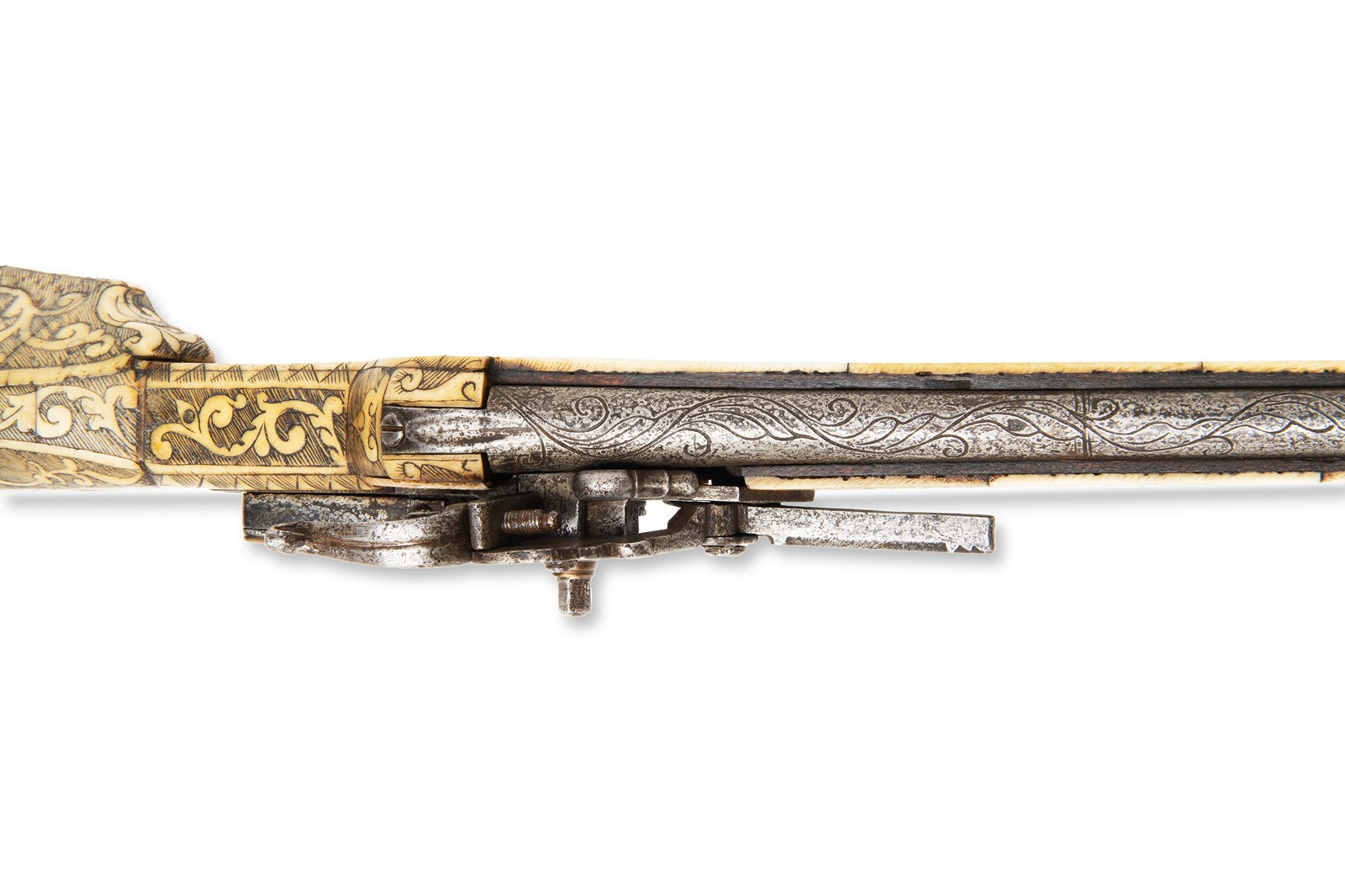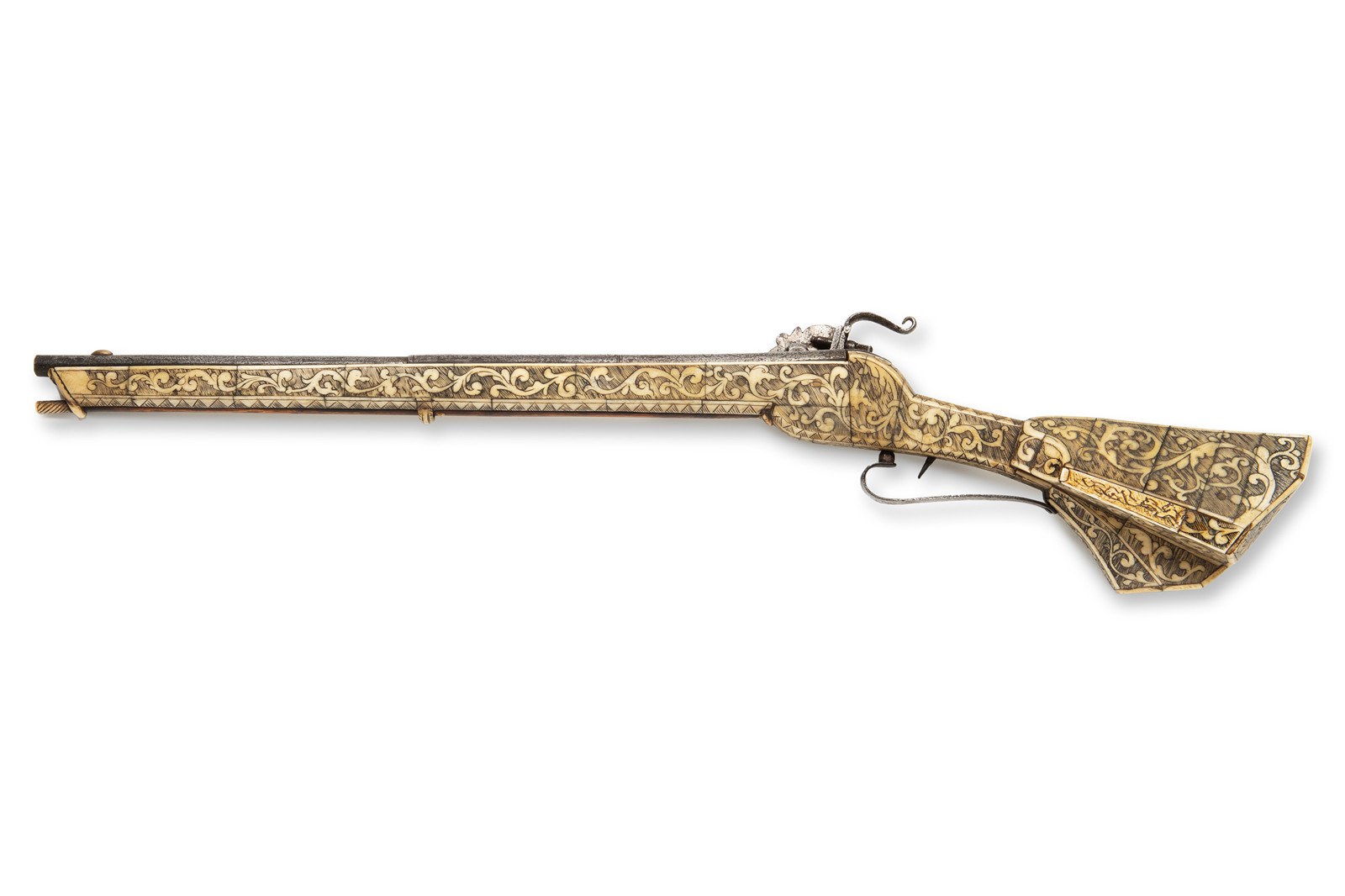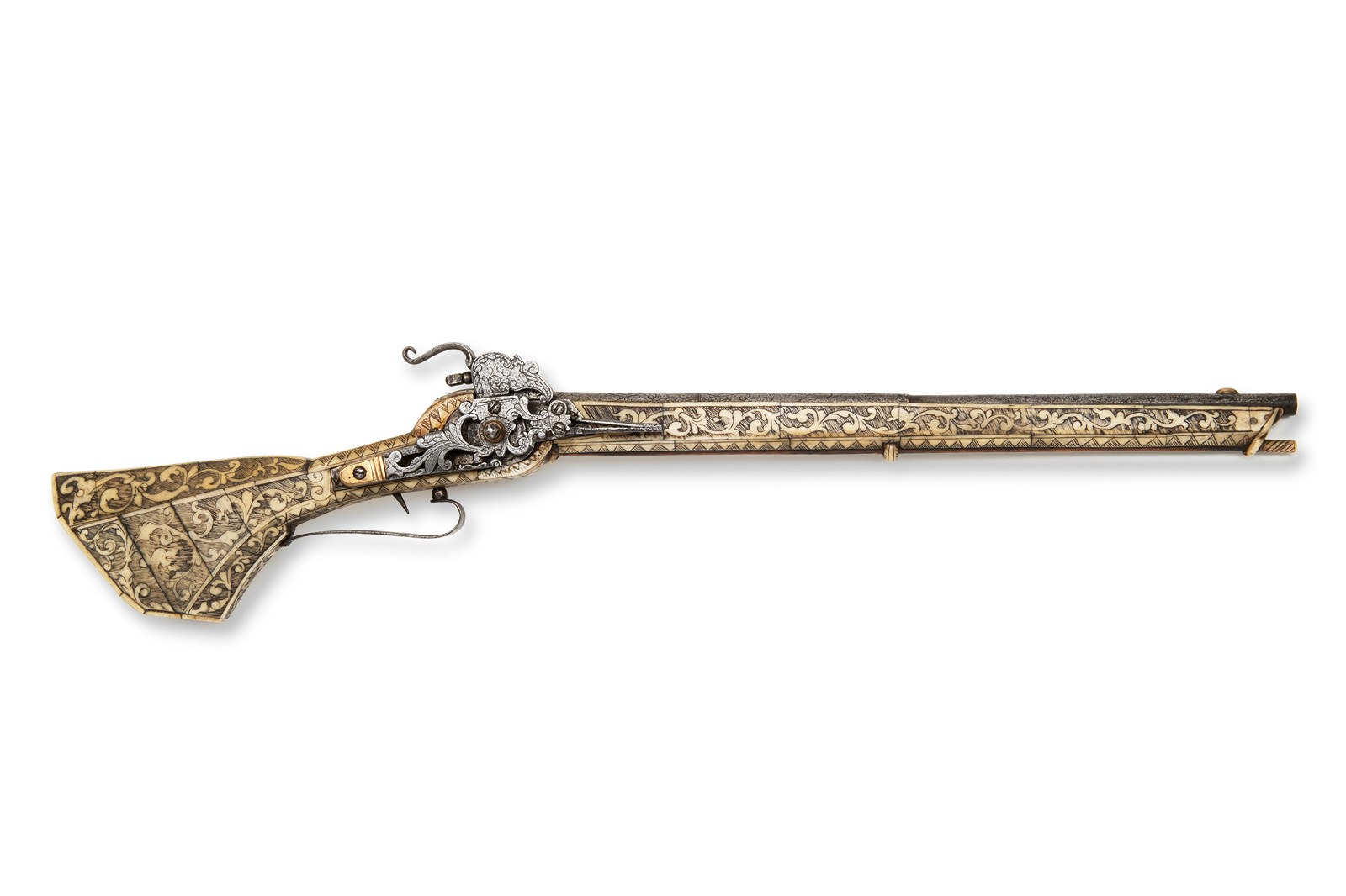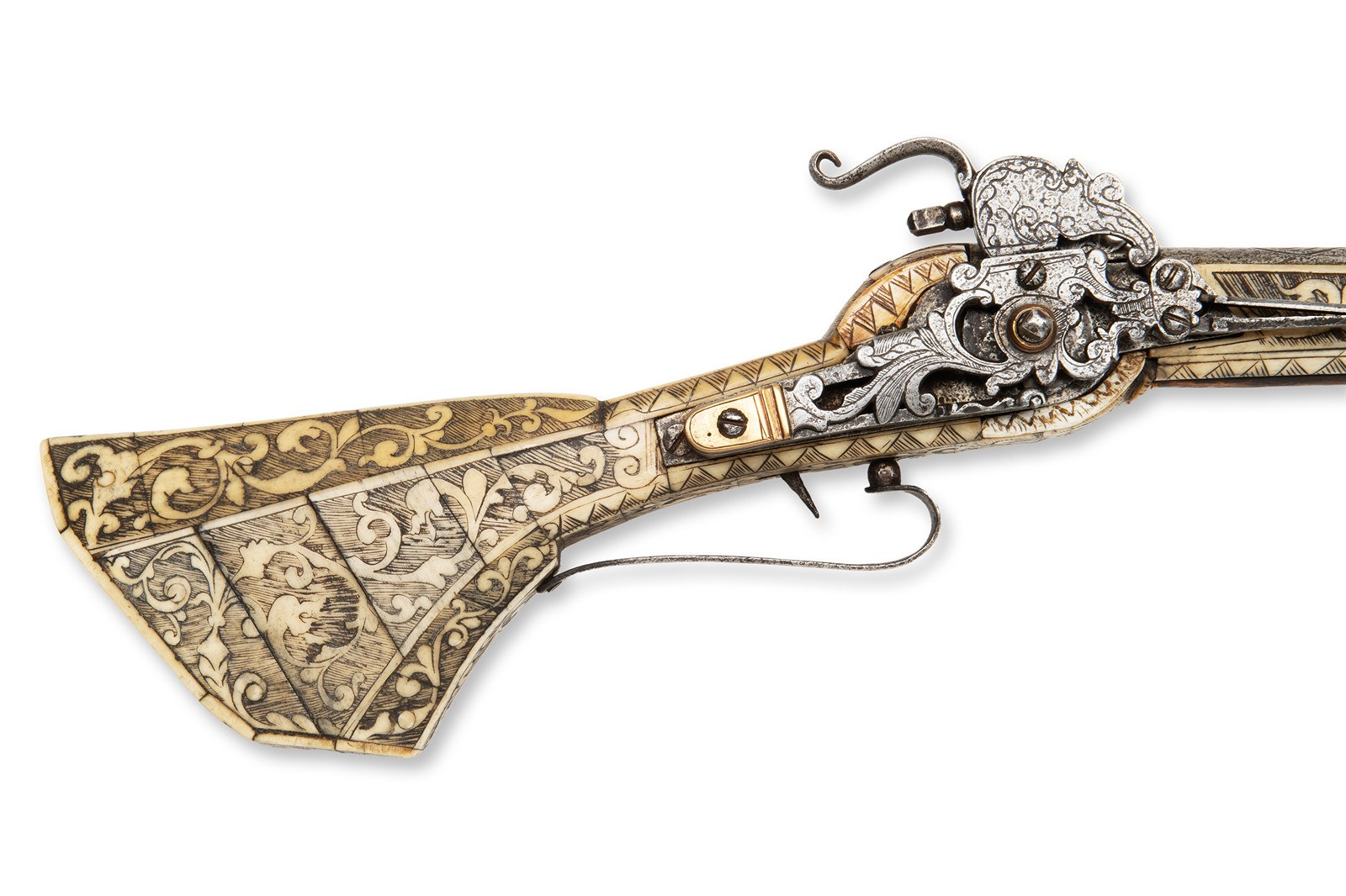 A wheel carbine from the end of the 19th century, the size corresponding to a longer pistol. The stock is decorated all over with engraved bone, which is characteristic of richly decorated weapons of the time. The barrel bore is smooth, which is convenient for accurate shooting. In two places, parts of the bones have been replaced, indicating repairs and maintenance of the weapon during its use.***IMPORTANT NOTICE***