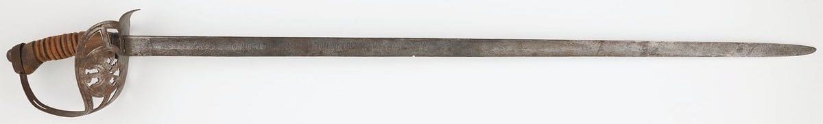 Stal, drewno, dł. cłk. 95,5, głowni 82 cm Na głowni panoplia, napis: 1 G. D. Rgt. Königin Victoria von Groβbritannien & Irland Puncowanie: głowa króla i rycerza / W.K. & Co Na kabłąku pruski orzeł Cena wywoławcza 1000 Estymacja 1200 - 1400 zapytaj o obiekt
