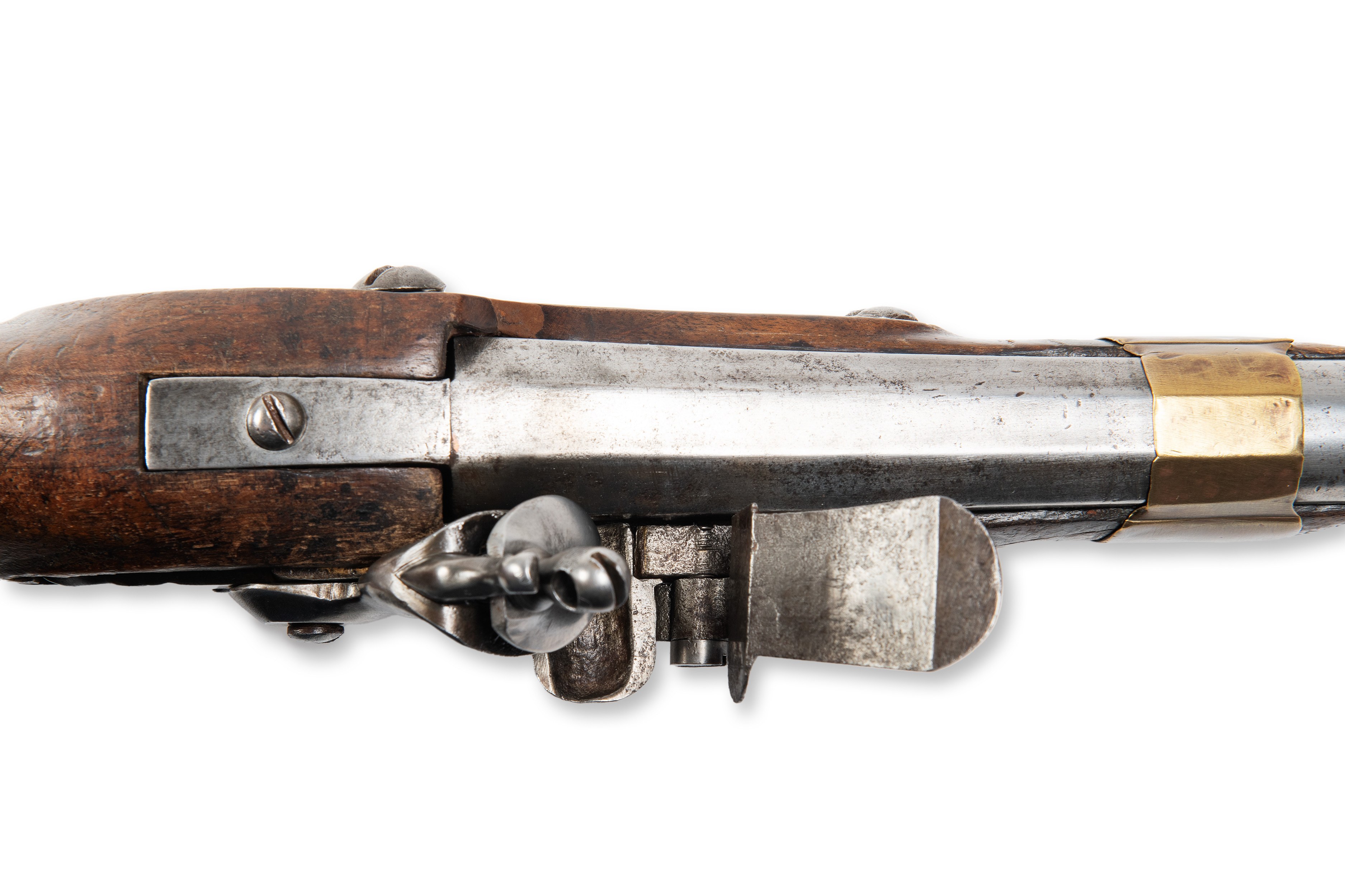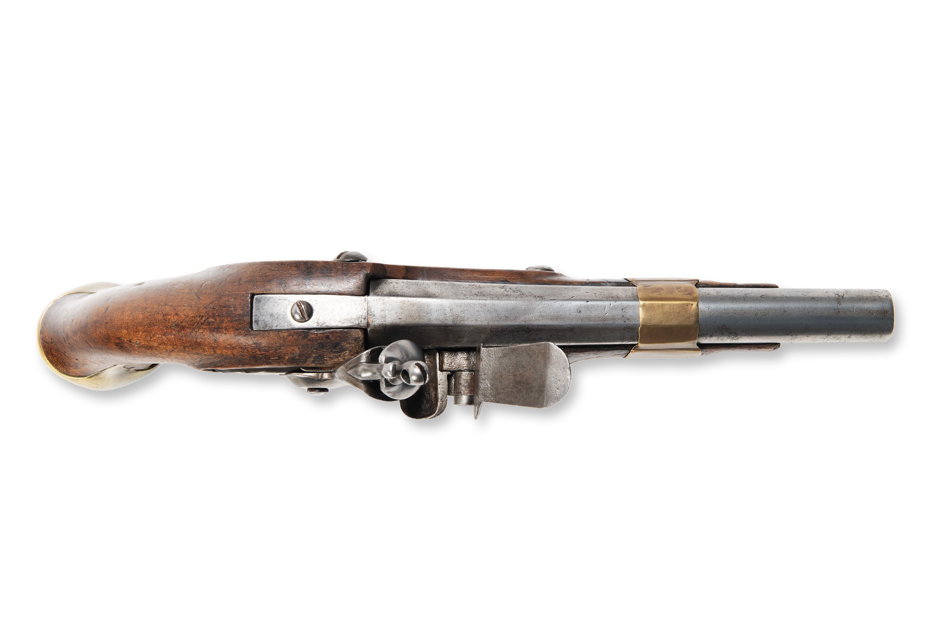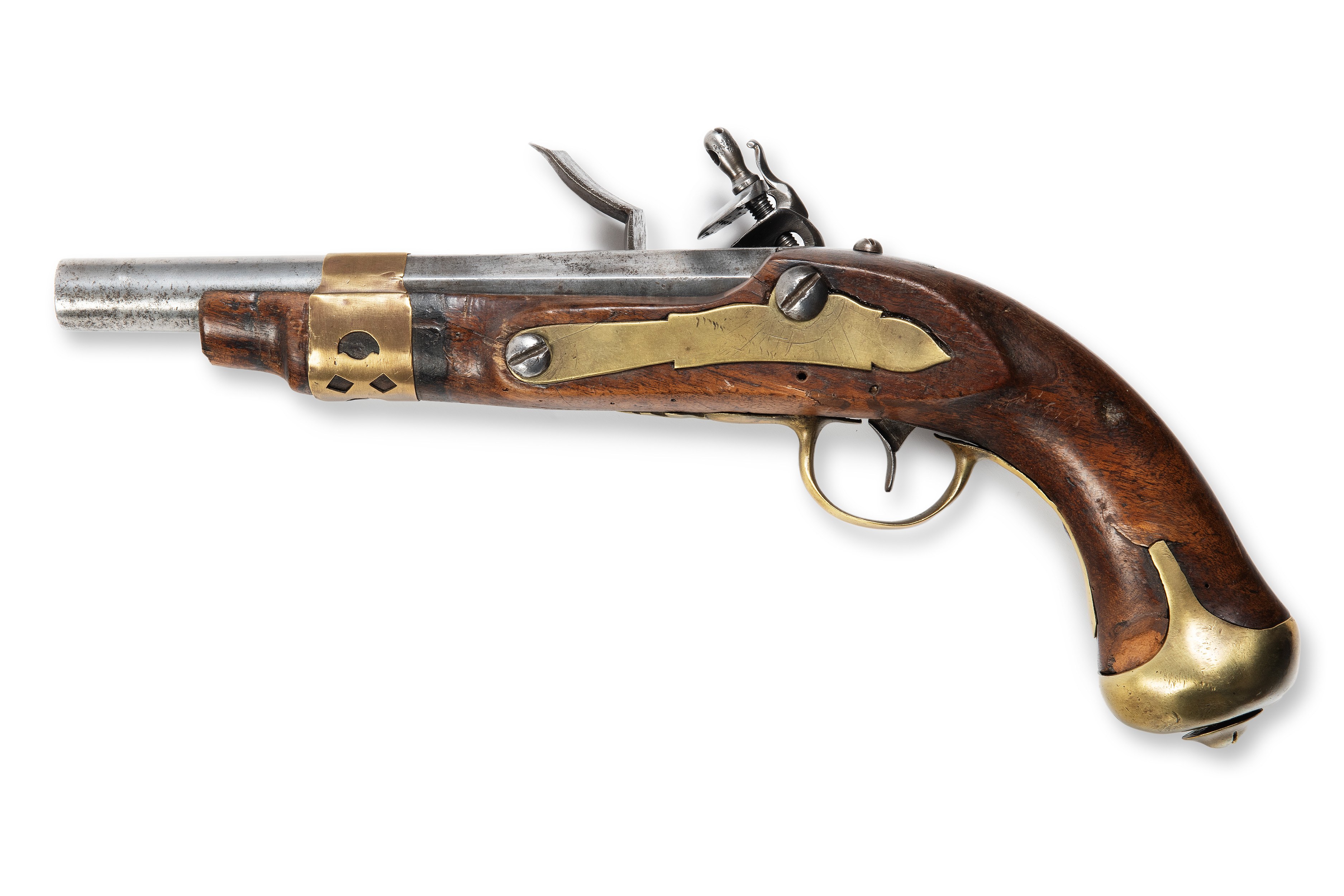 A flintlock pistol from the turn of the 18th and 19th centuries, originally military, but later shortened. The gun has been modified and has a non-original receiver. This type of pistol was commonly used in the armies of Western Europe at the time, with shortening and modifications often made for practical purposes or to adapt to a new function.***IMPORTANT NOTICE***