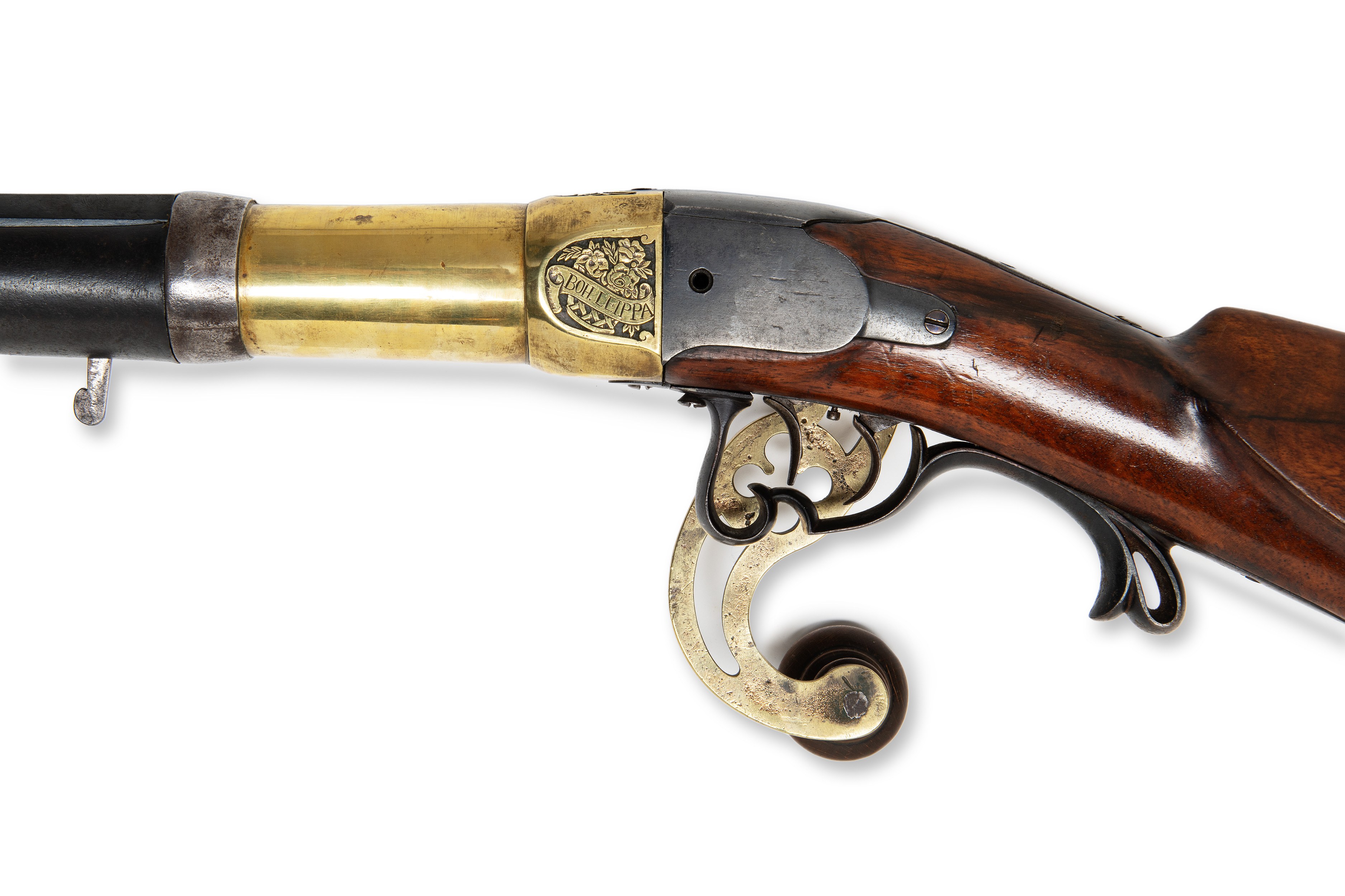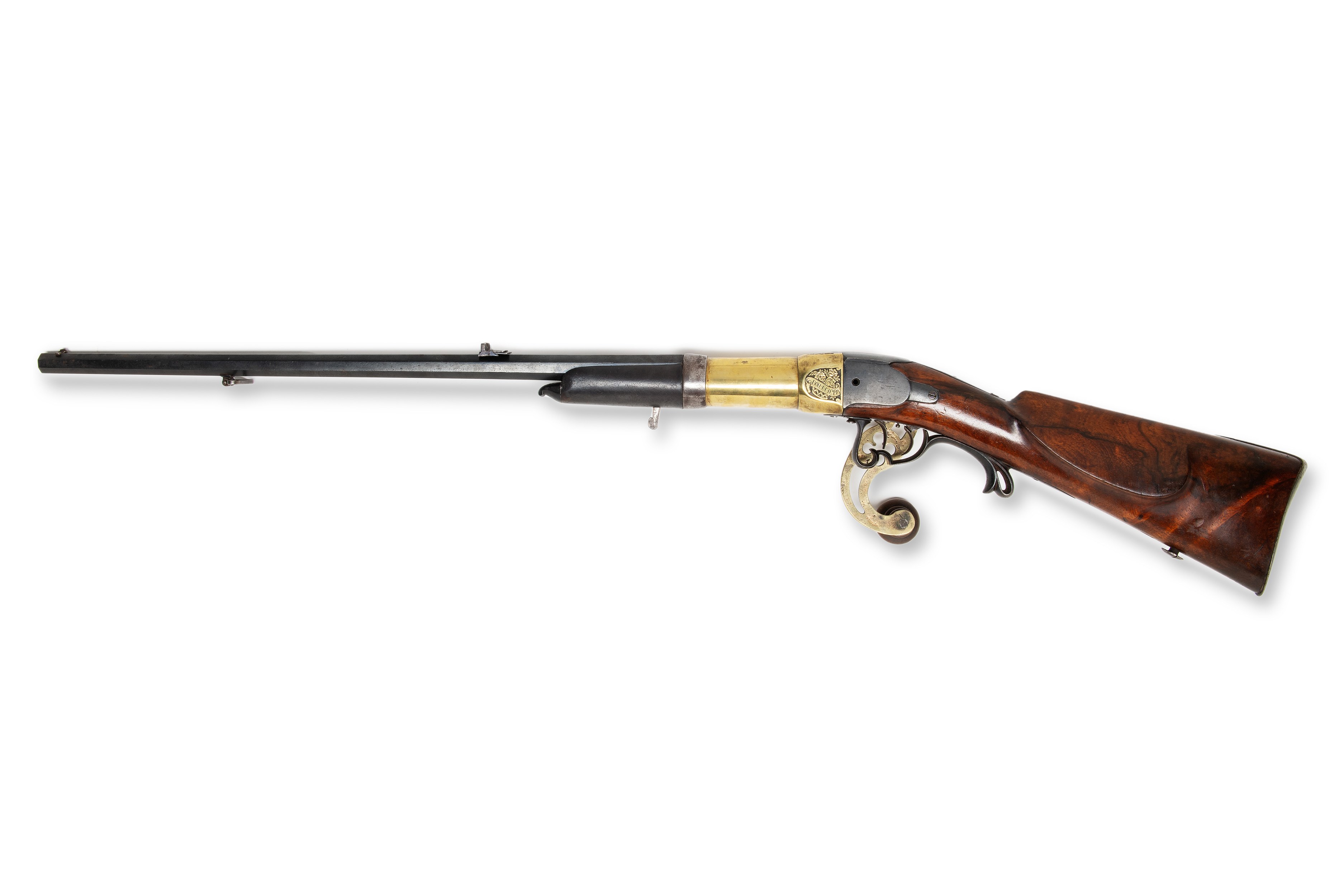 Air rifle from the mid-19th century, made in Česká Lípa, Bohemia. The barrel is signed "Rutte J./Boh. Leippa (Česká Lípa)". The gun shows traces of removed corrosion on the iron forend, which is common in older airguns of this type. This model was probably intended for sports and target shooting.***IMPORTANT NOTICE***