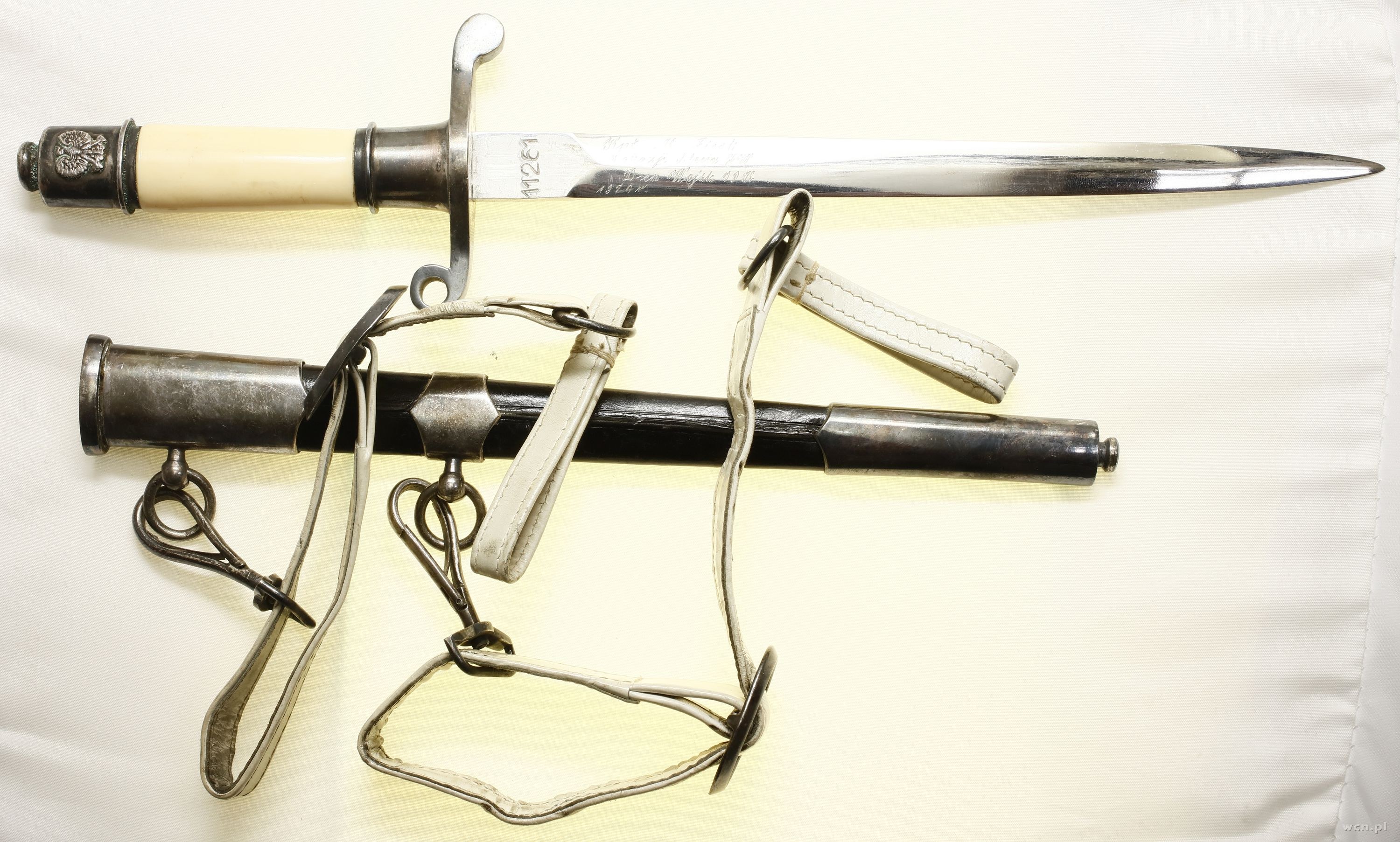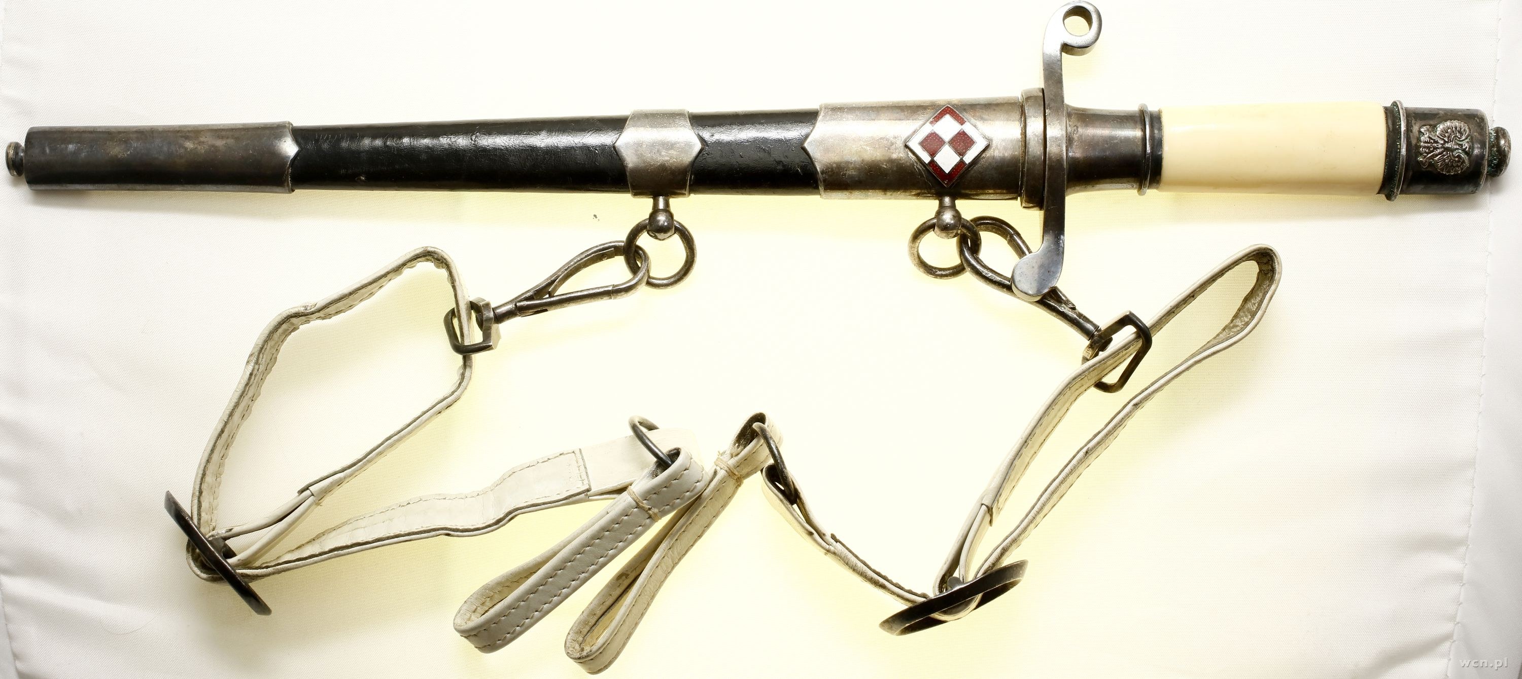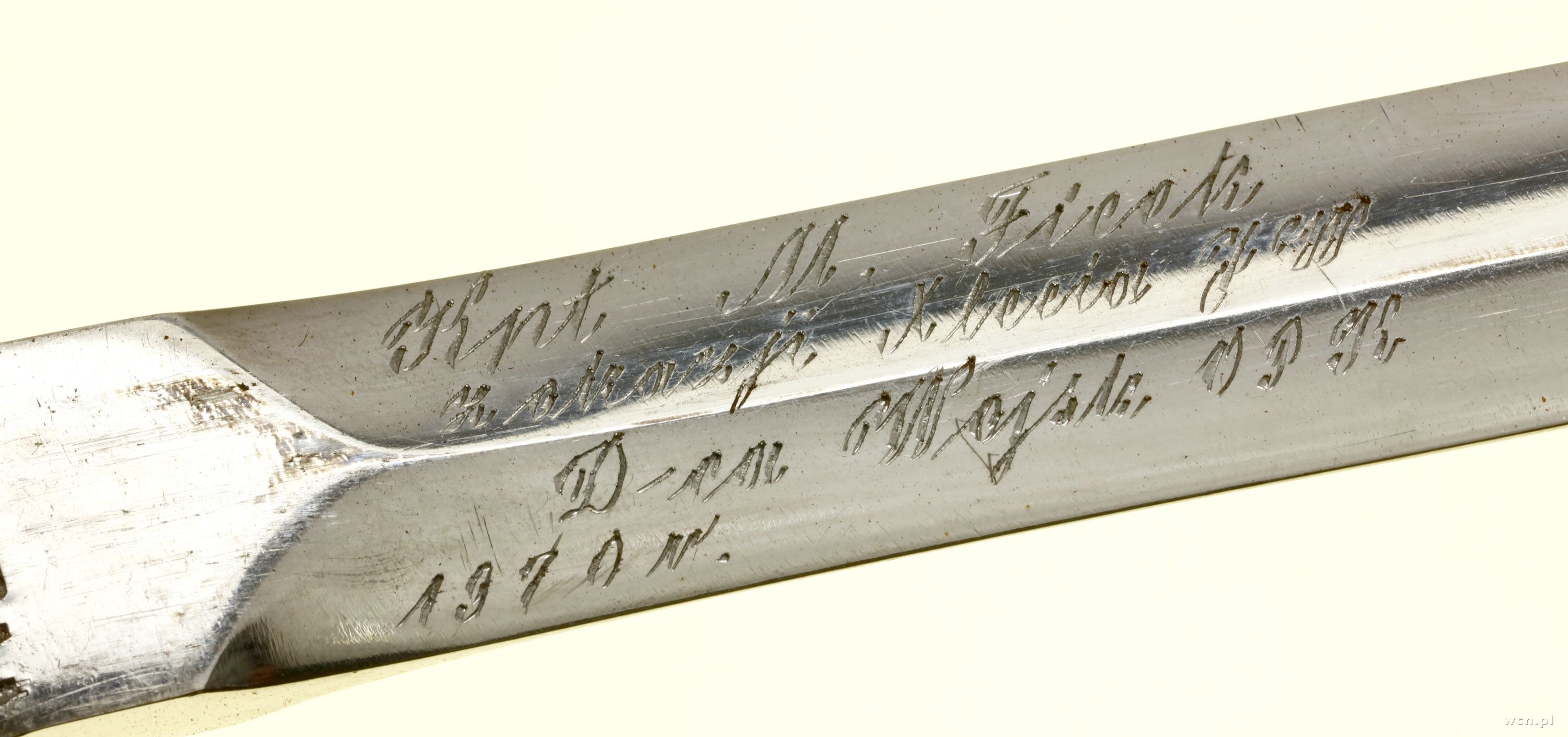 prosta, obosieczna głownia, przy jelcu nabity numer 11261, na głowni wygrawerowane Kpt. M. Ficek / z okazji Xlecia JW / D-ca Wojsk OPK / 1970 r., na głowicy rękojeści przymocowany orzeł państwowy, pochwa częściowo obciągnięta czarną skórą, przy dławiku przymocowana lotnicza szachownica, do pochwy przypięte dwa rapcie z białego skaju
