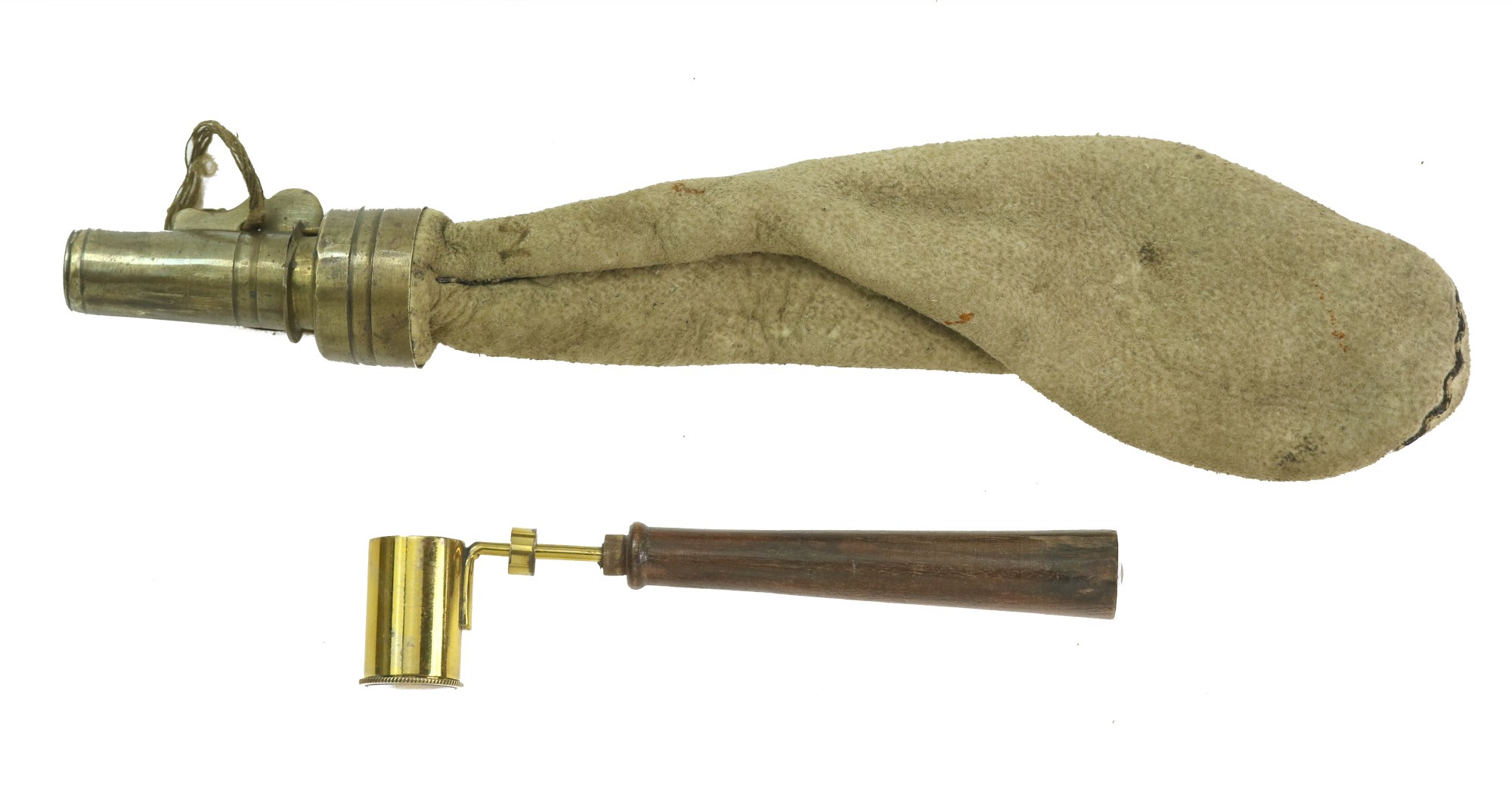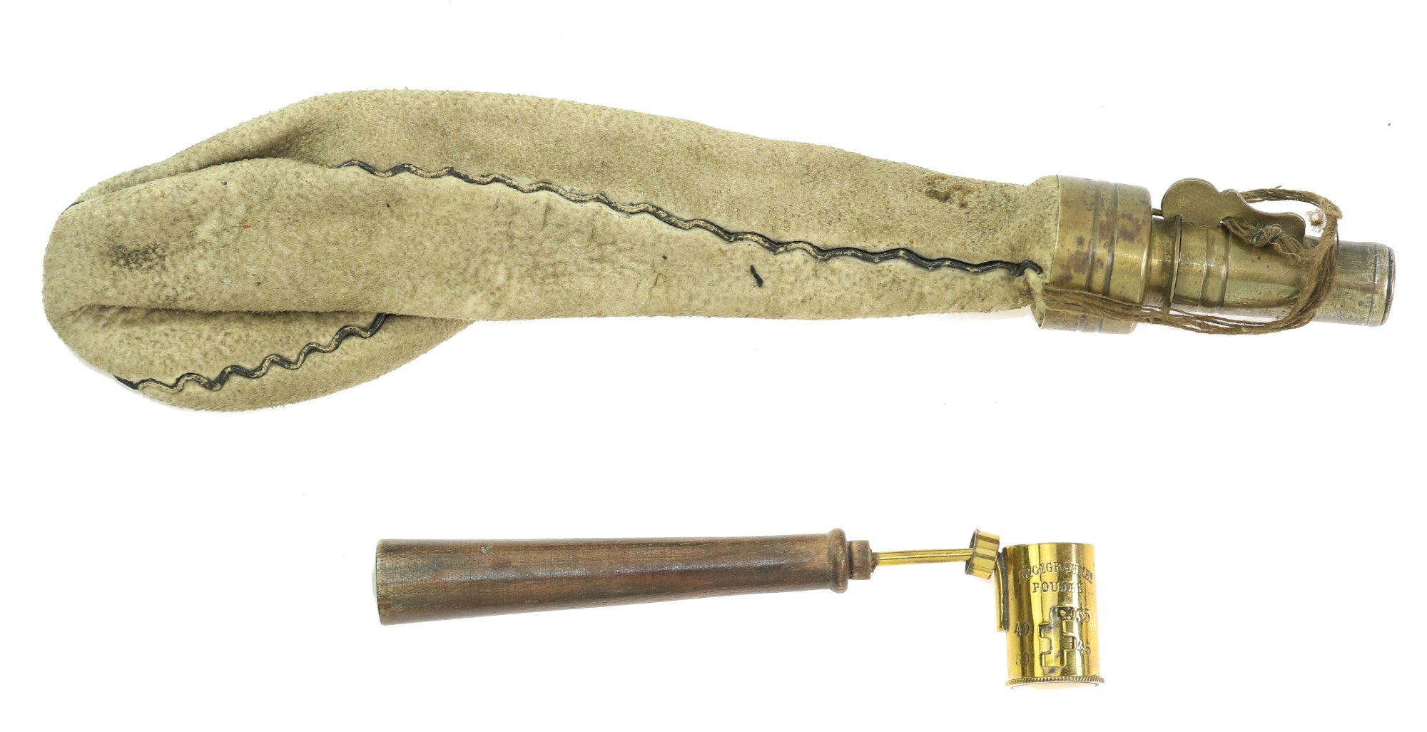 Zestaw miarka prochowa oraz śrutownica skórzana z mosiężnym zaworem. XIX w. Stan dobry.