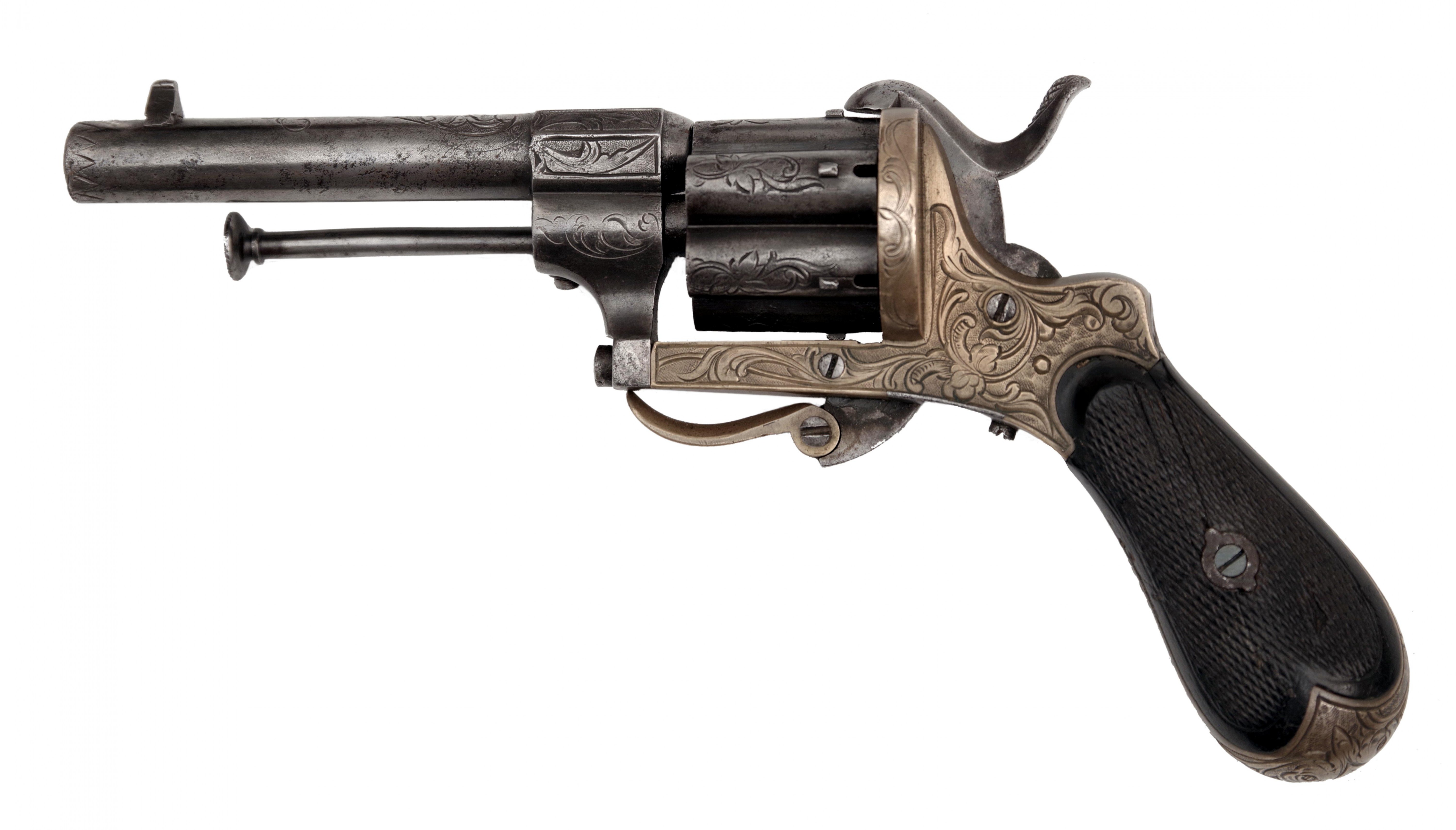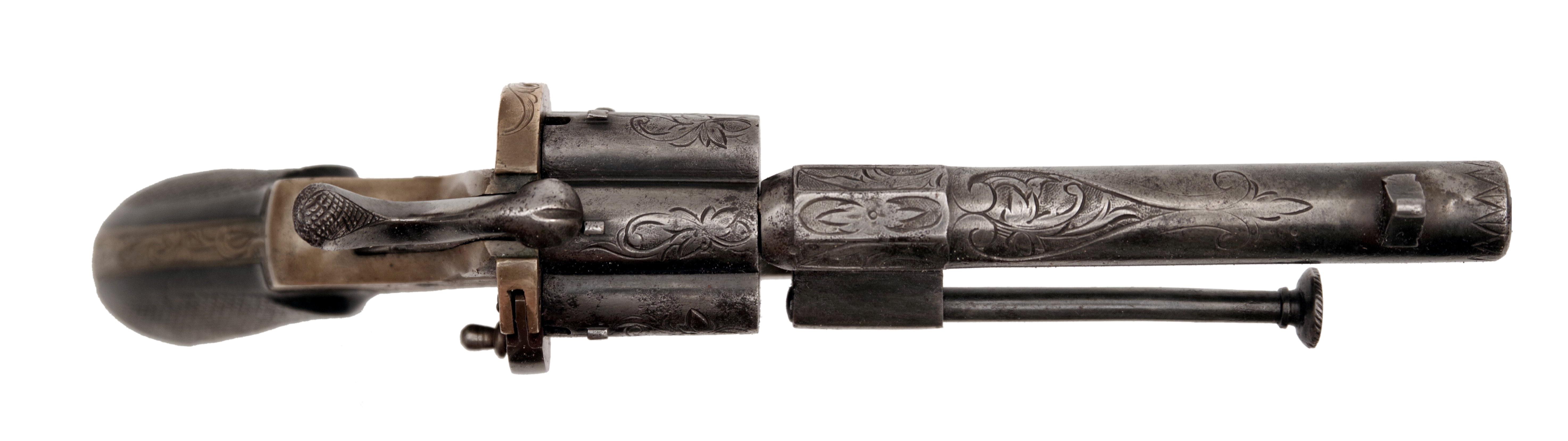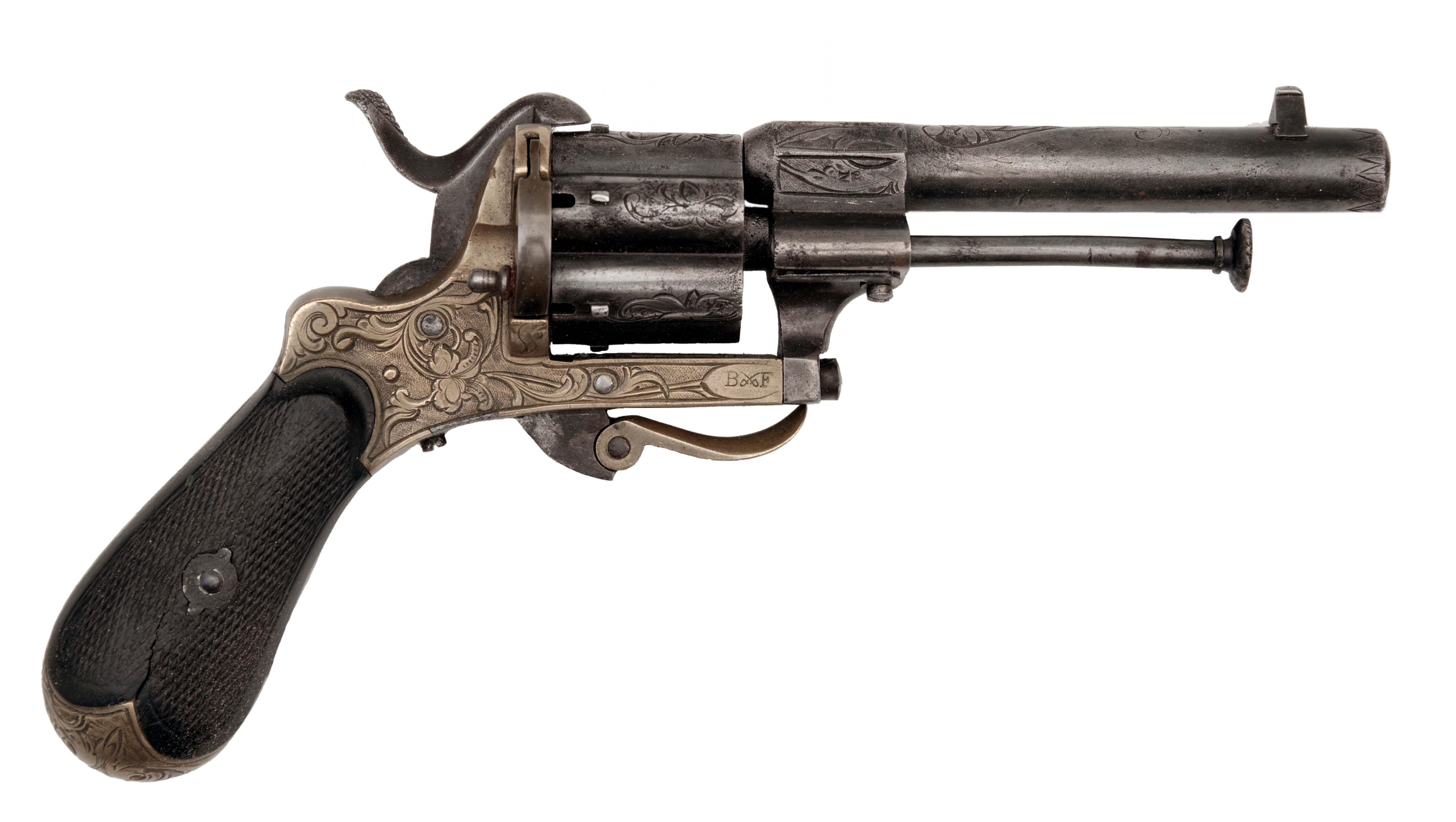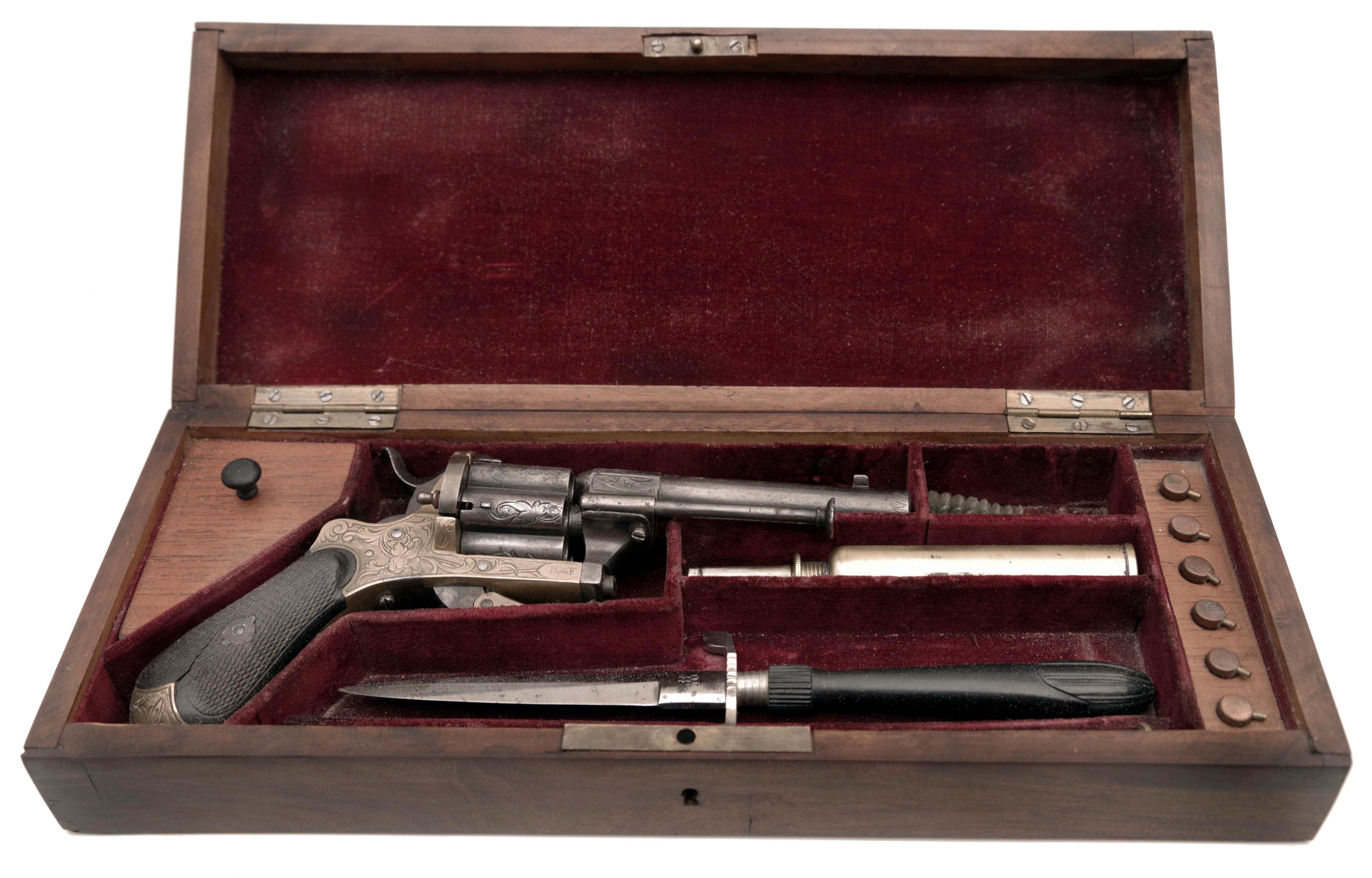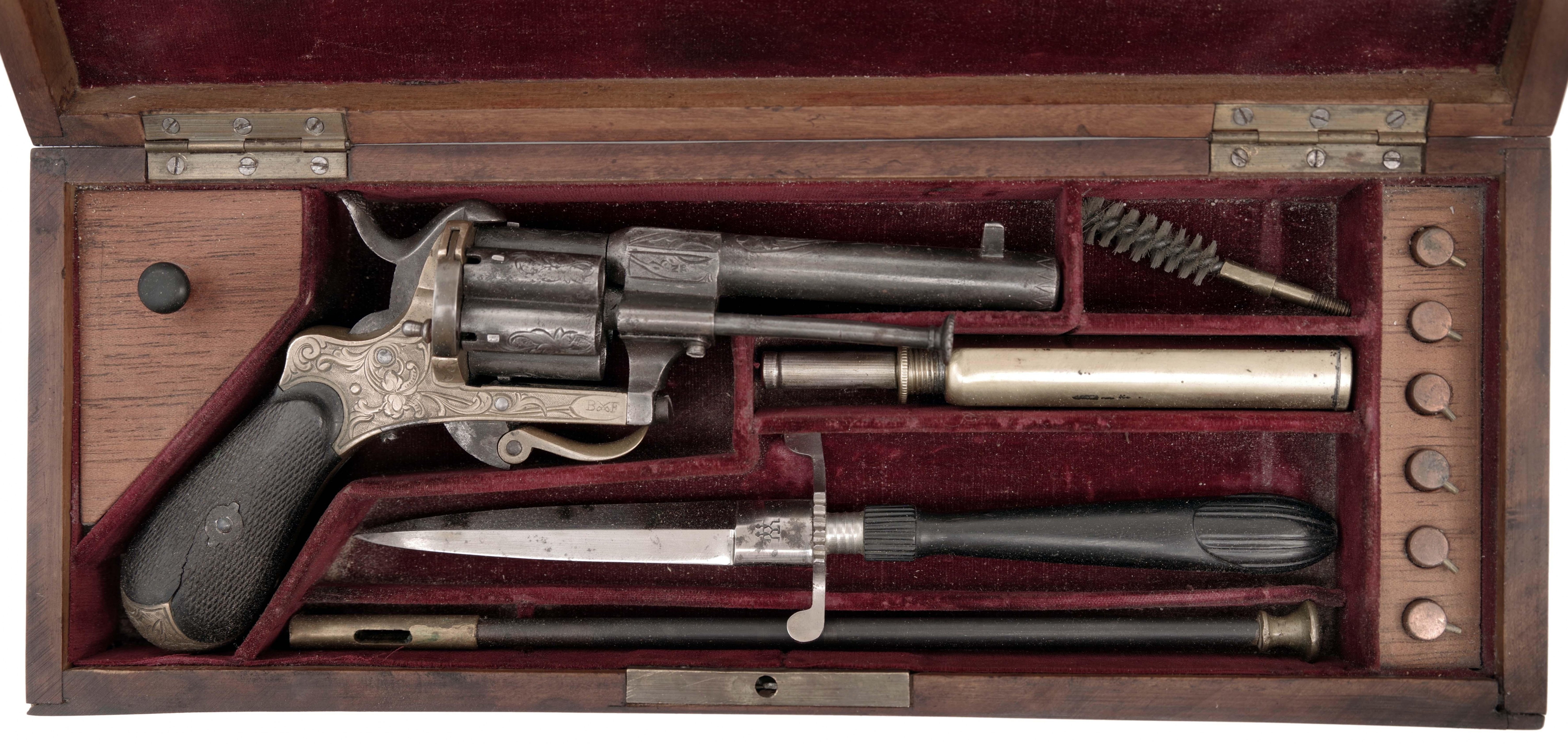 Cylindrická hněděná hlaveň ráže 7 mm s rytým florálním dekorem má krátký oktagonální úsek v blízkosti válce, zde se nachází vpravo belgická inspektorská značka "N" pod korunkou. Florálně zdobený válec s oddělenými komorami, rytý mosazný rám, sklopná spoušť, střenky (praskliny) z ebenového dřeva opatřené rybinou. Vpravo na rámu značka "BF", iniciály odděleny zkříženými šavlemi. Belgie, Lutych, Bayet Frères, 2. pol. 19. století, délka 19 cm. Uloženo ve dřevěné kazetě s příslušenstvím a šesti originálními náboji. Stav 2+, Cylindrical browned barrel in 7 mm calibre with engraved floral decoration has a short octagonal part near the cylinder, where the Belgian inspector's mark "N" under a crown can be found on the right side. Cylinder with floral decoration and separate chambers, engraved brass frame, folding trigger, checkered scales (with cracks) made of ebony wood. On the right side of the frame are initials "BF" with crossed sabres in between the letters. Belgium, Lutych, Bayet Freres, 2nd half of the 19th century, length 19 cm. Stored inside a wooden case with accessories and six original cartridges.Condition 2+