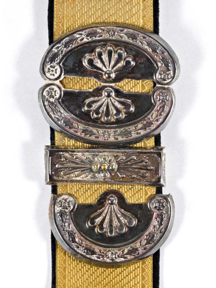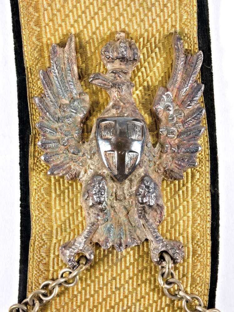 Rare General Staff bandolier, gold metallic fabric band with silver metal applications, metal case with silver eagle, gold fringed shoulder straps. Very rare; excellent condition.