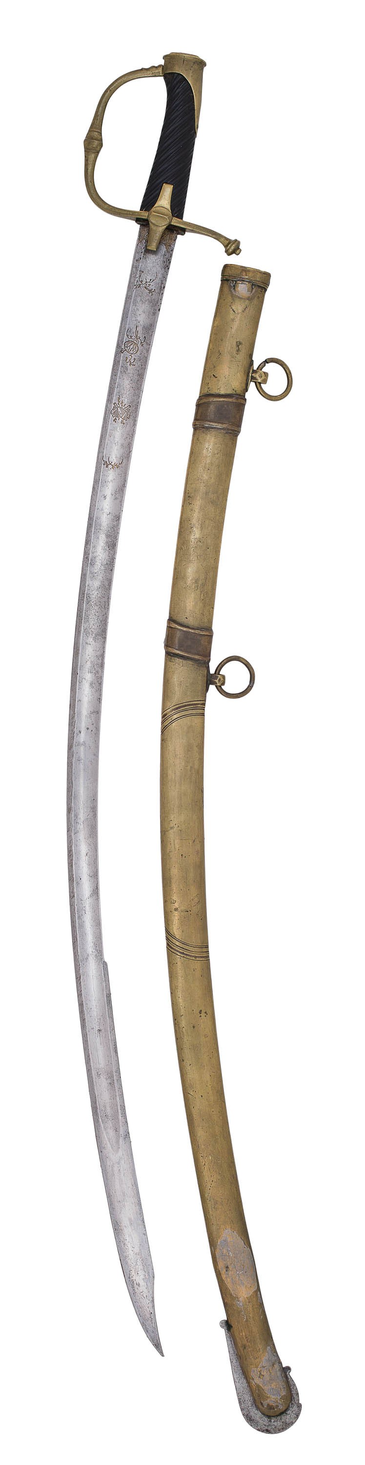R ę k o j e ś ć zamknięta, oprawa mosiężna. Jelec esowaty, z płasko zakończonymi wąsami. Tylne ramię jelca zakończone dwoma owalnymi guzami, przednie, dwukrotnie łukowato wygięte, tworzy kabłąk dochodzący do głowicy i połączony z trzpieniem głowni. W połowie kabłąka, po obu stronach, owalny guz z ością, podobnie jak na krzyżu jelca. Trzon rękojeści ze szlachetnego, ukośnie żłobionego drewna, dołem osadzony przy jelcu w wydrążonych gniazdach na górne wąsy, górą krótkim, fazowanym kapturkiem zanitowanym na owalnej podkładce - trzpieniem głowni. G ł o w n i a stalowa, polerowana, o umiarkowanej krzywiźnie. Profilowana obustronnie bez progu w jedną szeroką bruzdę, wypełniającą niemal całą powierzchnię płazów. Szlif bruzdy sięgający połowy długości obosiecznego pióra z młotkiem. Sztych z pazurem. Pod nasadą i na wysokości zastawy, po obu stronach, trawiona dekoracja charakterystyczna dla głowni z przełomu XVIII i XIX wieku. Między jelcami a nasadą skórzana podkładka. P o c h w a mosiężna, ze stalową, asymetryczną ostrogą. Dwa ruchome koluszka w tulejkach osadzonych na owalnych podkładkach na grzbiecie pochwy. Dodatkowo dwa profilowane pierścienie z owalnymi krawędziami. Kanelowana szyjka mocowana w płaszczu pochwy. Na wysokości pióra widoczne ślady starych napraw w warsztatach płatnerskich.