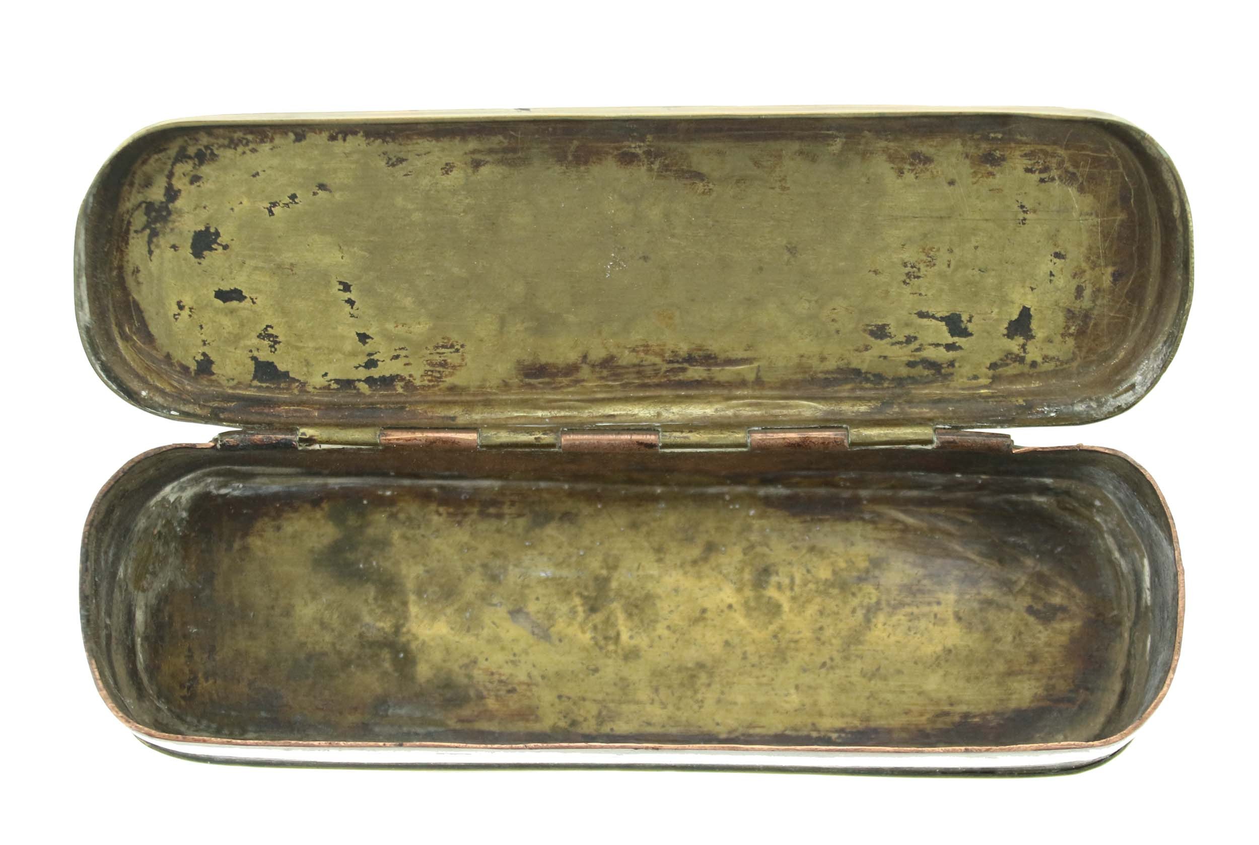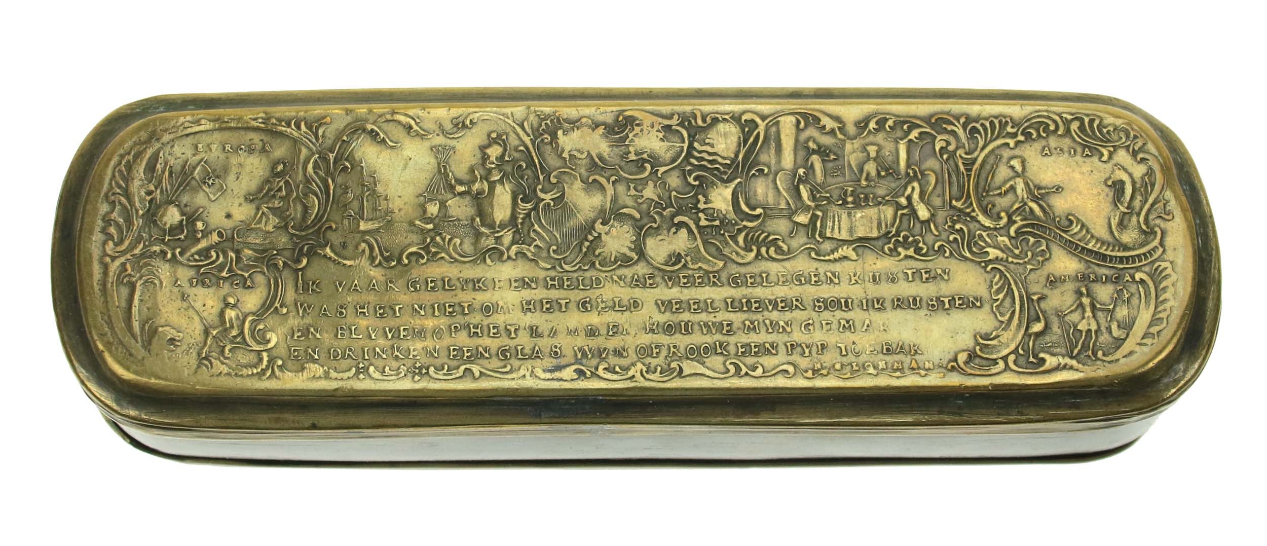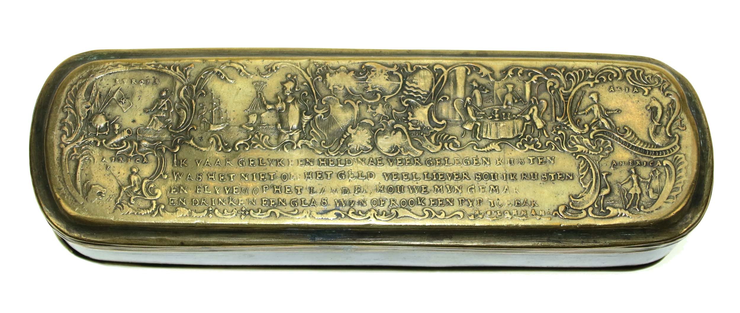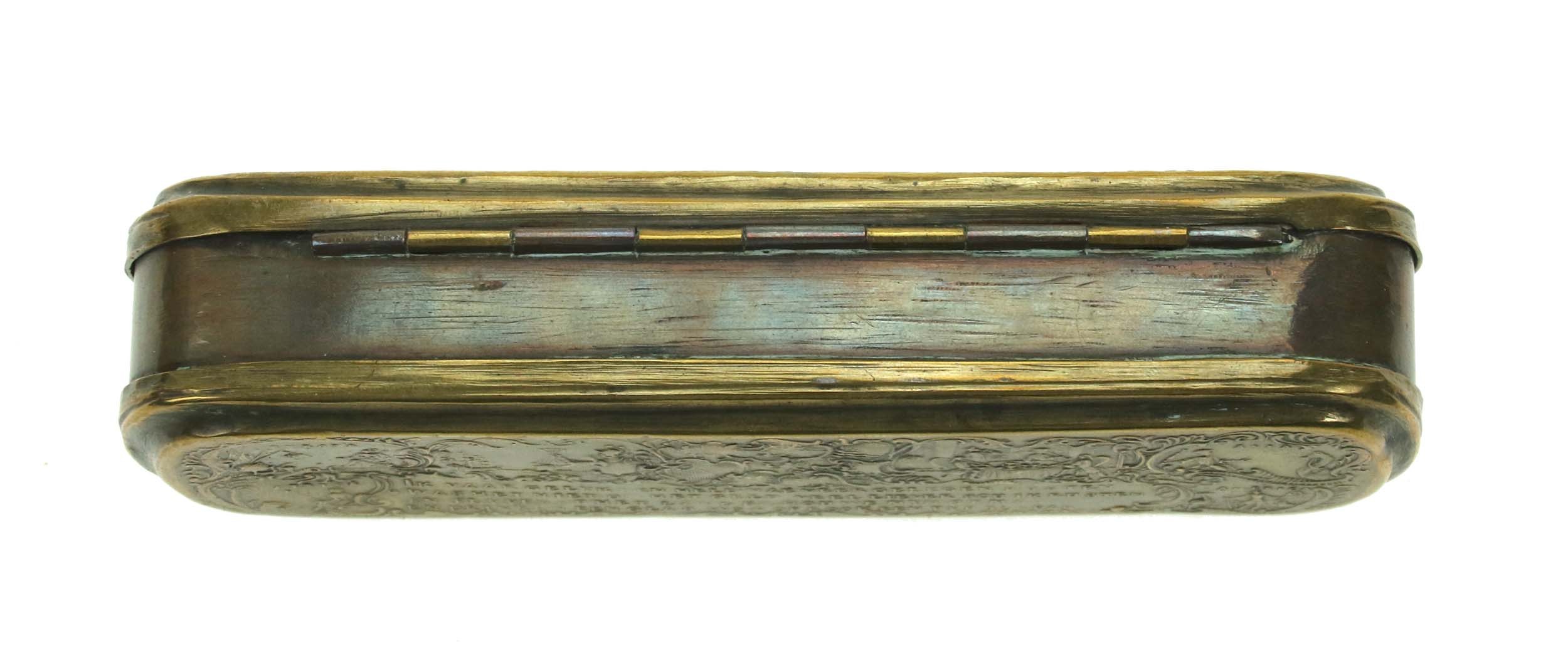 Tabakiera mosiężna, otwierana. Pokrywy dolna i górna z motywami dekoracyjnymi oraz napisami upamiętniającymi bitwy pod: Molwiz (10 kwietnia 1741, znana jako bitwa pod Małujowicami albo bitwa pod Mollwitz), Kesselsdorf (15 grudnia 1745 podczas drugiej wojny śląskiej), Lignitz (15 sierpnia 1760 pod Legnicą) i inne.