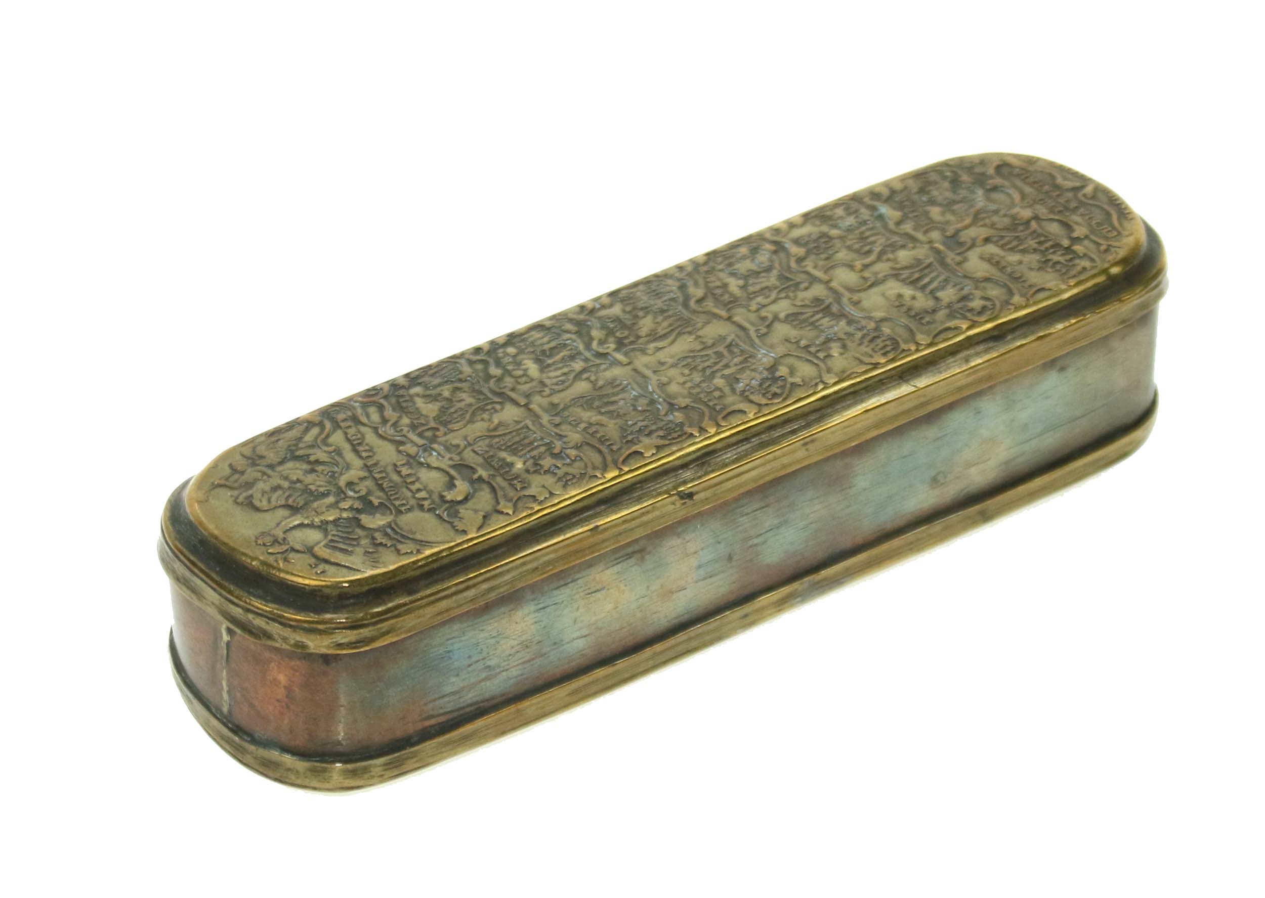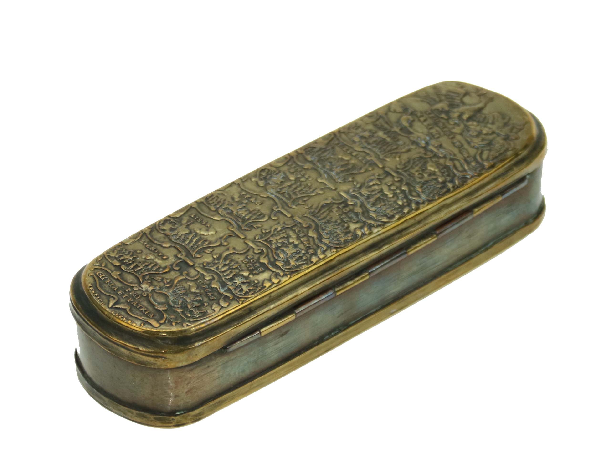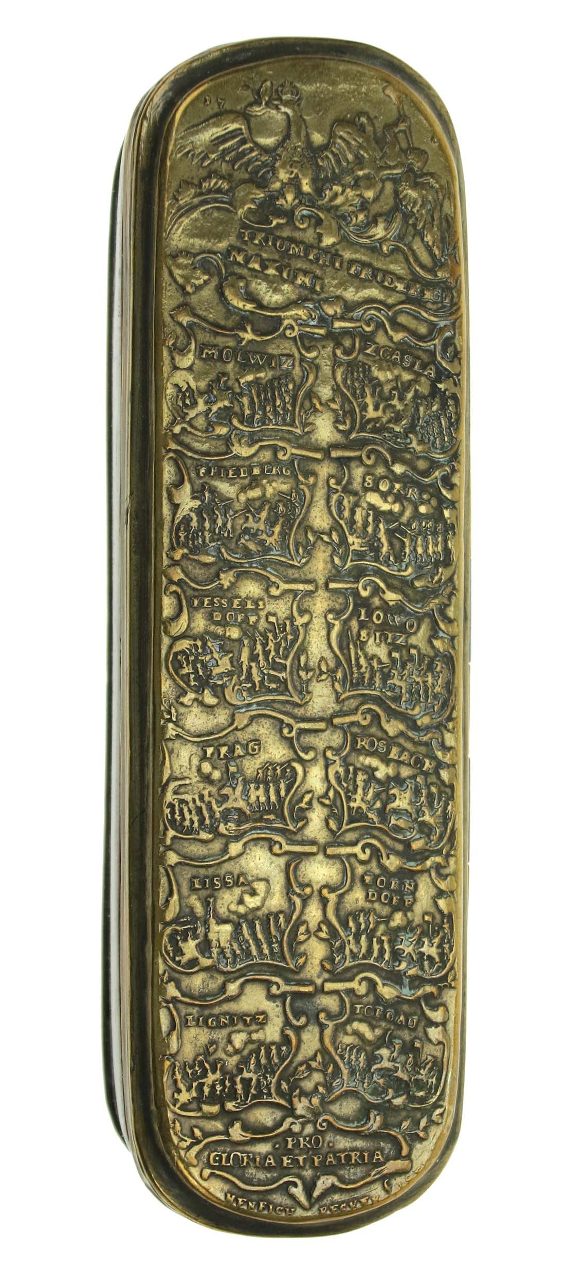 Pruska tabakiera wojskowa, XVIIIw., upamiętniająca liczne zwycięstwa wojsk pruskich podczas wojny siedmioletniej.