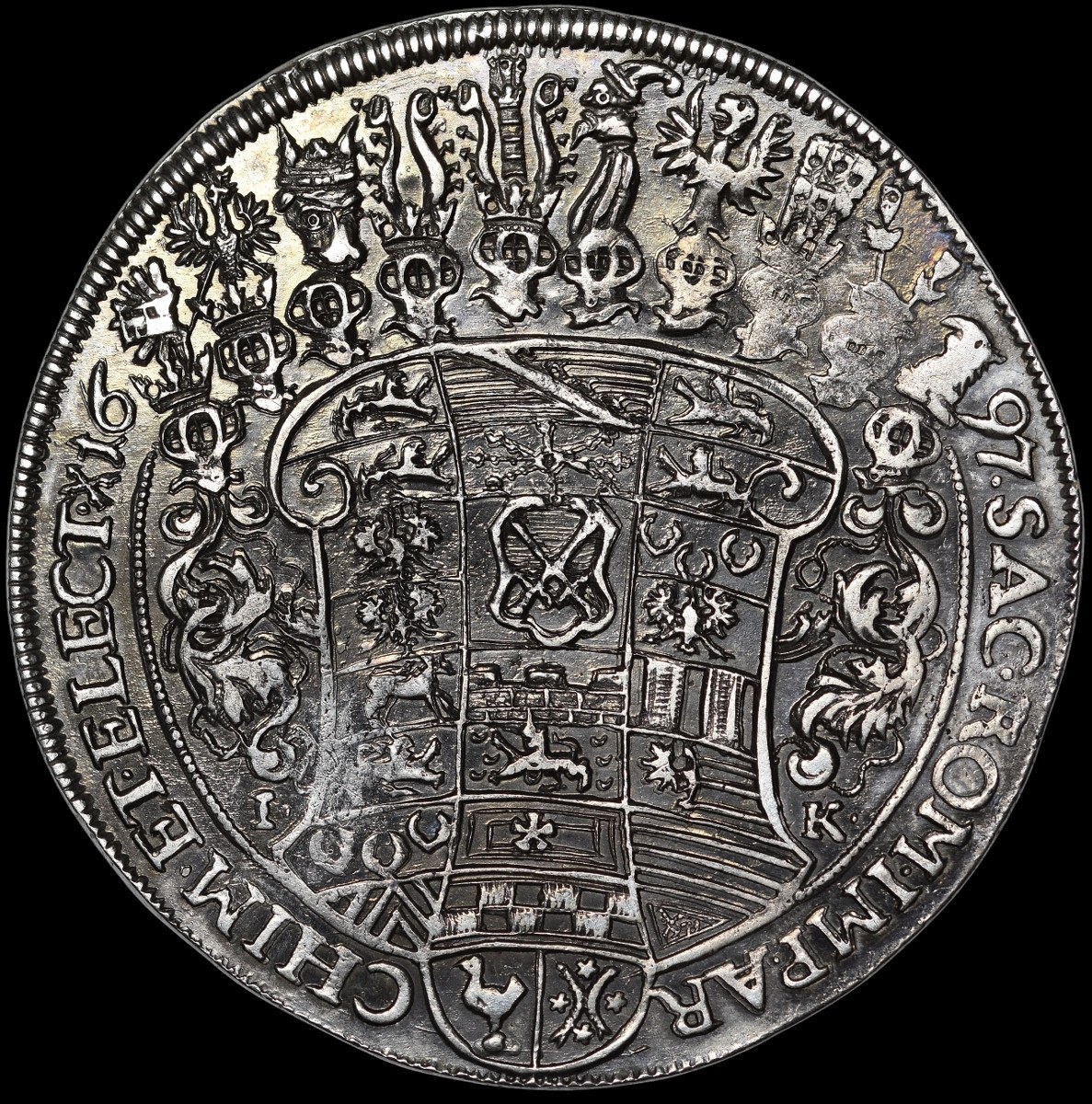 Wielopolowa tarcza herbowa. U dołu po bokach tarczy inicjały I – K (Johann