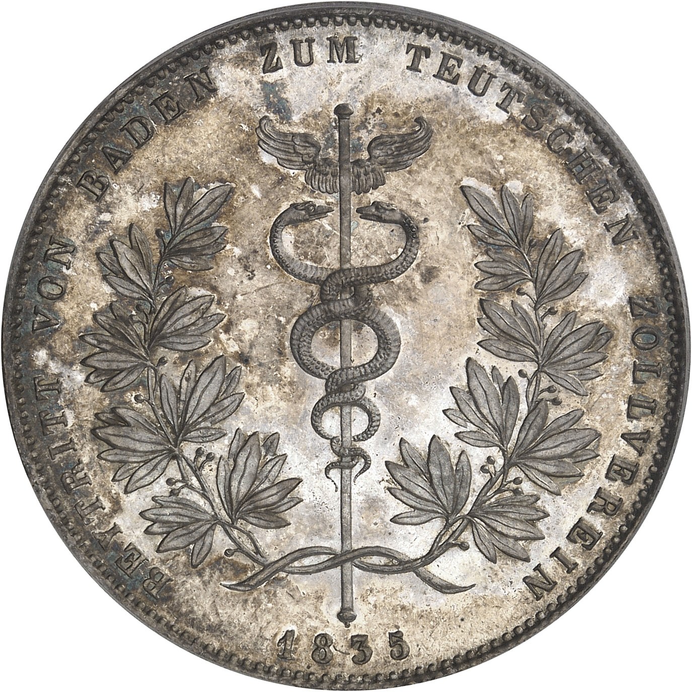 Rv. BEYTRITT VON BADEN ZUM TEUTSCHEN ZOLLVEREIN. Caducée entre deux branches de laurier ; à l’exergue (date).