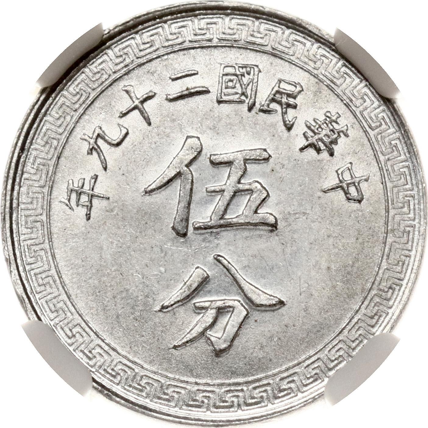 China. 5 Cents 29 (1940). Aluminium. Y 356. NGC MS 63.