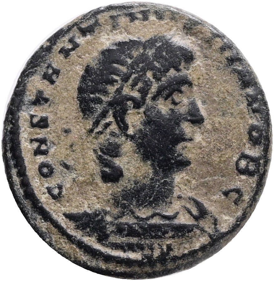 Constantinus II AD 337-340. Constantinople Follis Æ,Obv.: CONSTANTINVS IVN NOB C, laureate and cuirassed bust right,Rev.: GLORIA EXERCITVS, two helmeted soldiers standing facing each other, holding spear and shield, two standards between them, CONSΓ in exergue.Ref.: RIC 60. AE 2,5g.
