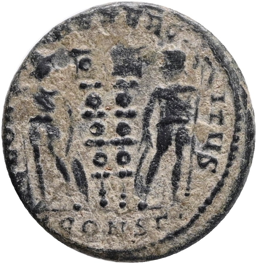 Constantinus II AD 337-340. Constantinople Follis Æ,Obv.: CONSTANTINVS IVN NOB C, laureate and cuirassed bust right,Rev.: GLORIA EXERCITVS, two helmeted soldiers standing facing each other, holding spear and shield, two standards between them, CONSΓ in ex