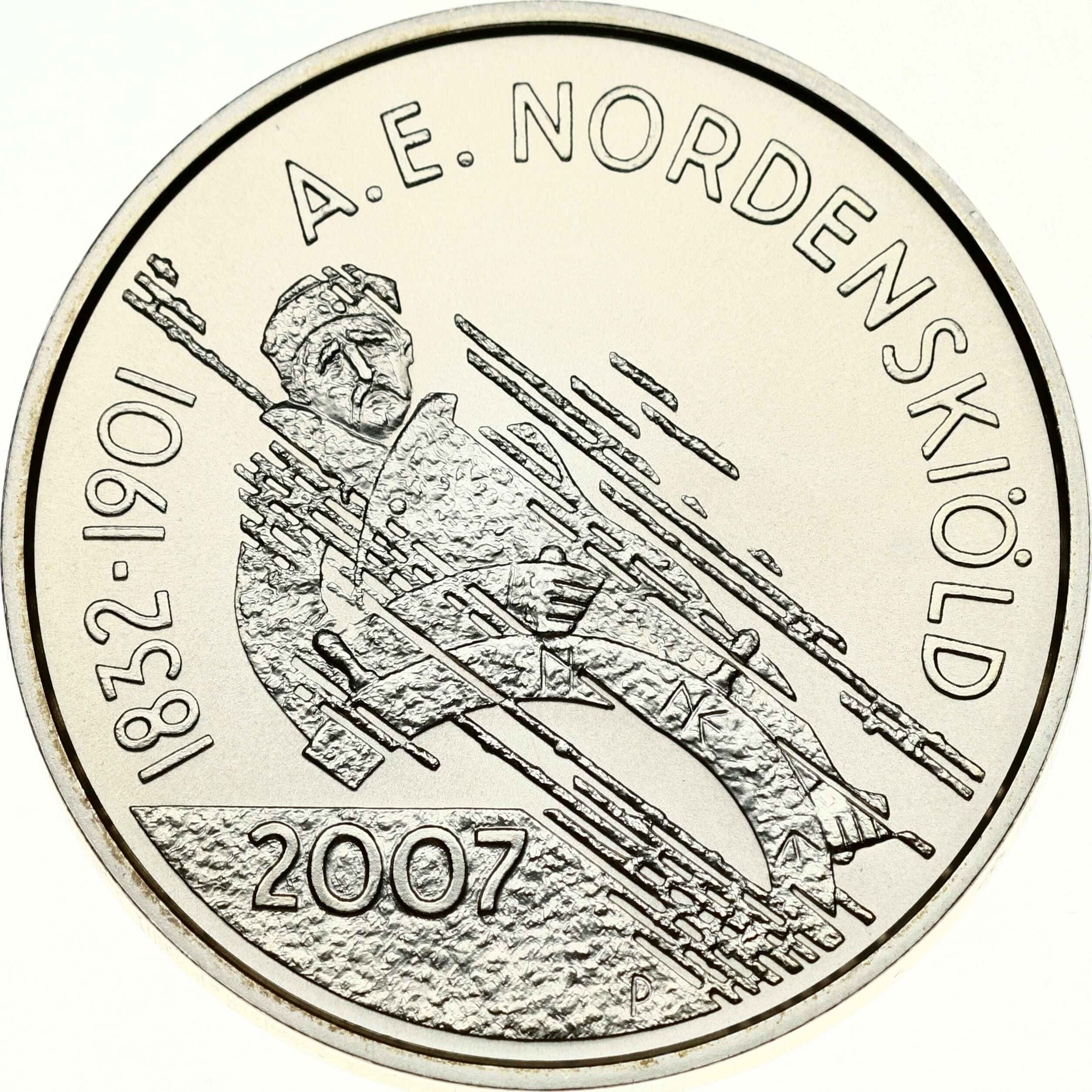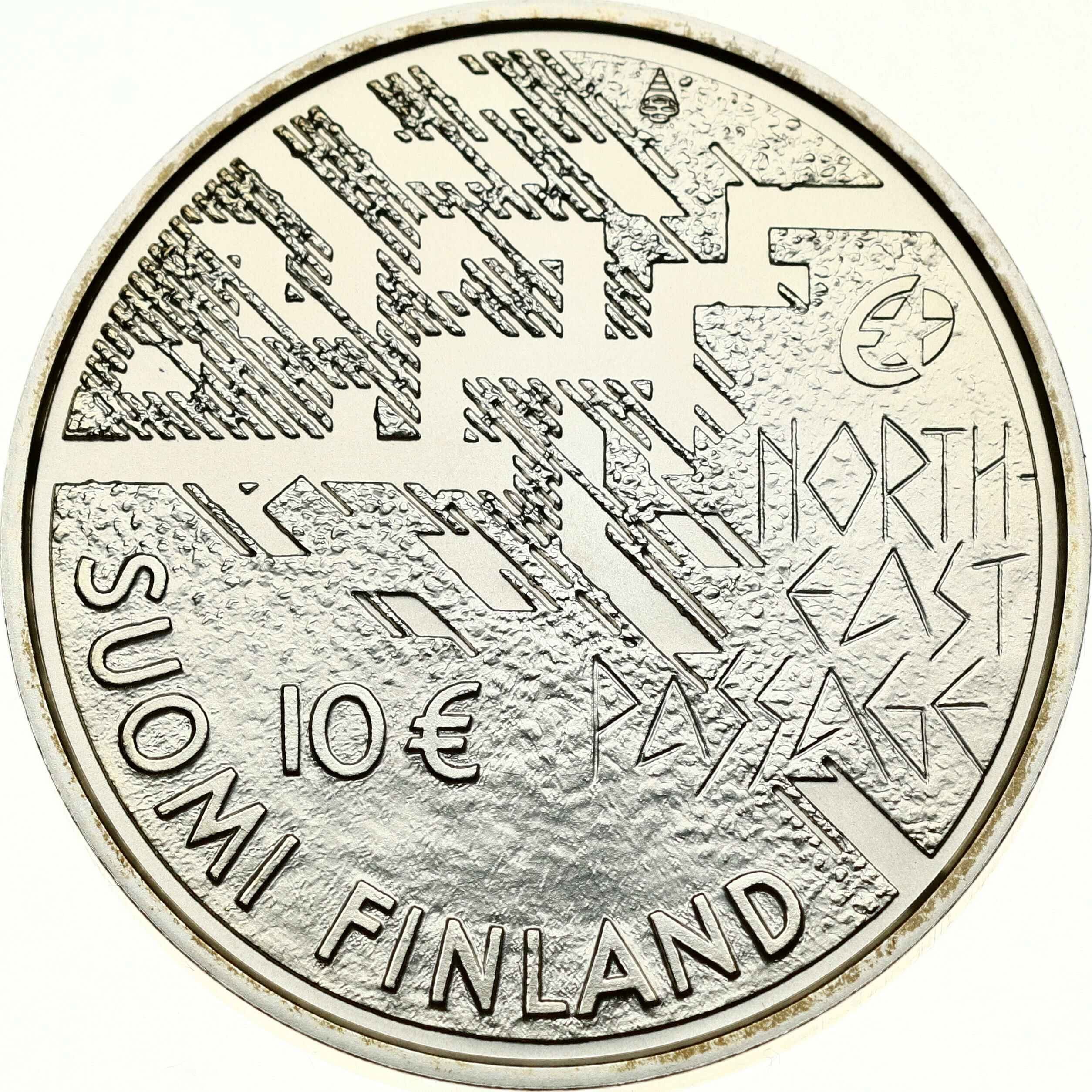 Finland 10 Euro 2007 175th Anniversary of A E Nordenskiold. Obverse Lettering: NORTH EAST PASSAGE 10 € SUOMI FINLAND. Reverse Lettering: A.E. NORDENSKIÖLD 1832-1901 2007. Edge Plain. Silver (.925) 25.50g. KM 134
