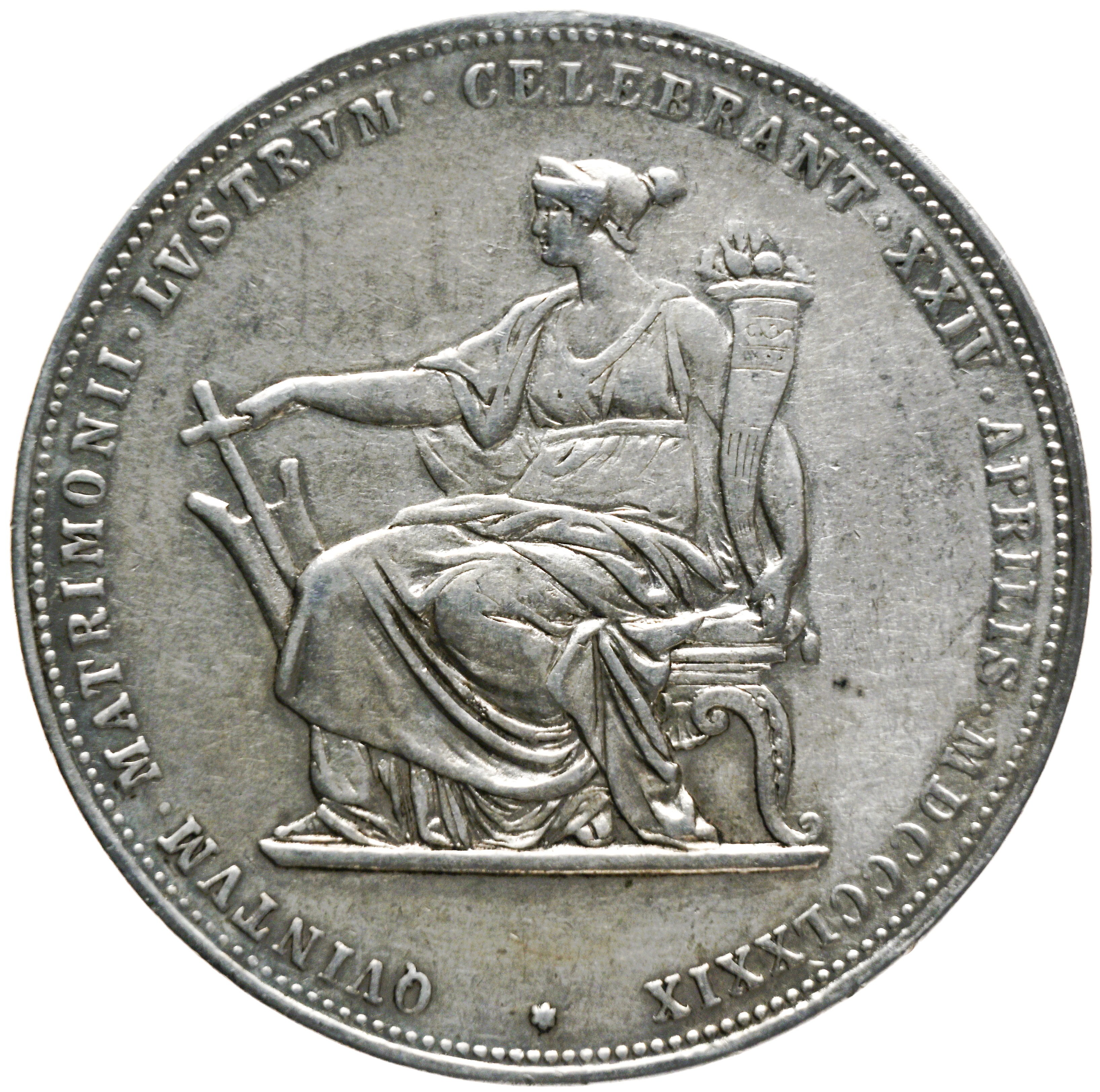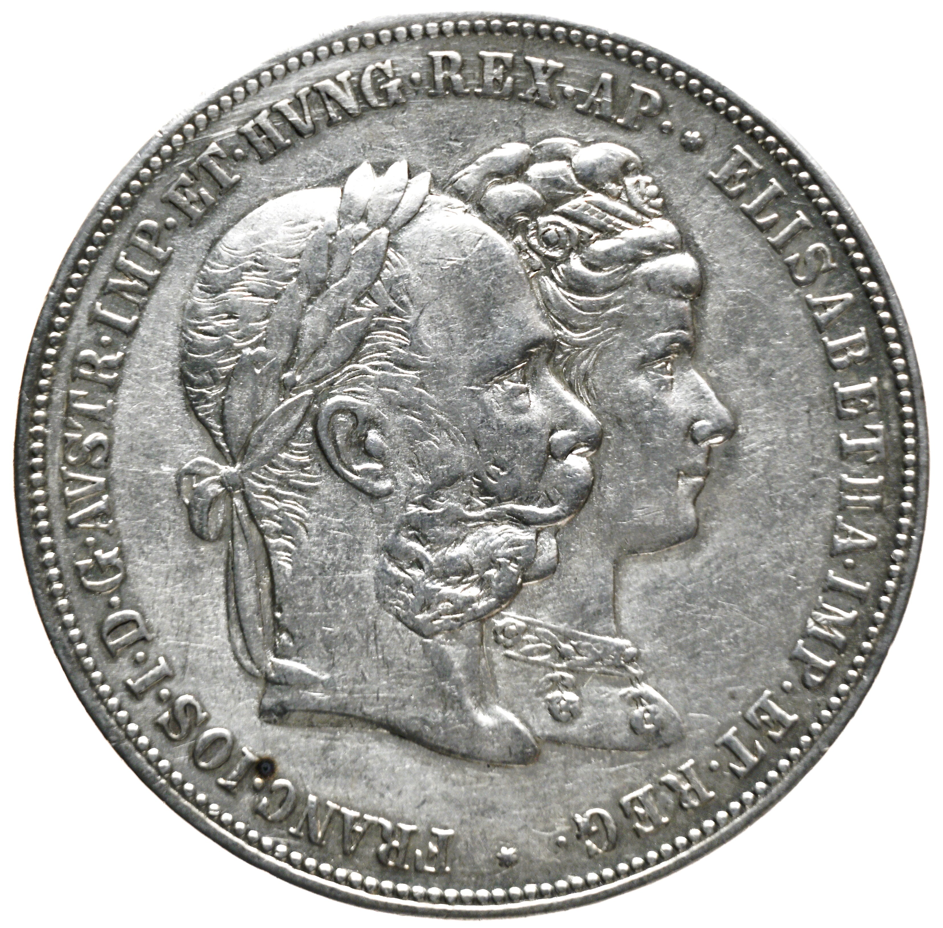 Ag, 900/1000, průměr 36 mm, váha 24,691 g, hrana hladká s nápisem ZWEI GULDEN. XLV.KÉT FORINT 1880