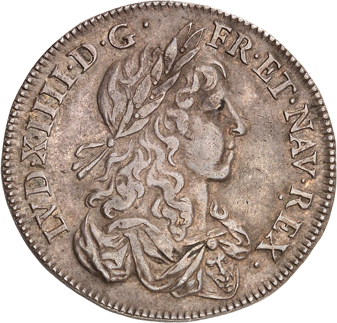 Av. LVD. XIIII. D. G. FR. ET. NAV. REX. Buste juvénile du Roi à droite, les cheveux longs, lauré, drapé et cuirassé à l’antique.