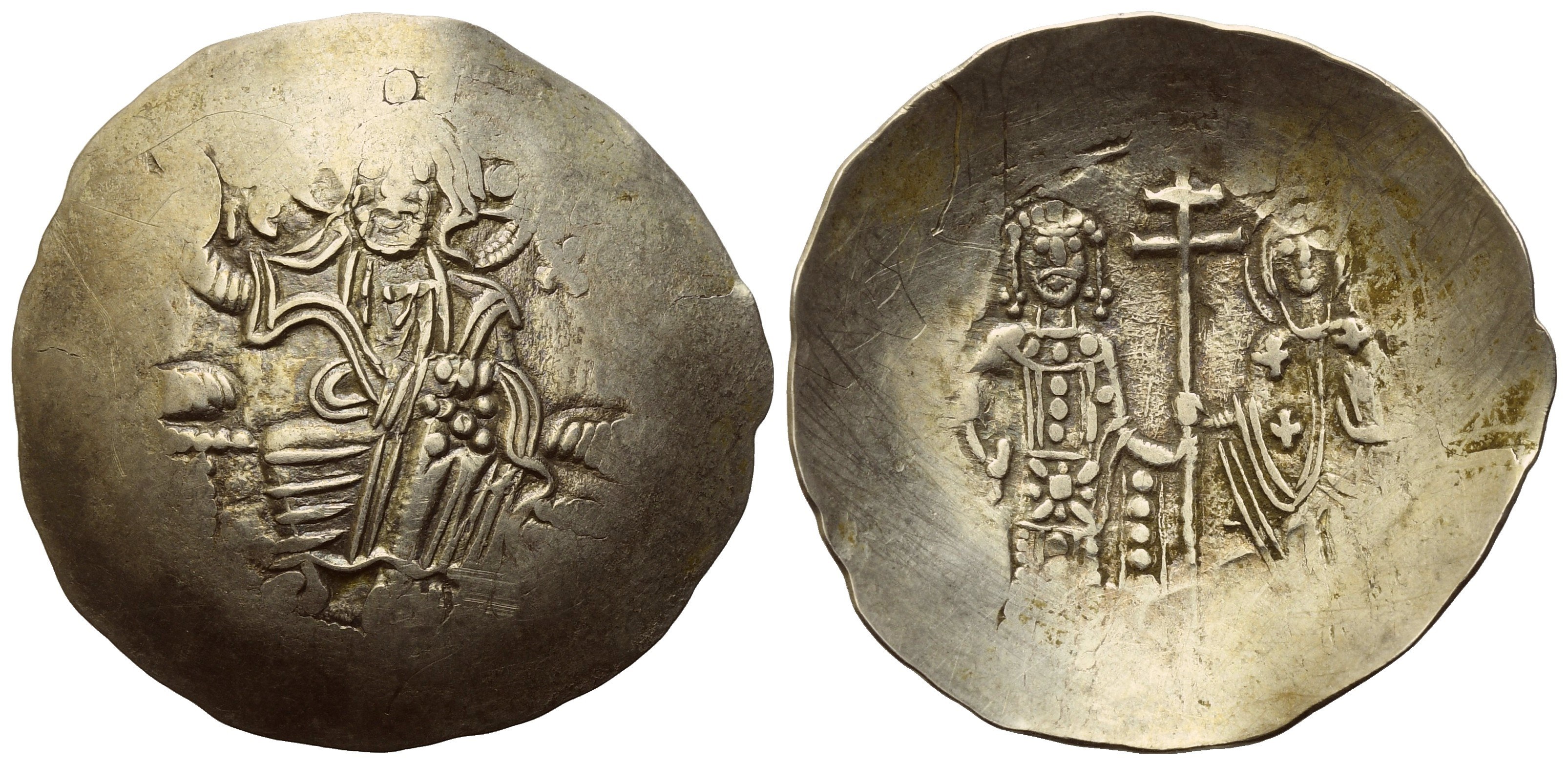 Christ Pantokrator enthroned facing;IC-XC st sides; Rv./ MANωHΛ ΔECΠOTH, Full length figures of Manuel and the Virgin Mary standing facing, holding patriarchal cross between them; M Θ by her head. DOC 3a. SB 1958. Good Very Fine.