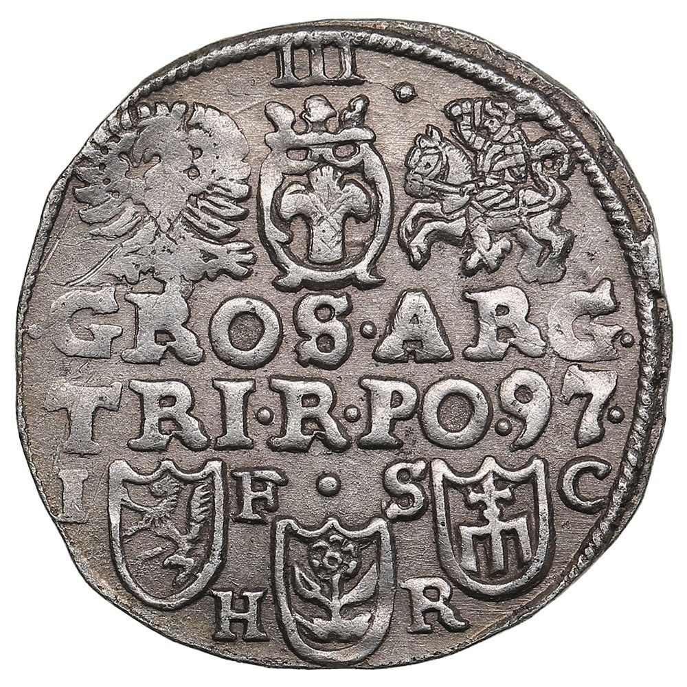 Rev.: Vasa arms between Polish and Lithuanian arms; above, III·; legend in two lines “·GROS·ARG· ·TRI·R·PO·97·”, arms of crown treasurer Jan Firley with initials I-F and arms of Stanislaw Cikowsky with initials S-C; below, arms of Herman Rüdiger with initials H-R.