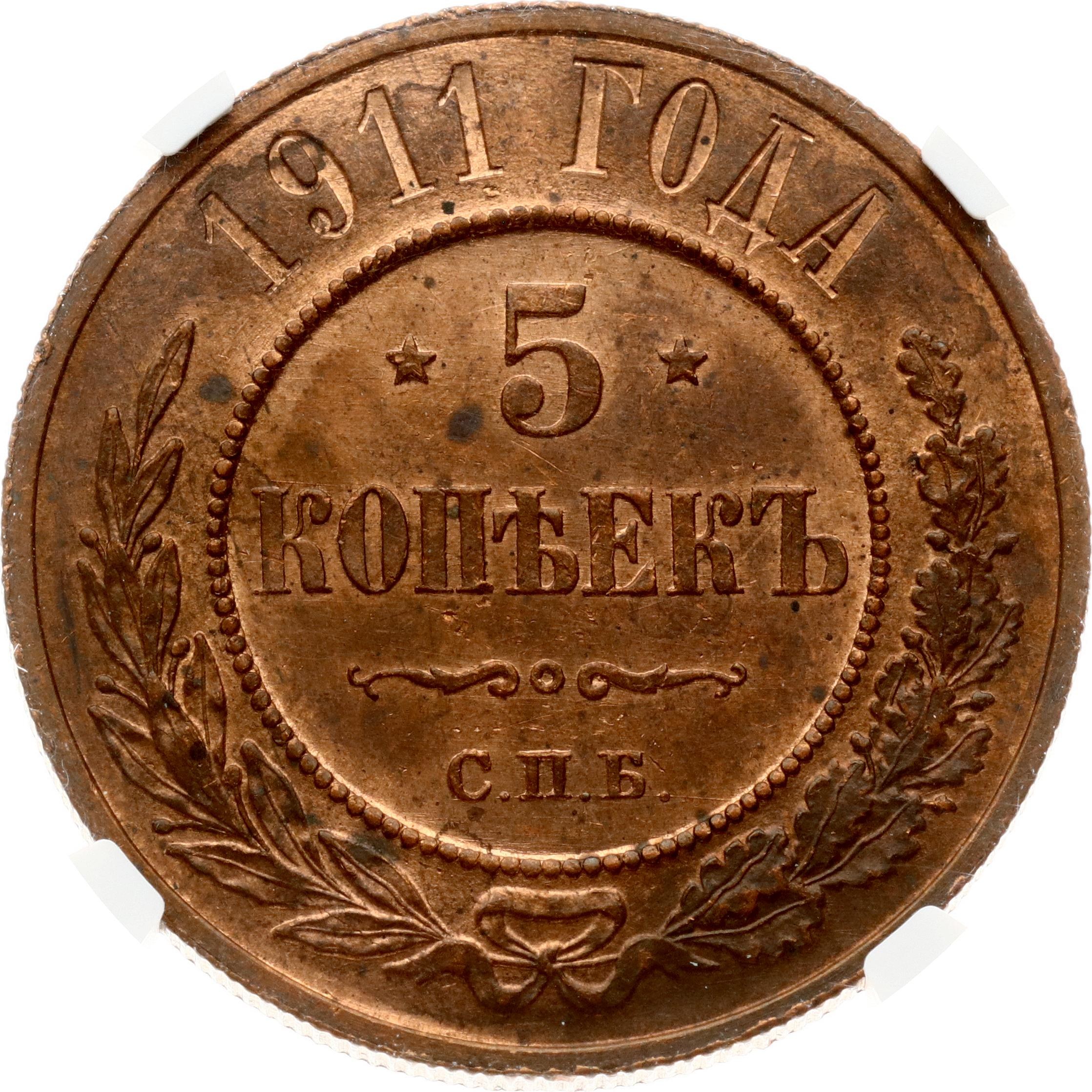 Russia. Nicholas II (1894-1917). 5 Kopecks 1911 ???, St. Petersburg. Copper. Bitkin 210. NGC MS 64 RB